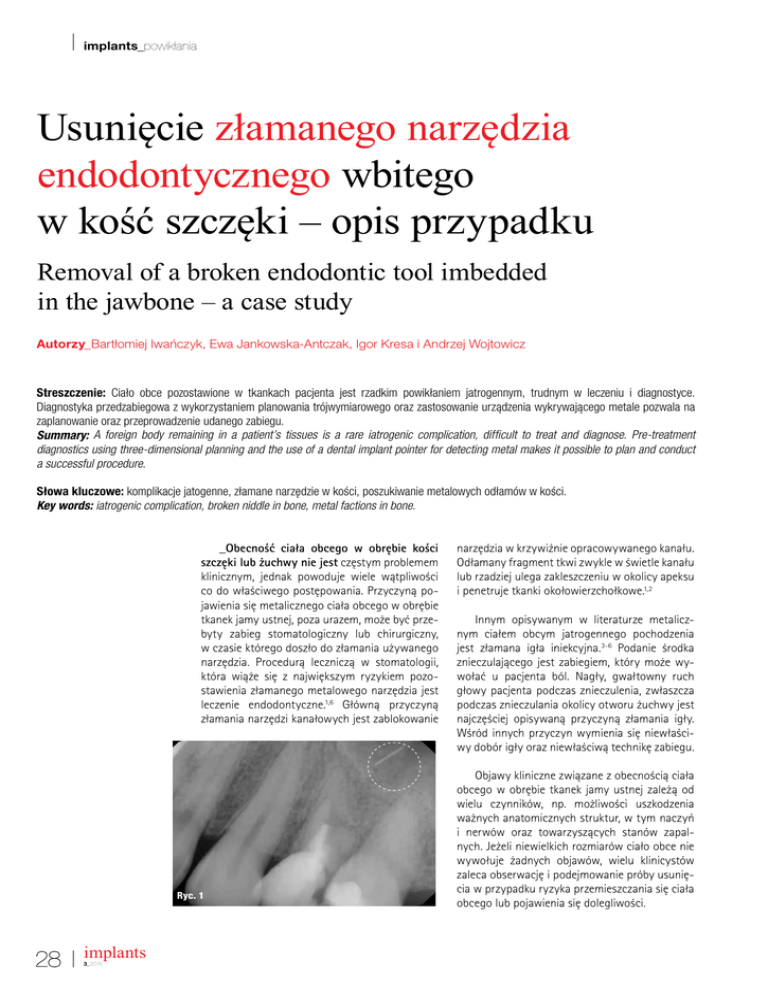 implants_powikłania Usunięciezłamanegonarzędzia endodontycznegowbitego wkośćszczęki–opisprzypadku Removalofabrokenendodontictoolimbedded inthejawbone–acasestudy Autorzy_Bartłomiej Iwańczyk, Ewa Jankowska-Antczak, Igor Kresa i Andrzej Wojtowicz Streszczenie: Ciało obce pozostawione w tkankach pacjenta jest rzadkim powikłaniem jatrogennym, trudnym w leczeniu i diagnostyce. Diagnostyka przedzabiegowa z wykorzystaniem planowania trójwymiarowego oraz zastosowanie urządzenia wykrywającego metale pozwala na zaplanowanie oraz przeprowadzenie udanego zabiegu. Summary: A foreign body remaining in a patient’s tissues is a rare iatrogenic complication, dificult to treat and diagnose. Pre-treatment diagnostics using three-dimensional planning and the use of a dental implant pointer for detecting metal makes it possible to plan and conduct a successful procedure. Słowa kluczowe: komplikacje jatogenne, złamane narzędzie w kości, poszukiwanie metalowych odłamów w kości. Key words: iatrogenic complication, broken niddle in bone, metal factions in bone. _Obecność ciała obcego w obrębie kości szczęki lub żuchwy nie jest częstym problemem klinicznym, jednak powoduje wiele wątpliwości co do właściwego postępowania. Przyczyną pojawienia się metalicznego ciała obcego w obrębie tkanek jamy ustnej, poza urazem, może być przebyty zabieg stomatologiczny lub chirurgiczny, w czasie którego doszło do złamania używanego narzędzia. Procedurą leczniczą w stomatologii, która wiąże się z największym ryzykiem pozostawienia złamanego metalowego narzędzia jest leczenie endodontyczne.1,6 Główną przyczyną złamania narzędzi kanałowych jest zablokowanie Ryc. 1 28 implants 3_2016 narzędzia w krzywiźnie opracowywanego kanału. Odłamany fragment tkwi zwykle w świetle kanału lub rzadziej ulega zakleszczeniu w okolicy apeksu i penetruje tkanki okołowierzchołkowe.1,2 Innym opisywanym w literaturze metalicznym ciałem obcym jatrogennego pochodzenia jest złamana igła iniekcyjna.3-6 Podanie środka znieczulającego jest zabiegiem, który może wywołać u pacjenta ból. Nagły, gwałtowny ruch głowy pacjenta podczas znieczulenia, zwłaszcza podczas znieczulania okolicy otworu żuchwy jest najczęściej opisywaną przyczyną złamania igły. Wśród innych przyczyn wymienia się niewłaściwy dobór igły oraz niewłaściwą technikę zabiegu. Objawy kliniczne związane z obecnością ciała obcego w obrębie tkanek jamy ustnej zależą od wielu czynników, np. możliwości uszkodzenia ważnych anatomicznych struktur, w tym naczyń i nerwów oraz towarzyszących stanów zapalnych. Jeżeli niewielkich rozmiarów ciało obce nie wywołuje żadnych objawów, wielu klinicystów zaleca obserwację i podejmowanie próby usunięcia w przypadku ryzyka przemieszczania się ciała obcego lub pojawienia się dolegliwości. implants_powikłania Planowanie zabiegu usunięcia złamanej igły wiąże się z koniecznością jak najdokładniejszej jej lokalizacji, co w przypadku odłamów niewielkich rozmiarów może być trudne. Zdjęcia radiologiczne zwykle uwidaczniają metalowe odłamy narządzi, ale dwuwymiarowy obraz nie daje pełnej odpowiedzi o ich umieszczeniu. Obrazowanie trójwymiarowe tkanek, za pomocą techniki CBCT stworzyło nowe możliwości dokładnej oceny lokalizacji ciała obcego i jego stosunku do innych struktur anatomicznych.4,6 W czasie planowania zabiegu usunięcia metalicznego ciała obcego pomocne może być urządzenie do detekcji metali, przeznaczone do oznaczenie punktu na błonie śluzowej, nad tkwiącym w kości metalowym elementem (np. implantem). Urządzenie działa na zasadzie generatora drgań Colpittsa.7 _Opis przypadku Ryc. 2 39-letnia pacjentka zgłosiła się do gabinetu dentystycznego z powodu złamania korony klinicznej zęba 24. Rutynowo wykonano badanie radiologiczne RVG techniką kąta prostego (Ryc. 1). Zdjęcie radiologiczne uwidoczniło dobrze kontrastujący cień rzutujący na światło zatoki szczękowej prawej ok. 1 mm od wierzchołka korzenia zęba 24. Powtórzono zdjęcie RVG w celu wykluczenia możliwego artefaktu. Ponowne zdjęcie potwierdziło obecność ciała obcego. Zalecono poszerzenie diagnostyki radiologicznej o CBCT wraz z opisem wykonanym przez radiologa. lat wcześniej. Pacjentka podała, że w czasie leczenia doszło do powikłania, po którym podjęta została interwencja chirurgiczna w okolicy zęba 24. Pacjentka nie była w stanie stwierdzić, jakie to było powikłanie. Z uzyskanego badania CBCT wynikało, że w okolicy zęba 24 znajduje się metaliczne ciało obce dł. 3,5 mm i średnicy ok. 1 mm, od wierzchołka korzeni 24 penetrujące przednią ścianę zatoki szczękowej, mogące odpowiadać zakończeniu igły lub narzędziu endodontycznemu (Ryc. 2). Biorąc pod uwagę lokalizację ciała obcego, postawiono hipotezę o złamanej igle iniekcyjnej do znieczuleń. Z wywiadu uzyskanego od pacjentki wynikało, że ząb 24 leczony był endodontycznie ok. 20 Pacjentka umówiona została na wizytę w celu usunięcia ciała obcego w Zakładzie Ryc. 3 implants 3_2016 29 implants_powikłania Ryc. 4 Ryc. 5 Chirurgii Stomatologicznej WUM. Zabieg zaplanowano z wykorzystaniem CBCT. W dniu zabiegu zastosowano poszerzenie diagnostyki w celu ustalenia przybliżonej lokalizacji ciała obcego. Diagnostyka obejmowała zastosowanie urządzenia do wykrywania implantów pod błoną śluzową. Wcześniej przetestowano urządzenie w celu ustalenie możliwości detekcji igły iniekcyjnej. Pacjentkę znieczulono 2% lignocainą z noradrenaliną. Zgodnie z instrukcją producenta, z zastosowaniem markera zaznaczono miejsce na błonie śluzowej, w obrębie którego powinno znajdować się ciało obce wg wskazań urządzenia (Ryc. 3). Wykonano nacięcie metodą Reinmollera, odwarstwiono płat śluzówkowo-okostnowy. Uwidoczniono metaliczny przedmiot tkwiący w kości szczęki. Zniesiono część blaszki kostnej wokół ciała obcego. Ciał