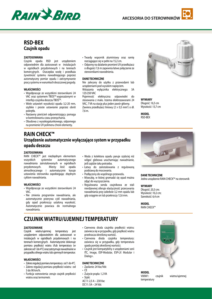 AKCESORIA DO STEROWNIKÓW RSD-BEx Czujnik opadu ZASTOSOWANIA Czujnik opadu RSD jest urządzeniem odpowiednim dla zastosowań w instalacjach w ogródkach przydomowych i na terenach komercyjnych. Oszczędza wodę i przedłuża żywotność systemu nawadniającego poprzez automatyczny pomiar opadu i zatrzymywanie pracy systemu w warunkach deszczowej pogody. WŁAŚCIWOŚCI • Współpracuje ze wszystkimi sterownikami 24 VAC oraz systemem TBOSTM wyposażonymi w interfejs czujnika deszczu TBOSTM. • Wiele ustawień wysokości opadu 3,2-20 mm, szybkie i proste ustawianie poprzez obrót pokrętła. • Nastawny pierścień odpowietrzający pomaga w kontrolowaniu czasu przesychania. • Obudowa z wysokogatunkowego, odpornego na promienie UV polimeru chroni elementy. • Twardy wspornik aluminiowy oraz ramię rozciągające się w pełni na 15,2 cm. • Odporny na działanie promieni UV przedłużacz o długości 7,6 m zapewnia łatwe połączenie ze sterownikami nawodnienia. DANE TECHNICZNE Nie zalecany do użytku z przewodami lub urządzeniami pod wysokim napięciem. Wskazania wyłącznika elektrycznego: 3A 125/250 VAC Pojemność elektryczna: odpowiedni do stosowania z maks. trzema elektrozaworami 24 VAC, 7 VA na stację plus jeden zawór główny. Zawiera przedłużacz liniowy (2 × 0,5 mm2) o dł. 7,6 m. WYMIARY Długość: 16,5 cm Wysokość: 13,7 cm MODEL RSD-BEX RAIN CHECK™ Urządzenie automatycznie wyłączające system w przypadku opadu deszczu ZASTOSOWANIA RAIN CHECKTM jest niezbędnym elementem wszystkich systemów automatycznego nawadniania zainstalowanych w ogródkach przydomowych. Mierzy ilość opadu atmosferycznego i automatycznie kasuje ustawienia sterownika zapobiegając zbędnym cyklom nawadniania. WŁAŚCIWOŚCI • Współpracuje ze wszystkimi sterownikami 24 VAC. • Nie zmienia programów nawadniania, ale automatycznie przerywa cykl nawadniania, gdy opad przekroczy ustaloną wysokość. Automatycznie powraca do normalnego nawadniania. • Woda z kolektora opadu paruje szybciej niż wilgoć glebowa uruchamiając nawadnianie, jeśli zajdzie taka potrzeba. • Łatwy do zainstalowania z regulowaną podstawą do mocowania. • Podłączony do wspólnego przewodu. • Miseczkę, w której gromadzi się opad można zdjąć do wyczyszczenia. • Regulowana sonda czujnikowa ze stali nierdzewnej oferuje elastyczność przerywania nawadniania przy zaledwie 3,2 mm opadu lub gdy osiągnie on lub przekroczy 12,6 mm. DANE TECHNICZNE Jedno urządzenie RAIN CHECKTM na sterownik WYMIARY Długość: 20,3 cm; Wysokość: 10,2 cm; Szerokość: 6,4 cm MODEL RAIN CHECK™ CZUJNIK WIATRU/UJEMNEJ TEMPERATURY ZASTOSOWANIE Czujnik wiatru/ujemnej temperatury jest urządzeniem odpowiednim dla zastosowań w instalacjach w ogródkach przydomowych i na terenach komercyjnych. Automatycznie dokonuje pomiaru prędkości wiatru i/lub temperatury (w zakresie od 1 do 4°C) oraz zatrzymuje nawadnianie w przypadku silnego wiatru lub ujemnych temperatur. WŁAŚCIWOŚCI • Zakres regulacji pomiaru temperatury : od 1 do 4°C. • Zakres regulacji pomiaru prędkości wiatru : od 3 do 90 km/h. • Funkcja wznowienia: zeruje czujnik prędkości wiatru oraz termometr. 106106 • Czerwona dioda czujnika prędkości wiatru: zaświeca się w przypadku, gdy prędkość wiatru przekracza określoną wartość. • Czerwona dioda czujnika temperatury: zaświeca się w przypadku, gdy temperatura spada poniżej określonej wartości. • Czujnik jest kompatybilny z urządzeniami serii ITC, Image, ESP-Modular, ESP-LX Modular i Dialog+. DANE TECHNICZNE • Zasilanie: 24 Vac/Vdc • CE • Zużycie prądu: 1,2 VA • Styki: AC11: 2,5 A – 230 Vac DC11: 5A – 24 Vdc MODEL V00W1: czujnik temperatury wiatru/ujemnej www.rainbird.eu