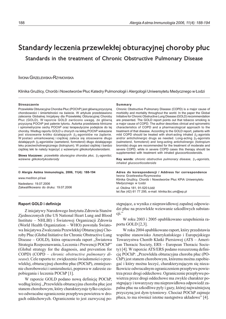 188 Alergia Astma Immunologia 2006, 11(4): 188-194 Standardy leczenia przewlek³ej obturacyjnej choroby p³uc Standards in the treatment of Chronic Obstructive Pulmonary Disease IWONA GRZELEWSKA-RZYMOWSKA Klinika Grulicy, Chorób i Nowotworów P³uc Katedry Pulmonologii i Alergologii Uniwersytetu Medycznego w £odzi Streszczenie Przewlek³a Obturacyjna Choroba P³uc (POChP) jest g³ówn¹ przyczyn¹ chorobowoci i miertelnoci na wiecie. W artykule przedstawiono zalecenia Globalnej Inicjatywy dla Przewlek³ej Obturacyjnej Choroby P³uc (GOLD). W raporcie GOLD zwrócono uwagê, ¿e g³ówn¹ przyczyn¹ POChP jest palenie tytoniu. Autorka przedstawia kliniczne i spirometryczne cechy POChP oraz terapeutyczne podejcie do tej choroby. Wed³ug raportu GOLD u chorych na lekk¹ POChP wskazane jest stosowanie krótko dzia³aj¹cych β 2-agonistów na ¿¹danie. W postaci umiarkowanej i ciê¿kiej zaleca siê stosowanie d³ugo dzia³aj¹cych β2-agonistów (sameterol, formoterol) d³ugo dzia³aj¹cego leku przeciwcholinergicznego (tiotropium). W postaci ciê¿kiej i bardzo ciê¿kiej leki te nale¿y kojarzyæ z wziewnymi glikokortykosteroidami. S³owa kluczowe: przewlek³a oburacyjna choroba p³uc, β2-agonici, wziewne glikokortykosteroidy © Alergia Astma Immunologia, 2006, 11(4): 188-194 www.mediton.pl/aai Nades³ano: 19.07.2006 Zakwalifikowano do druku: 19.07.2006 Raport GOLD i definicje Z inicjatywy Narodowego Instytutu Zdrowia Stanów Zjednoczonych (the US National Heart Lung and Blood Institute NHLBI) i wiatowej Organizacji Zdrowia (World Health Organization WHO) powsta³a wiatowa Inicjatywa Zwalczania Przewlek³ej Obturacyjnej Choroby P³uc (Global Initiative for Chronic Obstructive Lung Disease GOLD), która opracowa³a raport wiatowa Strategia Rozpoznawania, Leczenia i Prewencji POChP (Global strategy for the diagnosis, and prevention for COPD) (COPD chronic obstructive pulmonary disease). Cele raportu to: zwiêkszenie wiadomoci o przewlek³ej, obturacyjnej chorobie p³uc (POChP), zmniejszenie chorobowoci i umieralnoci, poprawa w zakresie zapobiegania i leczenia POChP [1]. W raporcie GOLD podano now¹ definicjê POChP, wed³ug której Przewlek³a obturacyjna choroba p³uc jest stanem chorobowym, który charakteryzuje tylko czêciowo odwracalne ograniczenie przep³ywu powietrza w drogach oddechowych. Ograniczenie to jest zazwyczaj po- Summary Chronic Obstructive Pulmonary Disease (COPD) is a major cause of morbidity and mortality throughout the world. In the paper the Global Initiative for Chronic Obstructive Lung Disease (GOLD) recommendation are presented. The GOLD report points out that tobacco smoking is a major cause of COPD. The author describes clinical and spirometric characteristics of COPD and a pharmacological approach to the treatment of that disease. According to the GOLD report, patients with mild COPD should be treated with short-acting inhaled β2-agonists and/or anticholinergic drugs as needed. Long-acting β2-agonists (salmeterol, formoterol) and long-acting anticholinergic (tiotropium bromide) drugs are recommended for the treatment of moderate and severe COPD, while in severe COPD cases this therapy should be supplemented with treatment with inhaled glucocorticosteroids. Key words: chronic obstructive pulmonary disease, β 2-agonists, inhaled glucocorticosteroids Adres do korespondencji / Address for correspondence Iwona Grzelewska-Rzymowska Klinika Grulicy, Chorób i Nowotworów P³uc KPiA Uniwersytetu Medycznego w £odzi ul. Okólna 181, 91-520 £ód tel./fax (42) 61 77 295, e-mail: [email protected] stêpuj¹ce, a wynika z nieprawid³owej zapalnej odpowiedzi p³uc na przewlek³e wziewanie szkodliwych substancji. W roku 2003 i 2005 opublikowano uzupe³nienia raportu GOLD [2,3]. W roku 2004 opublikowano raport, który przedstawia wspólne stanowisko Amerykañskiego i Europejskiego Towarzystwa Chorób Klatki Piersiowej (ATS American Thoracic Society, ERS European Thoracic Society) [4]. W raporcie ATS/ERS podano rozszerzon¹ definicjê POChP: Przewlek³a obturacyjna choroba p³uc (POChP) jest stanem chorobowym, któremu mo¿na zapobiegaæ i który mo¿na leczyæ, charakteryzuj¹cym siê nieca³kowicie odwracalnym ograniczeniem przep³ywu powietrza przez drogi oddechowe. Ograniczenie przep³ywu powietrza przez drogi oddechowe ma zwykle charakter postêpuj¹cy i towarzyszy mu nieprawid³owa odpowied zapalna p³uc na szkodliwe py³y i gazy, której najwa¿niejsz¹ przyczyn¹ jest dym tytoniowy. Chocia¿ POChP zajmuje p³uca, to ma równie¿ istotne nastêpstwa uk³adowe [4]. Grzelewska-Rzymowska I. Standardy leczenia przewlek³ej obturacyjnej choroby p³uc Epidemiologia POChP jest obecnie czwart¹ przyczyn¹ przewlek³ej chorobowoci i miertelnoci w wiecie, przy czym przewiduje siê, ¿e z powodu sta³ego wzrostu tych wskaników w roku 2020 choroba ta bêdzie ju¿ trzeci¹ przyczyn¹ zgonów. Najwiêcej informacji o chorobowoci i miertelnoci z powodu POChP pochodzi z krajów rozwiniêtych. W Wielkiej Brytanii w latach 1990-1997 stwierdzono wyrany wzrost zapadalnoci na tê chorobê. Wród kobiet wspó³czynnik zapadalnoci wzrós³ o 68,7% z 0,8 do 1,36/ 100 000, a wród mê¿czyzn o 23% z 1,35 do 1,7/100 000 [5]. W Stanach Zjednoczonych na POChP choruje ponad 15 mln ludzi [6]. Badania epidemiologiczne przeprowadzone w Polsce w latach 80. wykaza³y, ¿e POChP stwierdza siê u oko³o 8,5% mê¿czyzn i 4,9% kobiet [7]. Zgony z powodu POChP w wiecie wed³ug WHO dotycz¹ 2,9 mln osób, stanowi¹c pi¹t¹ przyczynê po chorobie niedokrwiennej serca, udarze mózgu, zaka¿eniach dolnych dróg oddechowych i grulicy. Umieralnoæ w Europie z powodu POChP wynosi 10-30/100 000 mieszkañców. miertelnoæ 5-letnia wród chorych na POChP jest wysoka i wynosi od 40 do 70% w zale¿noci od nasilenia choroby. W Stanach Zjednoczonych w latach 1965-1998 obserwowano a¿ 163% wzrost umieralnoci z powodu POChP, podczas gdy umieralnoæ z powodu choroby wieñcowej spad³a o 59%, z powodu udaru mózgu o 6