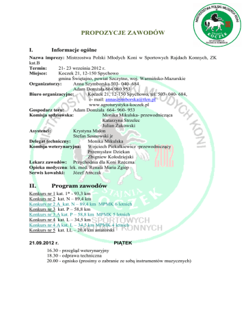 PROPOZYCJE ZAWODÓW I. Informacje ogólne Nazwa imprezy: Mistrzostwa Polski Młodych Koni w Sportowych Rajdach Konnych, ZK kat.B Termin: 21- 23 września 2012 r. Miejsce: Koczek 21, 12-150 Spychowo gmina Świętajno, powiat Szczytno, woj. Warmińsko-Mazurskie Organizatorzy: Anna Szymborska 503- 040- 684 Adam DomŜała 664 960 953 Biuro organizacyjne: Koczek 21, 12-150 Spychowo, tel. 503- 040- 684, e- mail: [email protected] www.agroturystyka-koczek.pl Gospodarz toru: Adam DomŜała 664- 960- 953 Komisja sędziowska: Monika Mikulska- przewodnicząca Katarzyna Strzelec Julian śukowski Asystenci: Krystyna Malon Stefan Sosnowski jr Delegat techniczny: Monika Mikulska Komisja weterynaryjna: Wojciech Piekałkiewicz -przewodniczący Przemysław Dziekan Zbigniew Kołodziejski Lekarz zawodów: Przychodnia dla Koni Rzeczna Opieka medyczna: lek. med. Renata Maria Zgiep Serwis kowalski: Józef Antczak II. Program zawodów Konkurs nr 1 kat. 1* - 93,3 km Konkurs nr 2 kat. N – 89,4 km Konkurs nr 2 A kat. N – 89,4 km MPMK 6 letnich Konkurs nr 3 kat. P – 58,8 km Konkurs nr 3 A kat. P – 58,8 km MPMK 5 letnich Konkurs nr 4 kat. L – 34,5 km Konkurs nr 4 A kat. L – 34,5 km MPMK 4 letnich Konkurs nr 5 kat. LL – 20,4 km amatorski 21.09.2012 r. PIĄTEK 16.30 - przegląd weterynaryjny 18.30 - odprawa techniczna 20.00 - ognisko (prosimy o zabranie ze sobą instrumentów muzycznych) 22.09.2012 r. SOBOTA 7.00 - konkurs nr 1 kat. 1*- dystans 93,3 km na czas (pętle: 24,3+10,2 km i 24,3+10,2 km i 24,3 km ) Bramki weterynaryjne: 34,5km – odpoczynek:30min 69km – odpoczynek:40min 93,3km – meta Zasady rozgrywania konkursu zgodne z regulaminem dyscypliny obowiązującym w dniu zawodów. 7.30 - konkurs nr 2 i 2A kat. N – dystans 89,2 km na normę czasu (pętle:24,3+ 10,2 km i 24,3+ 10,2 km i 10,2 km+10,2 km) Bramki weterynaryjne: 34,5 km – odpoczynek:30min 69 km – odpoczynek:40min 89,4 km – meta Zasady rozgrywania konkursu zgodne z regulaminem dyscypliny obowiązującym w dniu zawodów. 8.00 - konkurs nr 3 i 3A kat. P – dystans 58,8 km na normę czasu (pętle: 24,3+10,2 km i 24,3 km) Bramki weterynaryjne: 34,5 km – odpoczynek:40min 58,8 km – meta Zasady rozgrywania konkursu zgodne z regulaminem dyscypliny obowiązującym w dniu zawodów. 19.00 – ognisko 23.09.2012 r. NIEDZIELA 7.30- konkurs nr 4 i 4A kat. L – dystans 34,5 km na normę czasu (pętle: 24,3 km i 10,2 km) Bramka weterynaryjna na mecie. Zasady rozgrywania konkursu zgodne z regulaminem dyscypliny obowiązującym w dniu zawodów. 8.30 - konkurs nr 5 kat.LL – dystans 20,4 km na normę czasu (pętle:10,2 km+10,2 km) Bramka weterynaryjna na mecie. Wymagana dokumentacja od pary startującej w konkursie amatorskim: • Aktualne szczepienia przeciwko grypie koni • WaŜne zezwolenie lekarskie na start zawodnika • Pisemna zgoda rodziców na start, jeŜeli zawodnik jest niepełnoletni • Ubezpieczenie NNW przynajmniej na czas zawodów • Obowiązuje jeźdźców kask z atestem i strzemiona z koszyczkami Zasady rozgrywania konkursu zgodne z regulaminem dyscypliny obowiązującym w dniu zawodów. 13.00 – oficjalne zakończenie zawodów; dekoracja i wręczenie nagród III. Informacje o trasie Dwie pętle odpowiednio o długości 34,3 km i 10,2 km . PodłoŜe piaszczyste, trawiaste z korzeniami, szutrowe, 100 m asfaltu, przejazdy kolejowe, fragmenty dróg utwardzone otoczakami. RóŜnica wzniesień na pętli wynosi 20m. IV. Sprawy organizacyjne Głównymi sponsorami są: Na terenie stajni i przyległym stajniom (od „gardła’’ do pola serwisowego) obowiązuje zakaz palenia papierosów i poruszania się z otwartym ogniem pod groźbą kar finansowych i dyscyplinarnych do usunięcia z terenu zawodów włącznie. KONKURS WPISOWE (PŁATNE ZGŁOSZENIU) PRZY OPŁATA ANTYDOPINGOWA konkurs nr 1 – 93,3 km 185zł 15zł konkurs nr 2 i 2A – 89,2 km 180zł 15zł konkurs nr 3 i 3A – 58,8 km 180zł 15zł konkurs nr 4 i 4A – 34,5 km 180zł 15zł Konkurs nr 5 – 20,4 km 100zł 15zł Opłata startowego na miejscu, bezpośrednio po przybyciu. zgłoszenia po terminie 200 zł / koń Stajnie: boks ze słomą 120 zł na czas zawodów pasza dla koni (treściwa i objętościowa) we własnym zakresie (istnieje moŜliwość dokupienia siana) Stajnie będą otwarte od czwartku 20.09.2012, od godziny 7.00 Istnieje moŜliwość wcześniejszego przyjazdu z koniem - cena za boks 10 zł/ dzień. Zakwaterowanie: • na miejscu – pokoje 4-6 osobowe (łóŜko z materacem, bez pościeli, piętrowe) z dostępem do wspólnych łazienek 25 zł / łóŜko / noc (płatne za pokój). Liczba miejsc ograniczona. Decyduje kolejność zgłoszeń. • w pobliskich (3-5 km) ośrodkach: * Stanica Wodna PTTK „Wodan” Paweł Urbański (0-89) 742-01-14; 502 200 692 Zgon 46, 11-711 Nawiady Wiesława Kopacz: (0-89) 622- 50- 82 ul. Juranda 29, kierunek Mrągowo 12- 150 Spychowo „Leśny Zakatek” Spychowo- Bystrz 24 p. Jaskólscy (89) 622- 52- 91 604- 913- 705 • we własnych namiotach i przyczepach kempingowych (ustawienie płatne 20 zł/doba); bez dostępu do elektryczności • WyŜywienie: w kuchni gospodarstwa około 30 zł / dzień – śniadanie, obiad, kolacja. Posiłki nie będą kolidować z rozgrywanymi konkursami. Sklep znajduje się w Spychowie lub w Zgonie. Ostateczny termin zgłoszeń upływa dnia 12.09.2012 r. Zgłoszenia prosimy przesyłać na formularzach PZJ pocztą konwencjonalną lub e-mailem na adres biura organizacyjnego. Bardzo proszę o telefoniczne lub sms potwierdzenie wysłania zgłoszenia. V. Warunki techniczne Obowiązuje dokumentacja dla konia i zawodnika zgodna z przepisami Polskiego Związku Jeździeckiego. W konkursach 1, 2, 3, 4, mogą startować zawodnicy zarejestrowani w PZJ/WZJ i posiadający aktualną licencję sportową PZJ lub WZJ. Konie muszą posiadać aktualną licencję WZJ lub PZJ oraz Paszport PZJ lub PZHK. W konkursie nr 5mogą startować zawodnicy niezrzeszeni (bez licencji PZJ/WZJ)-obowiązuje posiadanie waŜnych 