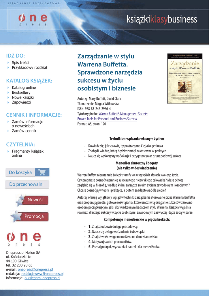 IDŹ DO: Spis treści Przykładowy rozdział KATALOG KSIĄŻEK: Katalog online Bestsellery Nowe książki Zapowiedzi CENNIK I INFORMACJE: Zamów informacje o nowościach Zamów cennik CZYTELNIA: Fragmenty książek online Do koszyka Do przechowalni Nowość Promocja Zarządzanie w stylu Warrena Buffetta. Sprawdzone narzędzia sukcesu w życiu osobistym i biznesie Autorzy: Mary Buffett, David Clark Tłumaczenie: Magda Witkowska ISBN: 978-83-246-2966-4 Tytuł oryginału: Warren Buffett’s Management Secrets: Proven Tools for Personal and Business Success Format: A5, stron: 120 Techniki zarządzania własnym życiem • Dowiedz się, jak sprawić, by postrzegano Cię jako geniusza • Zdobądź wiedzę, którą będziesz mógł zastosować w praktyce • Naucz się wykorzystywać okazje i przygotowywać grunt pod swój sukces Menedżer skuteczny i bogaty (nie tylko w doświadczenie) Warren Buffett nieustannie święci triumfy we wszystkich sferach swojego życia. Czy pragniesz poznać tajemnicę sukcesu tego niezwykłego człowieka? Masz ochotę zagłębić się w filozofię, według której zarządza swoim życiem zawodowym i osobistym? Chcesz poznać ją w teorii i praktyce, a potem zaadaptować dla siebie? Autorzy oferują wyjątkowy wgląd w techniki zarządzania stosowane przez Warrena Buffetta oraz proponują proste, gotowe rozwiązania, które umożliwią osiąganie sukcesów zarówno osobom początkującym, jak i doświadczonym badaczom stylu Warrena. Książka wyjaśnia również, dlaczego sukcesy w życiu osobistym i zawodowym zazwyczaj idą ze sobą w parze. Kompetencje menedżerskie w pięciu krokach: • • • • • Onepress.pl Helion SA ul. Kościuszki 1c 44-100 Gliwice tel. 32 230 98 63 e-mail: [email protected] redakcja: [email protected] informacje: o księgarni onepress.pl 1. Znajdź odpowiedniego pracodawcę. 2. Naucz się delegować zadania i obowiązki. 3. Znajdź właściwego menedżera na dane stanowisko. 4. Motywuj swoich pracowników. 5. Poznaj pułapki, wyzwania i nauczki dla menedżerów. SPIS TRECI Wprowadzenie 9 W skrócie 1. Znajd odpowiedni firm 2. Deleguj zadania i obowizki 3. Znajd menedera dysponujcego odpowiednimi cechami 4. Motywuj swoich pracowników 5. Aksjomaty menederskie na róne problemy 11 12 12 13 13 13 Krok pierwszy. Znajd sobie waciwego pracodawc 1. Jak znale firm zapewniajc najlepsze moliwoci rozwoju kariery zawodowej Firmy dysponujce trwa przewag konkurencyjn 17 18 2. Trzy szybkie testy, pozwalajce wskaza najlepsze firmy, w których warto pracowa 1. Zysk w przeliczeniu na jedn akcj 2. Zaduenie 3. Mara zysku brutto Podsumowanie 23 23 25 26 28 Krok drugi. Deleguj zadania 3. Zasady delegowania obowizków Zasada nr 1 Zasada nr 2 Zasada nr 3 Podsumowanie 31 32 32 33 33 Krok trzeci. Znajd waciwego menedera na dane stanowisko 4. Od czego Warren zaczyna poszukiwania waciwego menedera 37 5. Zwycizca czy ofiara? W jaki sposób Warren identyfikuje lidera grupy 41 6. Znajd prac, któr pokochasz 43 7. Stwórz skuteczny zespó sprzedaowy 45 8. Obsesja 47 9. Potga szczeroci 49 10. Kontroluj koszty 51 11. Koncentruj si na dugim okresie 53 12. Jak ustala poziom wynagrodze 57 Krok czwarty. Motywuj swoich pracowników 13. Zrób dobre pierwsze wraenie 61 14. Potga pochwa 63 15. Doskonaa reputacja Rada dla Bono 65 66 16. Ryzyko krytykowania Chwal konkretnych ludzi, ale krytykuj ogólnie Jeeli musisz skrytykowa kogo osobicie, najpierw go pochwal 69 70 72 17. Jak zwyciy w sporze Wpyw Benjamina Franklina 75 76 18. Odwouj si do potrzeb i pragnie drugiej osoby 79 19. Pomagaj innym wpa na waciwy pomys Zamiast wydawa bezporednie polecenia, zadawaj pytania 81 82 20. Wszyscy popeniamy bdy — przyznawaj si do nich 85 6 Krok pity. Puapki, wyzwania i nauczki dla menederów 21. Ukryte zagroenia zwizane z zarabianiem za poyczone pienidze 89 22. Czy dobre pomysy zawsze przynosz dobre rezultaty? 93 23. Jak postpowa z pracownikami, którzy ami prawo 95 24. Jak sobie radzi z wasnymi bdami 97 25. Pochlebcy — atut czy obcienie? 99 26. Wycigaj wnioski z niewykorzystanych okazji 101 27. Korzystaj z tego, co znane i sprawdzone 103 28. Pnij si w gór w yciu osobistym 105 29. Zarzdzanie „sob” jako sposób na inflacj 107 30. Poyczanie pienidzy w yciu osobistym 109 Na zako czenie 111 Sowniczek wybranych poj i spóek 113 7 ROZDZIA 4. OD CZEGO WARREN ZACZYNA POSZUKIWANIA WACIWEGO MENEDERA Zmiana menedera, podobnie jak zmiana maonka, jest bolesna, czasochonna i nieco przypadkowa. — Warren Buffett W nioski te Warren sformuowa na podstawie popenionych bdów. Konkretnie chodzio o nabywanie firm, które oferowano po okazyjnych cenach, ale które byy sabo zarzdzane. Jedna z jego pierwszych inwestycji w Dempster Mills Manufacturing, któr dokadniej omówimy sobie za chwil, stanowi doskonay przykad sytuacji, w której okazaa si konieczna kilkakrotna zmiana menedera, zanim udao si trafi na waciwego kandydata. Czy proces ten by bolesny? Owszem. Czy by czasochonny? Tak. Czy by kosztowny? Bardzo. Czy by konieczny? Zdecydowanie tak. Kluczem do wprowadzania wszelkich zmian w kadrze menederskiej jest pytanie, czy zmiany te s absolutnie konieczne. Jeeli odpowied na to pytanie brzmi „nie”, musielibymy chyba postrada zmysy, aby wprowadza do firmy kogo zupenie nowego. Jeli jednak przedsibiorstwo generuje straty, które naszym zdaniem nie maj zwizku z niekorzystnymi realiami ekonomicznymi, lecz z bdami w zarzdzaniu, zdecydowanie powinnimy zastanowi si nad zmian menedera. Warren stara si takich zmian unika. Kiedy ogasza (czy to za porednictwem bankierów inwestycyjnych, czy w dorocznym licie do akcjonariuszy Berkshire Hathaway) poszukiwania firm, które mógby kupi, zawsze podkrela, e przedsibiorstwo takie powinno znajdowa si w rkach kompetentnej kadry menederskiej. 37 Od najwaniejszych menederów wszystkich swoich spóek oczekuje zredagowania listu, z którego wynikaoby, kto przejby po nich sched, gdyby nastpnego dnia mieli umrze. Listy te podlegaj corocznej aktualizacji. W ten sposób gdyby kt