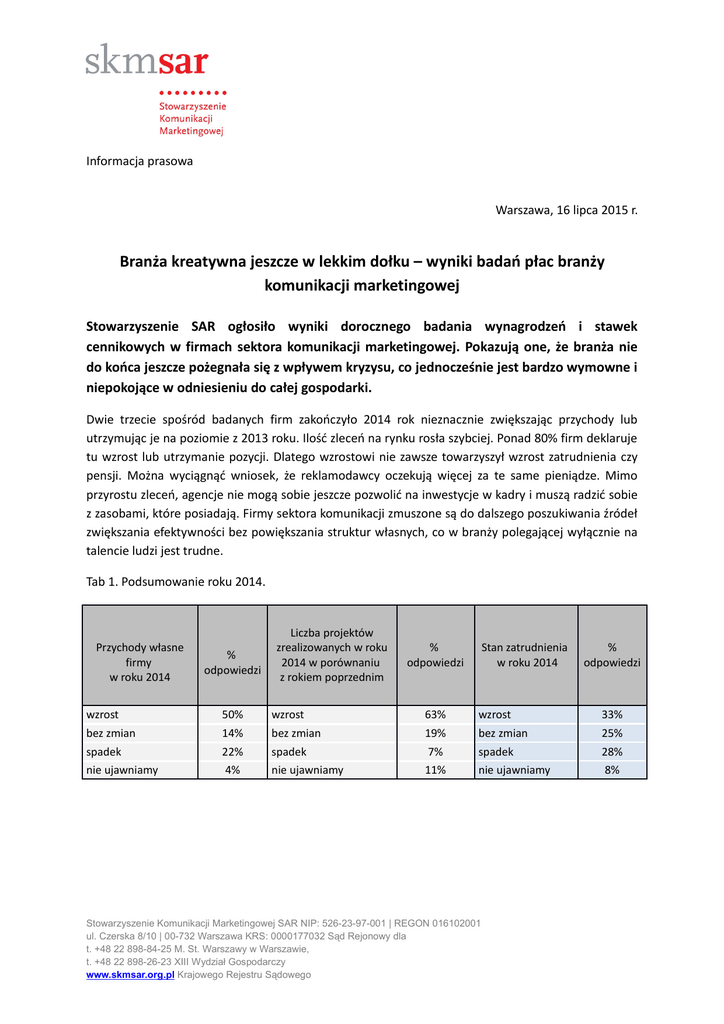 Informacja prasowa Warszawa, 16 lipca 2015 r. Branża kreatywna jeszcze w lekkim dołku – wyniki badań płac branży komunikacji marketingowej Stowarzyszenie SAR ogłosiło wyniki dorocznego badania wynagrodzeń i stawek cennikowych w firmach sektora komunikacji marketingowej. Pokazują one, że branża nie do końca jeszcze pożegnała się z wpływem kryzysu, co jednocześnie jest bardzo wymowne i niepokojące w odniesieniu do całej gospodarki. Dwie trzecie spośród badanych firm zakończyło 2014 rok nieznacznie zwiększając przychody lub utrzymując je na poziomie z 2013 roku. Ilość zleceń na rynku rosła szybciej. Ponad 80% firm deklaruje tu wzrost lub utrzymanie pozycji. Dlatego wzrostowi nie zawsze towarzyszył wzrost zatrudnienia czy pensji. Można wyciągnąć wniosek, że reklamodawcy oczekują więcej za te same pieniądze. Mimo przyrostu zleceń, agencje nie mogą sobie jeszcze pozwolić na inwestycje w kadry i muszą radzić sobie z zasobami, które posiadają. Firmy sektora komunikacji zmuszone są do dalszego poszukiwania źródeł zwiększania efektywności bez powiększania struktur własnych, co w branży polegającej wyłącznie na talencie ludzi jest trudne. Tab 1. Podsumowanie roku 2014. Przychody własne firmy w roku 2014 % odpowiedzi Liczba projektów zrealizowanych w roku 2014 w porównaniu z rokiem poprzednim % odpowiedzi Stan zatrudnienia w roku 2014 % odpowiedzi wzrost 50% wzrost 63% wzrost 33% bez zmian 14% bez zmian 19% bez zmian 25% spadek 22% spadek 7% spadek 28% nie ujawniamy 4% nie ujawniamy 11% nie ujawniamy 8% Stowarzyszenie Komunikacji Marketingowej SAR NIP: 526-23-97-001 | REGON 016102001 ul. Czerska 8/10 | 00-732 Warszawa KRS: 0000177032 Sąd Rejonowy dla t. +48 22 898-84-25 M. St. Warszawy w Warszawie, t. +48 22 898-26-23 XIII Wydział Gospodarczy www.skmsar.org.pl Krajowego Rejestru Sądowego Wstępne oceny 2015 roku również nie są optymistyczne – zdaniem większości uczestników badania wartość rynku reklamy ma zostać na podobnym poziomie, przy jednoczesnym spadku średnich stawek cennikowych (r/r) oraz stagnację w poziomach wynagrodzeń. Tab. 2. Prognozy na rok 2015 Prognoza dla całego polskiego rynku reklamy na rok 2015 % odpowiedzi Liczba projektów dla własnej firmy przewidywana w 2015 Stan zatrudnienia planowany w 2015 % odpowiedzi % odpowiedzi wzrost 33% wzrost 65% wzrost 50% bez zmian 67% bez zmian 12% bez zmian 33% spadek - spadek 4% spadek nie ujawniamy - nie ujawniamy 19% nie ujawniamy 17% - – Tegoroczna edycja badań płac i stawek godzinowych dobrze pokazuje co każdy zarządzający firmą marketingową czuje na co dzień – olbrzymią presję rynku by robić więcej projektów za te same lub mniejsze honoraria. Na dłuższą metę nie jest to dobre dla marek – jakość pracy branży zależy przecież od tego ile talentów uda nam się zgromadzić i zmotywować. Kondycja i sytuacja wśród agencji mówi wiele o polskiej gospodarce jako takiej. Widzimy, że większość reklamodawców nie inwestuje jeszcze tak chętnie w działania budujące marki, co świadczy o tym, że ich sytuacja finansowa cały czas nie jest w pełni optymalna. Obserwując trendy w gospodarce, zawsze warto zwrócić uwagę na kondycję branży reklamowej, gdyż w dużej mierze jest ona swoistym papierkiem lakmusowym dla kondycji sektora przedsiębiorstw – skomentował Szymon Gutkowski, Prezes Zarządu Stowarzyszenia SAR. Wynagrodzenia w branży komunikacji marketingowej W ramach badania wynagrodzeń SAR 2015 opracowano wycenę 143 różnych stanowisk. Sumarycznie, w agencjach reklamowych i mediowych zmiany w rynkowych poziomach wynagrodzeń mają charakter neutralny. W obu typach badanych firm, syntetyczne wskaźniki zmiany wynagrodzeń oscylują wokół wartości zerowej. Płace na konkretnych stanowiskach ulegają zmianie w obu kierunkach. Generalnie można jednakże mówić o ogólnej stagnacji płac na rynku komunikacji marketingowej. Prezentowane wartości przeciętnych wynagrodzeń są odpowiednikiem płacy gwarantowanej brutto (czyli jak wartość płacy zapisana w umowie – dla osób zatrudnionych na podstawie umowy o pracę i umów cywilnych. Dla osób wystawiających faktury – uwzględniono wartość faktury netto (bez VAT). Wynagrodzenie gwarantowane nie obejmuje składników zmiennych - takich jak premie. Stowarzyszenie Komunikacji Marketingowej SAR NIP: 526-23-97-001 | REGON 016102001 ul. Czerska 8/10 | 00-732 Warszawa KRS: 0000177032 Sąd Rejonowy dla t. +48 22 898-84-25 M. St. Warszawy w Warszawie, t. +48 22 898-26-23 XIII Wydział Gospodarczy www.skmsar.org.pl Krajowego Rejestru Sądowego Mediana wynagrodzenia gwarantowanego miesięcznie [PLN] Dane za rok 2015 Nazwa stanowiska PROJECT MANAGEMENT PROJECT TEAM LEADER PROJECT MANAGER PROJECT COORDINATOR PROJECT ASSISTANT 8 590 7 090 6 440 4 400 CREATIVE DEPARTAMENT CREATIVE DIRECTOR CREATIVE GROUP HEAD SENIOR COPYWRITER COPYWRITER JUNIOR COPYWRITER SENIOR ART DIRECTOR ART DIRECTOR JUNIOR ART DIRECTOR DTP OPERATOR SENIOR GRAPHIC DESIGNER GRAPHIC DESIGNER JUNIOR GRAPHIC DESIGNER SENIOR DTP OPERATOR DESIGN DIRECTOR CLIENT SERVICE DEPARTMENT 18 000 12 000 11 250 6 540 4 454 10 624 7 500 4 910 6 093 7 692 5 500 4 423 7 531 14 290 CLIENT SERVICE DIRECTOR GROUP ACCOUNT DIRECTOR ACCOUNT DIRECTOR ACCOUNT SUPERVISOR ACCOUNT MANAGER ACCOUNT EXECUTIVE ACCOUNT ASSISTANT SOCIAL MEDIA MANAGER SOCIAL MEDIA ACCOUNT EXECUTIVE 17 000 16 000 12 500 9 045 7 325 4 820 3 000 6 718 3 797 Stowarzyszenie Komunikacji Marketingowej SAR NIP: 526-23-97-001 | REGON 016102001 ul. Czerska 8/10 | 00-732 Warszawa KRS: 0000177032 Sąd Rejonowy dla t. +48 22 898-84-25 M. St. Warszawy w Warszawie, t. +48 22 898-26-23 XIII Wydział Gospodarczy www.skmsar.org.pl Krajowego Rejestru Sądowego Mediana wynagrodzenia gwarantowanego miesięcznie [PLN] Dane za rok 2015 Nazwa stanowiska EVENT MANAGEMENT ACCOUNT MANAGER ACCOUNT / PROJECT MANAGER EVENT MANAGER – Generalista PROJECT MANAGER ASSISTANT 9 000 7 290 6 044 