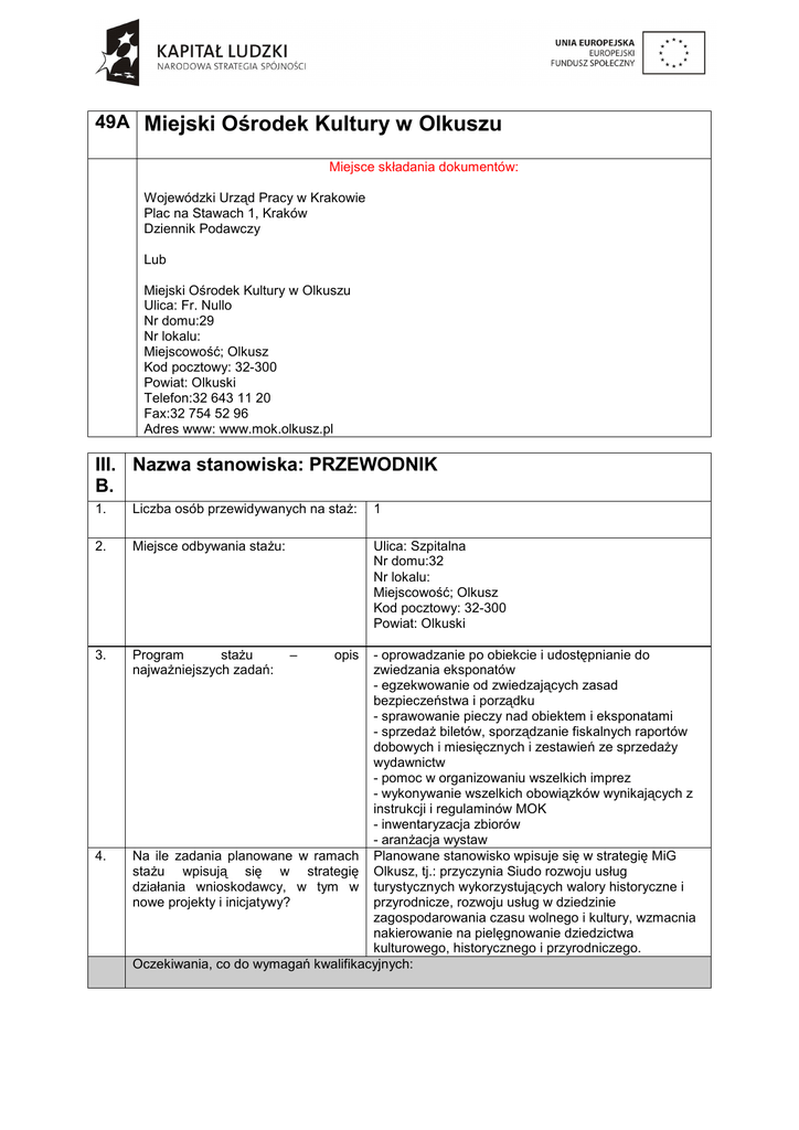 49A Miejski Ośrodek Kultury w Olkuszu Miejsce składania dokumentów: Wojewódzki Urząd Pracy w Krakowie Plac na Stawach 1, Kraków Dziennik Podawczy Lub Miejski Ośrodek Kultury w Olkuszu Ulica: Fr. Nullo Nr domu:29 Nr lokalu: Miejscowość; Olkusz Kod pocztowy: 32-300 Powiat: Olkuski Telefon:32 643 11 20 Fax:32 754 52 96 Adres www: www.mok.olkusz.pl III. Nazwa stanowiska: PRZEWODNIK B. 1. Liczba osób przewidywanych na staŜ: 1 2. Miejsce odbywania staŜu: Ulica: Szpitalna Nr domu:32 Nr lokalu: Miejscowość; Olkusz Kod pocztowy: 32-300 Powiat: Olkuski 3. Program staŜu najwaŜniejszych zadań: 4. – opis - oprowadzanie po obiekcie i udostępnianie do zwiedzania eksponatów - egzekwowanie od zwiedzających zasad bezpieczeństwa i porządku - sprawowanie pieczy nad obiektem i eksponatami - sprzedaŜ biletów, sporządzanie fiskalnych raportów dobowych i miesięcznych i zestawień ze sprzedaŜy wydawnictw - pomoc w organizowaniu wszelkich imprez - wykonywanie wszelkich obowiązków wynikających z instrukcji i regulaminów MOK - inwentaryzacja zbiorów - aranŜacja wystaw Na ile zadania planowane w ramach Planowane stanowisko wpisuje się w strategię MiG staŜu wpisują się w strategię Olkusz, tj.: przyczynia Siudo rozwoju usług działania wnioskodawcy, w tym w turystycznych wykorzystujących walory historyczne i przyrodnicze, rozwoju usług w dziedzinie nowe projekty i inicjatywy? zagospodarowania czasu wolnego i kultury, wzmacnia nakierowanie na pielęgnowanie dziedzictwa kulturowego, historycznego i przyrodniczego. Oczekiwania, co do wymagań kwalifikacyjnych: 5. Wykształcenie: Niezbędne: Średnie 6. Doświadczenie zawodowe: Niezbędne: ------------- 7. Umiejętności: 8. Cechy osobowe: Niezbędne: poprawne wysławianie się, znajomość j. angielskiego na poziomie komunikatywnym Niezbędne: rzetelność komunikatywność elastyczność 9. Oferta jest kierowana równieŜ do osób z niepełnosprawnością Tak PoŜądane: WyŜsze (np. etnograficzne, historyczne, geograficzne, plastyczne) PoŜądane: Kurs przewodnika, obsługa kasy fiskalnej PoŜądane: Umiejętności interpersonalne PoŜądane: kreatywność X Nie Wstępne wymagania dotyczące sprawności kandydata (np. stopień sprawności fizycznej, intelektualnej, wzroku, słuchu, odporność na stres itp.) 10. Umiejętności, które osoba nabędzie w ramach staŜu: Marketing obiektu historycznego, umiejętności przewodnickie, obsługa kasy fiskalnej, umiejętność pracy w zespole. 11. Sposób wprowadzenia osoby (szkolenia wewnętrzne, instruktaŜe), w tym informacje o opiekunie staŜu (imię, nazwisko, funkcja): InstruktaŜ wewnętrzny, szkolenia zewnętrzne, konsultacje pracownicze, kurs obsługi kasy fiskalnej i monitoringu obiektu 12. Sposób nadzoru/ monitorowania wykonywania zadań: 13. Sposób organizacji staŜu – czas , np. Czy stanowisko wymaga dyspozycyjności w soboty/ niedzielę/ święta? Nadzór opiekunów staŜu, kierownik działu muzealnowystawienniczego, kierownik działu technicznego, kontrola oprowadzeń, ankietowanie staŜysty i zwiedzających, rozmowy konsultacyjne i podsumowujące Stanowisko związane jest z tzw. Przemysłem czasu wolnego, w związku z tym konieczne są dyŜury w weekendy i święta przy zachowaniu 40 godzinnego tygodnia pracy przy 2-tygodniowym okresie rozliczeniowym. 14. Czy istnieje moŜliwość zatrudnienia przez Wnioskodawcę po odbyciu staŜu? W stosunku do ilu osób przewidzianych niniejszą ofertą Wnioskodawca deklaruje moŜliwość zatrudnienia. X Tak Liczba osób: 1 Nie 15. Dodatkowe informacje, które mogą być istotne przy ocenie oferty: Zatrudnienie będzie kontynuowane na czas jednego roku.