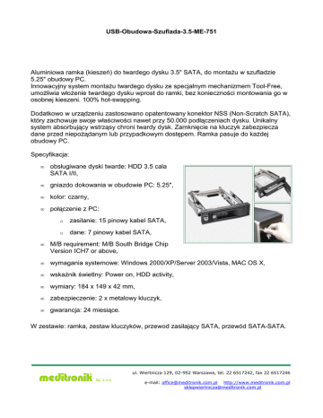 USB-Obudowa-Szuflada-3.5-ME-751 Aluminiowa ramka (kieszeń) do twardego dysku 3.5" SATA, do montaŜu w szufladzie 5.25" obudowy PC. Innowacyjny system montaŜu twardego dysku ze specjalnym mechanizmem Tool-Free, umoŜliwia włoŜenie twardego dysku wprost do ramki, bez konieczności montowania go w osobnej kieszeni. 100% hot-swapping. Dodatkowo w urządzeniu zastosowano opatentowany konektor NSS (Non-Scratch SATA), który zachowuje swoje właściwości nawet przy 50.000 podłączeniach dysku. Unikalny system absorbujący wstrząsy chroni twardy dysk. Zamknięcie na kluczyk zabezpiecza dane przed niepoŜądanym lub przypadkowym dostępem. Ramka pasuje do kaŜdej obudowy PC. Specyfikacja: • obsługiwane dyski twarde: HDD 3.5 cala SATA I/II, • gniazdo dokowania w obudowie PC: 5.25", • kolor: czarny, • połączenie z PC: o zasilanie: 15 pinowy kabel SATA, o dane: 7 pinowy kabel SATA, • M/B requirement: M/B South Bridge Chip Version ICH7 or above, • wymagania systemowe: Windows 2000/XP/Server 2003/Vista, MAC OS X, • wskaźnik świetlny: Power on, HDD activity, • wymiary: 184 x 149 x 42 mm, • zabezpieczenie: 2 x metalowy kluczyk, • gwarancja: 24 miesiące. W zestawie: ramka, zestaw kluczyków, przewod zasilający SATA, przewód SATA-SATA. ul. Wiertnicza 129, 02-952 Warszawa, tel. 22 6517242, fax 22 6517246 e-mail: [email protected] http://www.meditronik.com.pl [email protected]