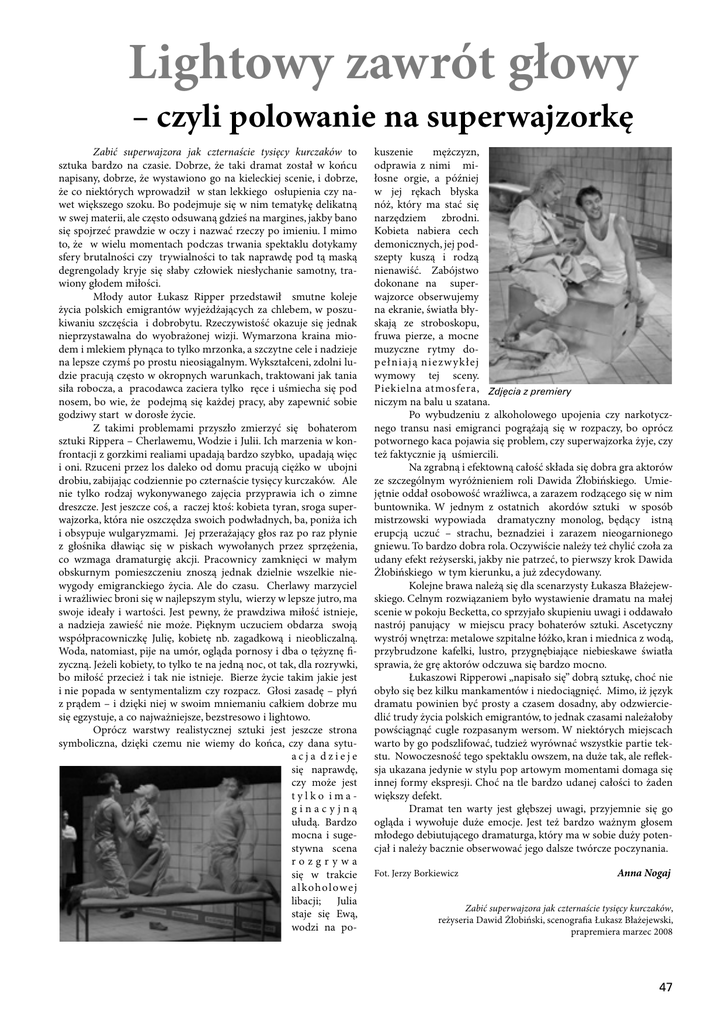Lightowy zawrót głowy – czyli polowanie na superwajzorkę Zabić superwajzora jak czternaście tysięcy kurczaków to sztuka bardzo na czasie. Dobrze, że taki dramat został w końcu napisany, dobrze, że wystawiono go na kieleckiej scenie, i dobrze, że co niektórych wprowadził w stan lekkiego osłupienia czy nawet większego szoku. Bo podejmuje się w nim tematykę delikatną w swej materii, ale często odsuwaną gdzieś na margines, jakby bano się spojrzeć prawdzie w oczy i nazwać rzeczy po imieniu. I mimo to, że w wielu momentach podczas trwania spektaklu dotykamy sfery brutalności czy trywialności to tak naprawdę pod tą maską degrengolady kryje się słaby człowiek niesłychanie samotny, trawiony głodem miłości. Młody autor Łukasz Ripper przedstawił smutne koleje życia polskich emigrantów wyjeżdżających za chlebem, w poszukiwaniu szczęścia i dobrobytu. Rzeczywistość okazuje się jednak nieprzystawalna do wyobrażonej wizji. Wymarzona kraina miodem i mlekiem płynąca to tylko mrzonka, a szczytne cele i nadzieje na lepsze czymś po prostu nieosiągalnym. Wykształceni, zdolni ludzie pracują często w okropnych warunkach, traktowani jak tania siła robocza, a pracodawca zaciera tylko ręce i uśmiecha się pod nosem, bo wie, że podejmą się każdej pracy, aby zapewnić sobie godziwy start w dorosłe życie. Z takimi problemami przyszło zmierzyć się bohaterom sztuki Rippera – Cherlawemu, Wodzie i Julii. Ich marzenia w konfrontacji z gorzkimi realiami upadają bardzo szybko, upadają więc i oni. Rzuceni przez los daleko od domu pracują ciężko w ubojni drobiu, zabijając codziennie po czternaście tysięcy kurczaków. Ale nie tylko rodzaj wykonywanego zajęcia przyprawia ich o zimne dreszcze. Jest jeszcze coś, a raczej ktoś: kobieta tyran, sroga superwajzorka, która nie oszczędza swoich podwładnych, ba, poniża ich i obsypuje wulgaryzmami. Jej przerażający głos raz po raz płynie z głośnika dławiąc się w piskach wywołanych przez sprzężenia, co wzmaga dramaturgię akcji. Pracownicy zamknięci w małym obskurnym pomieszczeniu znoszą jednak dzielnie wszelkie niewygody emigranckiego życia. Ale do czasu. Cherlawy marzyciel i wrażliwiec broni się w najlepszym stylu, wierzy w lepsze jutro, ma swoje ideały i wartości. Jest pewny, że prawdziwa miłość istnieje, a nadzieja zawieść nie może. Pięknym uczuciem obdarza swoją współpracowniczkę Julię, kobietę nb. zagadkową i nieobliczalną. Woda, natomiast, pije na umór, ogląda pornosy i dba o tężyznę fizyczną. Jeżeli kobiety, to tylko te na jedną noc, ot tak, dla rozrywki, bo miłość przecież i tak nie istnieje. Bierze życie takim jakie jest i nie popada w sentymentalizm czy rozpacz. Głosi zasadę – płyń z prądem – i dzięki niej w swoim mniemaniu całkiem dobrze mu się egzystuje, a co najważniejsze, bezstresowo i lightowo. Oprócz warstwy realistycznej sztuki jest jeszcze strona symboliczna, dzięki czemu nie wiemy do końca, czy dana sytuacja dzieje się naprawdę, czy może jest tylko imaginacyjną ułudą. Bardzo mocna i sugestywna scena rozgrywa się w trakcie a l kohol owe j libacji; Julia staje się Ewą, wodzi na po- kuszenie mężczyzn, odprawia z nimi miłosne orgie, a później w jej rękach błyska nóż, który ma stać się narzędziem zbrodni. Kobieta nabiera cech demonicznych, jej podszepty kuszą i rodzą nienawiść. Zabójstwo dokonane na superwajzorce obserwujemy na ekranie, światła błyskają ze stroboskopu, fruwa pierze, a mocne muzyczne rytmy dop ełniaj ą nie zw y kłej wymowy tej sceny. Piekielna atmosfera, Zdjęcia z premiery niczym na balu u szatana. Po wybudzeniu z alkoholowego upojenia czy narkotycznego transu nasi emigranci pogrążają się w rozpaczy, bo oprócz potwornego kaca pojawia się problem, czy superwajzorka żyje, czy też faktycznie ją uśmiercili. Na zgrabną i efektowną całość składa się dobra gra aktorów ze szczególnym wyróżnieniem roli Dawida Żłobińskiego. Umiejętnie oddał osobowość wrażliwca, a zarazem rodzącego się w nim buntownika. W jednym z ostatnich akordów sztuki w sposób mistrzowski wypowiada dramatyczny monolog, będący istną erupcją uczuć – strachu, beznadziei i zarazem nieogarnionego gniewu. To bardzo dobra rola. Oczywiście należy też chylić czoła za udany efekt reżyserski, jakby nie patrzeć, to pierwszy krok Dawida Żłobińskiego w tym kierunku, a już zdecydowany. Kolejne brawa należą się dla scenarzysty Łukasza Błażejewskiego. Celnym rozwiązaniem było wystawienie dramatu na małej scenie w pokoju Becketta, co sprzyjało skupieniu uwagi i oddawało nastrój panujący w miejscu pracy bohaterów sztuki. Ascetyczny wystrój wnętrza: metalowe szpitalne łóżko, kran i miednica z wodą, przybrudzone kafelki, lustro, przygnębiające niebieskawe światła sprawia, że grę aktorów odczuwa się bardzo mocno. Łukaszowi Ripperowi „napisało się” dobrą sztukę, choć nie obyło się bez kilku mankamentów i niedociągnięć. Mimo, iż język dramatu powinien być prosty a czasem dosadny, aby odzwierciedlić trudy życia polskich emigrantów, to jednak czasami należałoby powściągnąć cugle rozpasanym wersom. W niektórych miejscach warto by go podszlifować, tudzież wyrównać wszystkie partie tekstu. Nowoczesność tego spektaklu owszem, na duże tak, ale refleksja ukazana jedynie w stylu pop artowym momentami domaga się innej formy ekspresji. Choć na tle bardzo udanej całości to żaden większy defekt. Dramat ten warty jest głębszej uwagi, przyjemnie się go ogląda i wywołuje duże emocje. Jest też bardzo ważnym głosem młodego debiutującego dramaturga, który ma w sobie duży potencjał i należy bacznie obserwować jego dalsze twórcze poczynania. Fot. Jerzy Borkiewicz Anna Nogaj Zabić superwajzora jak czternaście tysięcy kurczaków, reżyseria Dawid Żłobiński, scenografia Łukasz Błażejewski, prapremiera marzec 2008 