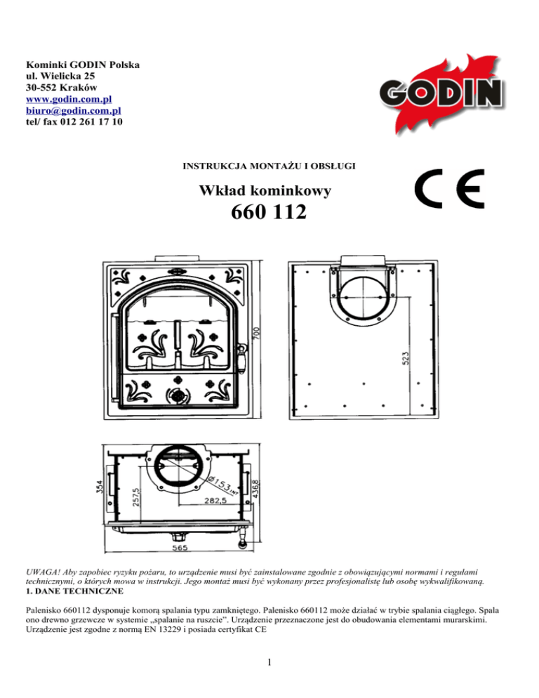 Kominki GODIN Polska ul. Wielicka 25 30-552 Kraków www.godin.com.pl [email protected] tel/ fax 012 261 17 10 INSTRUKCJA MONTAŻU I OBSŁUGI Wkład kominkowy 660 112 UWAGA! Aby zapobiec ryzyku pożaru, to urządzenie musi być zainstalowane zgodnie z obowiązującymi normami i regułami technicznymi, o których mowa w instrukcji. Jego montaż musi być wykonany przez profesjonalistę lub osobę wykwalifikowaną. 1. DANE TECHNICZNE Palenisko 660112 dysponuje komorą spalania typu zamkniętego. Palenisko 660112 może działać w trybie spalania ciągłego. Spala ono drewno grzewcze w systemie „spalanie na ruszcie”. Urządzenie przeznaczone jest do obudowania elementami murarskimi. Urządzenie jest zgodne z normą EN 13229 i posiada certyfikat CE 1 Moc nominalna: Sprawność: Przepływ masy spalin: Temperatura spalin: Emisja CO: Waga: Średnica wylotu spalin: Paliwo: 7 kW 73,70 % 7,42 g/s 305,6 ºC 0,24 % 101 kg 153 mm drewno grzewcze o wilgotności do 20%. Jako paliwo zastępcze można używać brykietów z węgla brunatnego. Wszelkie inne rodzaje paliwa są zabronione. 45 cm 240 m3 Długość polan: Przybliżona przestrzeń ogrzewania: Czas działania na biegu normalnym 2,5 kg drewna o wilgotności 12 % i mocy kalorycznej 15,7 MJ/kg: 1 godzina Zużycie paliwa przy biegu normalnym: 2,5 kg/h Zużycie paliwa przy biegu zwolnionym: 0,75 kg/h Minimalna odległość od materiałów palnych − z boku 30 cm − z tyłu: 30 cm − z przodu: 150 cm Optymalne podciśnienie w przewodzie kominowym potrzebne do dobrego funkcjonowania i do osiągnięcia jak najlepszej mocy kalorycznej urządzenia to 12 Pa jednakże podciśnienie to może zawierać się między 10 a 14 Pa. Zbyt duży ciąg, przekraczający 20 Pa a wywołany długością przewodu kominowego lub innymi jego właściwościami powoduje zbyt szybkie spalanie, nadmierne zużycie paliwa, niską sprawność, nadmierne zużycie urządzenia i utratę gwarancji. W takim przypadku należy zlecić osobom wykwalifikowanym kontrolę ciągu w działającym urządzeniu – konieczny może okazać się montaż moderatora ciągu WAŻNE: WKŁAD MUSI BYĆ PODŁĄCZONY DO NIEZALEŻNEGO PRZEWODU KOMINOWEGO 2. OTOCZENIE URZĄDZENIA 2.1 Zalecenia dotyczące miejsca instalacji Promieniowanie cieplne przekazywane z wkładu przez szybę vitro-ceramiczną wymaga oddalenia o minimum 150 cm wszystkich przedmiotów, które mogą ulec uszkodzeniu lub zmianom pod wpływem ciepła (meble, obrazy, boazeria itp.) 2.2 Przed rozpoczęciem prac należy się upewnić, czy przewód kominowy, do którego ma być podłączony wkład, jest odpowiedni do celu jakiemu ma służyć i zgodny z obowiązującymi normami. Należy sprawdzić: - szczelność, przepływowość i stabilność przewodu kominowego. - przekrój komina, który musi być stały i w takiej samej formie na całej wysokości. - właściwości i przystosowanie komina - czy powierzchnia wewnętrzna komina znajduje się w odległości co najmniej 16 cm od wszystkich elementów drewnianych (drewniany szkielet budynku, podłoga itp.) lub innych materiałów palnych. - czy w pobliżu nie ma żadnej instalacji elektrycznej - czy komin został wyczyszczony - czy ciąg jest odpowiedni - czy spoiny konstrukcji pod cegły zostały wykonane z zaprawy z cementu z tlenkiem aluminium albo z zaprawy mieszanej (cementowo-wapiennej) i czy nie pokrywają się ze spoinami w podłodze. Minimalna powierzchnia przekroju przewodu kominowego to 250 cm2, ale zalecany jest przekrój 400 cm2, co pozwoli uniknąć cofania się dymu podczas dokładania. WŁAŚCIWOŚCI PRZEWODU KOMINOWEGO: Przewód kominowy ma być zbudowany: - bądź z pustaków kominowych z szamotu odpowiadających obowiązującym normom - bądź z segmentów metalowych dopuszczonych do takiego zastosowania - bądź z elementów ceramicznych i cegieł ogniotrwałych odpowiadających obowiązującym normom W każdym przypadku przewód kominowy musi wychodzić na pomieszczenie, gdzie będzie zainstalowany wkład kominkowy. Przewody kominowe muszą przebiegać pionowo, jednakże, za wyjątkiem murowanych, mogą być odchylone od pionu pod następującymi warunkami: 2 - komin nie może mieć więcej niż dwa zgięcia (to znaczy: więcej niż jedną część nie pionową) - kąt tych zgięć w stosunku do pionu nie może przekraczać 20º. Jednakże w przypadku kominów gładkich o wysokości co najmniej 5 metrów, kąt ten może być większy niż 20º, ale nie może przekraczać 45º. Jeśli przewód kominowy nie jest właściwy i zachodzi konieczność przeróbki, należy ich dokonać stosując metody odpowiednie z punktu widzenia technicznego lub wybudować nowy komin, właściwy i przystosowany do wkładu kominkowego. Prace te muszą być wykonywane przez wykwalifikowanego pracownika. W każdym przypadku przewód kominowy musi pozwalać na czyszczenie mechaniczne. Należy sprawdzić otoczenie w którym kominek i wkład będą zainstalowane i usunąć wszystkie materiały palne lub ulegające uszkodzeniu pod wpływem temperatury znajdujące się na ścianach lub wewnątrz ścian (podłogi, mury, sufit) w miejscu instalacji kominka, jeśli ma on dotykać takich ścian. Temperatura powierzchniowa tych ścianek nie może przekroczyć 50º w miejscach styku. Sprawdzić, czy podłoga lub strop gdzie ma stać kominek maja wystarczającą nośność. W przypadku podłóg palnych trzeba przewidzieć zabezpieczenia, np. przy podłodze drewnianej należy zrobić wycięcie i wypełnić płytą betonową obszar pod kominkiem. W przypadku ścian zawierających palną izolację, jak np. plako-polistyren, należy obowiązkowo zacząć od jej wycięcia na całej wysokości ściany (aż do sufitu), na szerokości równej co najmniej odległości między zewnętrznymi filarami kominka. Tak samo należy wyciąć boazerię. W żadnym wypadku palna izolacja nie może się znajdować wewnątrz kominka i komina. Przestrzeń uzyskaną przez wycięcie należy wypełnić murem wzmacniającym z materi