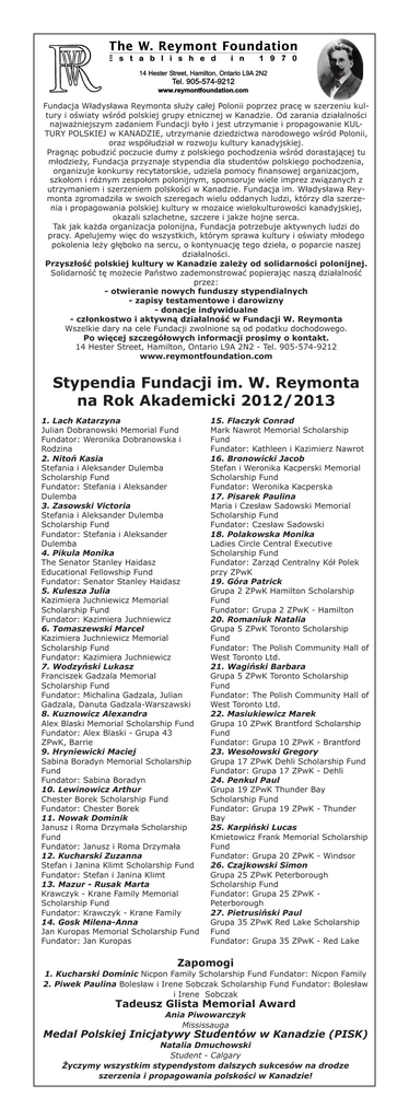 Fundacja Władysława Reymonta służy całej Polonii poprzez pracę w szerzeniu kultury i oświaty wśród polskiej grupy etnicznej w Kanadzie. Od zarania działalności najważniejszym zadaniem Fundacji było i jest utrzymanie i propagowanie KULTURY POLSKIEJ w KANADZIE, utrzymanie dziedzictwa narodowego wśród Polonii, oraz współudział w rozwoju kultury kanadyjskiej. Pragnąc pobudzić poczucie dumy z polskiego pochodzenia wśród dorastającej tu młodzieży, Fundacja przyznaje stypendia dla studentów polskiego pochodzenia, organizuje konkursy recytatorskie, udziela pomocy finansowej organizacjom, szkołom i różnym zespołom polonijnym, sponsoruje wiele imprez związanych z utrzymaniem i szerzeniem polskości w Kanadzie. Fundacja im. Władysława Reymonta zgromadziła w swoich szeregach wielu oddanych ludzi, którzy dla szerzenia i propagowania polskiej kultury w mozaice wielokulturowości kanadyjskiej, okazali szlachetne, szczere i jakże hojne serca. Tak jak każda organizacja polonijna, Fundacja potrzebuje aktywnych ludzi do pracy. Apelujemy więc do wszystkich, którym sprawa kultury i oświaty młodego pokolenia leży głęboko na sercu, o kontynuację tego dzieła, o poparcie naszej działalności. Przyszłość polskiej kultury w Kanadzie zależy od solidarności polonijnej. Solidarność tę możecie Państwo zademonstrować popierając naszą działalność przez: - otwieranie nowych funduszy stypendialnych - zapisy testamentowe i darowizny - donacje indywidualne - członkostwo i aktywną działalność w Fundacji W. Reymonta Wszelkie dary na cele Fundacji zwolnione są od podatku dochodowego. Po więcej szczegółowych informacji prosimy o kontakt. 14 Hester Street, Hamilton, Ontario L9A 2N2 - Tel. 905-574-9212 www.reymontfoundation.com Stypendia Fundacji im. W. Reymonta na Rok Akademicki 2012/2013 1. Lach Katarzyna Julian Dobranowski Memorial Fund Fundator: Weronika Dobranowska i Rodzina 2. Nitoń Kasia Stefania i Aleksander Dulemba Scholarship Fund Fundator: Stefania i Aleksander Dulemba 3. Zasowski Victoria Stefania i Aleksander Dulemba Scholarship Fund Fundator: Stefania i Aleksander Dulemba 4. Pikula Monika The Senator Stanley Haidasz Educational Fellowship Fund Fundator: Senator Stanley Haidasz 5. Kulesza Julia Kazimiera Juchniewicz Memorial Scholarship Fund Fundator: Kazimiera Juchniewicz 6. Tomaszewski Marcel Kazimiera Juchniewicz Memorial Scholarship Fund Fundator: Kazimiera Juchniewicz 7. Wodzyński Lukasz Franciszek Gadzala Memorial Scholarship Fund Fundator: Michalina Gadzala, Julian Gadzala, Danuta Gadzala-Warszawski 8. Kuznowicz Alexandra Alex Blaski Memorial Scholarship Fund Fundator: Alex Blaski - Grupa 43 ZPwK, Barrie 9. Hryniewicki Maciej Sabina Boradyn Memorial Scholarship Fund Fundator: Sabina Boradyn 10. Lewinowicz Arthur Chester Borek Scholarship Fund Fundator: Chester Borek 11. Nowak Dominik Janusz i Roma Drzymała Scholarship Fund Fundator: Janusz i Roma Drzymała 12. Kucharski Zuzanna Stefan i Janina Klimt Scholarship Fund Fundator: Stefan i Janina Klimt 13. Mazur - Rusak Marta Krawczyk - Krane Family Memorial Scholarship Fund Fundator: Krawczyk - Krane Family 14. Gosk Milena-Anna Jan Kuropas Memorial Scholarship Fund Fundator: Jan Kuropas 15. Flaczyk Conrad Mark Nawrot Memorial Scholarship Fund Fundator: Kathleen i Kazimierz Nawrot 16. Bronowicki Jacob Stefan i Weronika Kacperski Memorial Scholarship Fund Fundator: Weronika Kacperska 17. Pisarek Paulina Maria i Czesław Sadowski Memorial Scholarship Fund Fundator: Czesław Sadowski 18. Polakowska Monika Ladies Circle Central Executive Scholarship Fund Fundator: Zarząd Centralny Kół Polek przy ZPwK 19. Góra Patrick Grupa 2 ZPwK Hamilton Scholarship Fund Fundator: Grupa 2 ZPwK - Hamilton 20. Romaniuk Natalia Grupa 5 ZPwK Toronto Scholarship Fund Fundator: The Polish Community Hall of West Toronto Ltd. 21. Wagiński Barbara Grupa 5 ZPwK Toronto Scholarship Fund Fundator: The Polish Community Hall of West Toronto Ltd. 22. Masiukiewicz Marek Grupa 10 ZPwK Brantford Scholarship Fund Fundator: Grupa 10 ZPwK - Brantford 23. Wesołowski Gregory Grupa 17 ZPwK Dehli Scholarship Fund Fundator: Grupa 17 ZPwK - Dehli 24. Penkul Paul Grupa 19 ZPwK Thunder Bay Scholarship Fund Fundator: Grupa 19 ZPwK - Thunder Bay 25. Karpiński Lucas Kmietowicz Frank Memorial Scholarship Fund Fundator: Grupa 20 ZPwK - Windsor 26. Czajkowski Simon Grupa 25 ZPwK Peterborough Scholarship Fund Fundator: Grupa 25 ZPwK Peterborough 27. Pietrusiński Paul Grupa 35 ZPwK Red Lake Scholarship Fund Fundator: Grupa 35 ZPwK - Red Lake Zapomogi 1. Kucharski Dominic Nicpon Family Scholarship Fund Fundator: Nicpon Family 2. Piwek Paulina Bolesław i Irene Sobczak Scholarship Fund Fundator: Bolesław i Irene Sobczak Tadeusz Glista Memorial Award Ania Piwowarczyk Mississauga Medal Polskiej Inicjatywy Studentów w Kanadzie (PISK) Natalia Dmuchowski Student - Calgary Życzymy wszystkim stypendystom dalszych sukcesów na drodze szerzenia i propagowania polskości w Kanadzie!