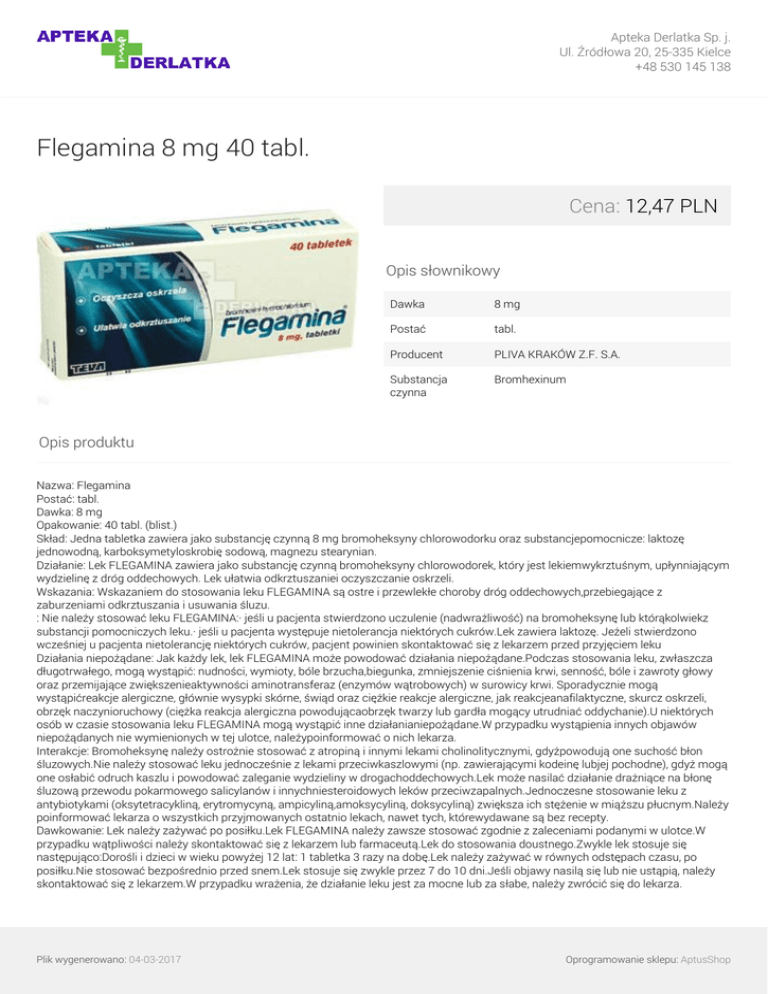Apteka Derlatka Sp. j. Ul. Źródłowa 20, 25-335 Kielce +48 530 145 138 Flegamina 8 mg 40 tabl. Cena: 12,47 PLN Opis słownikowy Dawka 8 mg Postać tabl. Producent PLIVA KRAKÓW Z.F. S.A. Substancja czynna Bromhexinum Opis produktu Nazwa: Flegamina Postać: tabl. Dawka: 8 mg Opakowanie: 40 tabl. (blist.) Skład: Jedna tabletka zawiera jako substancję czynną 8 mg bromoheksyny chlorowodorku oraz substancjepomocnicze: laktozę jednowodną, karboksymetyloskrobię sodową, magnezu stearynian. Działanie: Lek FLEGAMINA zawiera jako substancję czynną bromoheksyny chlorowodorek, który jest lekiemwykrztuśnym, upłynniającym wydzielinę z dróg oddechowych. Lek ułatwia odkrztuszaniei oczyszczanie oskrzeli. Wskazania: Wskazaniem do stosowania leku FLEGAMINA są ostre i przewlekłe choroby dróg oddechowych,przebiegające z zaburzeniami odkrztuszania i usuwania śluzu. : Nie należy stosować leku FLEGAMINA:· jeśli u pacjenta stwierdzono uczulenie (nadwrażliwość) na bromoheksynę lub którąkolwiekz substancji pomocniczych leku.· jeśli u pacjenta występuje nietolerancja niektórych cukrów.Lek zawiera laktozę. Jeżeli stwierdzono wcześniej u pacjenta nietolerancję niektórych cukrów, pacjent powinien skontaktować się z lekarzem przed przyjęciem leku Działania niepożądane: Jak każdy lek, lek FLEGAMINA może powodować działania niepożądane.Podczas stosowania leku, zwłaszcza długotrwałego, mogą wystąpić: nudności, wymioty, bóle brzucha,biegunka, zmniejszenie ciśnienia krwi, senność, bóle i zawroty głowy oraz przemijające zwiększenieaktywności aminotransferaz (enzymów wątrobowych) w surowicy krwi. Sporadycznie mogą wystąpićreakcje alergiczne, głównie wysypki skórne, świąd oraz ciężkie reakcje alergiczne, jak reakcjeanafilaktyczne, skurcz oskrzeli, obrzęk naczynioruchowy (ciężka reakcja alergiczna powodującaobrzęk twarzy lub gardła mogący utrudniać oddychanie).U niektórych osób w czasie stosowania leku FLEGAMINA mogą wystąpić inne działanianiepożądane.W przypadku wystąpienia innych objawów niepożądanych nie wymienionych w tej ulotce, należypoinformować o nich lekarza. Interakcje: Bromoheksynę należy ostrożnie stosować z atropiną i innymi lekami cholinolitycznymi, gdyżpowodują one suchość błon śluzowych.Nie należy stosować leku jednocześnie z lekami przeciwkaszlowymi (np. zawierającymi kodeinę lubjej pochodne), gdyż mogą one osłabić odruch kaszlu i powodować zaleganie wydzieliny w drogachoddechowych.Lek może nasilać działanie drażniące na błonę śluzową przewodu pokarmowego salicylanów i innychniesteroidowych leków przeciwzapalnych.Jednoczesne stosowanie leku z antybiotykami (oksytetracykliną, erytromycyną, ampicyliną,amoksycyliną, doksycyliną) zwiększa ich stężenie w miąższu płucnym.Należy poinformować lekarza o wszystkich przyjmowanych ostatnio lekach, nawet tych, którewydawane są bez recepty. Dawkowanie: Lek należy zażywać po posiłku.Lek FLEGAMINA należy zawsze stosować zgodnie z zaleceniami podanymi w ulotce.W przypadku wątpliwości należy skontaktować się z lekarzem lub farmaceutą.Lek do stosowania doustnego.Zwykle lek stosuje się następująco:Dorośli i dzieci w wieku powyżej 12 lat: 1 tabletka 3 razy na dobę.Lek należy zażywać w równych odstępach czasu, po posiłku.Nie stosować bezpośrednio przed snem.Lek stosuje się zwykle przez 7 do 10 dni.Jeśli objawy nasilą się lub nie ustąpią, należy skontaktować się z lekarzem.W przypadku wrażenia, że działanie leku jest za mocne lub za słabe, należy zwrócić się do lekarza. Plik wygenerowano: 04-03-2017 Oprogramowanie sklepu: AptusShop Apteka Derlatka Sp. j. Ul. Źródłowa 20, 25-335 Kielce +48 530 145 138 Dawkowanie (dzieci): Dzieci w wieku od 6 do 12 lat: ½ tabletki 3 razy na dobę.Dzieci w wieku od 3 do 6 lat: ½ tabletki 2 razy na dobęNie jest wskazane stosowanie leku FLEGAMINA w postaci tabletek u dzieci w wieku 3 do 6 lat, którenie są w stanie połknąć tabletki; u tych pacjentów zaleca się stosowanie leku w postaci syropu Środki ostrożności: Należy pić więcej płynów. Odpowiednie nawodnienie organizmu zwiększa rozrzedzenie wydzielinyoskrzelowej i ułatwia odkrztuszanie.Lek należy stosować ostrożnie u pacjentów z czynną chorobą wrzodową żołądka i dwunastnicy, gdyżmoże on nasilać jej objawy.Należy również zachować ostrożność w przypadku ciężkich zaburzeń czynności wątroby lub nerek. Prowadzenie pojazdów: Należy zachować ostrożność, gdyż mogą wystąpić bóle i zawroty głowy lub senność. Przedawkowanie: Dotychczas nie opisano objawów przedawkowania bromoheksyny. W przypadku przedawkowanianależy podać węgiel aktywowany. Jeśli będzie konieczne, lekarz zaleci wykonanie płukania żołądka izastosuje leczenie objawowe.W razie przyjęcia większej niż zalecana dawki leku, należy niezwłocznie zwrócić się do lekarza lubfarmaceuty. Ciąża: Przed zastosowaniem leku należy poradzić się lekarza.Nie należy stosować leku w pierwszych trzech miesiącach ciąży.W pozostałym okresie ciąży, lek można stosować wyłącznie w przypadku, gdy w opinii lekarzakorzyść dla matki przeważa nad potencjalnym zagrożeniem dla płodu.Przed zastosowaniem leku należy poradzić się lekarza.Nie zaleca się stosowania leku w okresie karmienia piersią. Uwagi: Lek należy zażyć najszybciej, jak to możliwe. Gdy zbliża się już czas przyjęcia kolejnej dawki, należyzażyć ją o wyznaczonej porze. Nie należy stosować dawki podwójnej w celu uzupełnienia pominiętejdawki.Przechowywać w temperaturze poniżej 25ºC, w suchym miejscu.Lek należy przechowywać w miejscu niedostępnym i niewidocznym dla dzieci.Nie należy stosować leku FLEGAMINA po upływie terminu ważności zamieszczonego na opakowaniu. Plik wygenerowano: 04-03-2017 Powered by TCPDF (www.tcpdf.org) Oprogramowanie sklepu: AptusShop