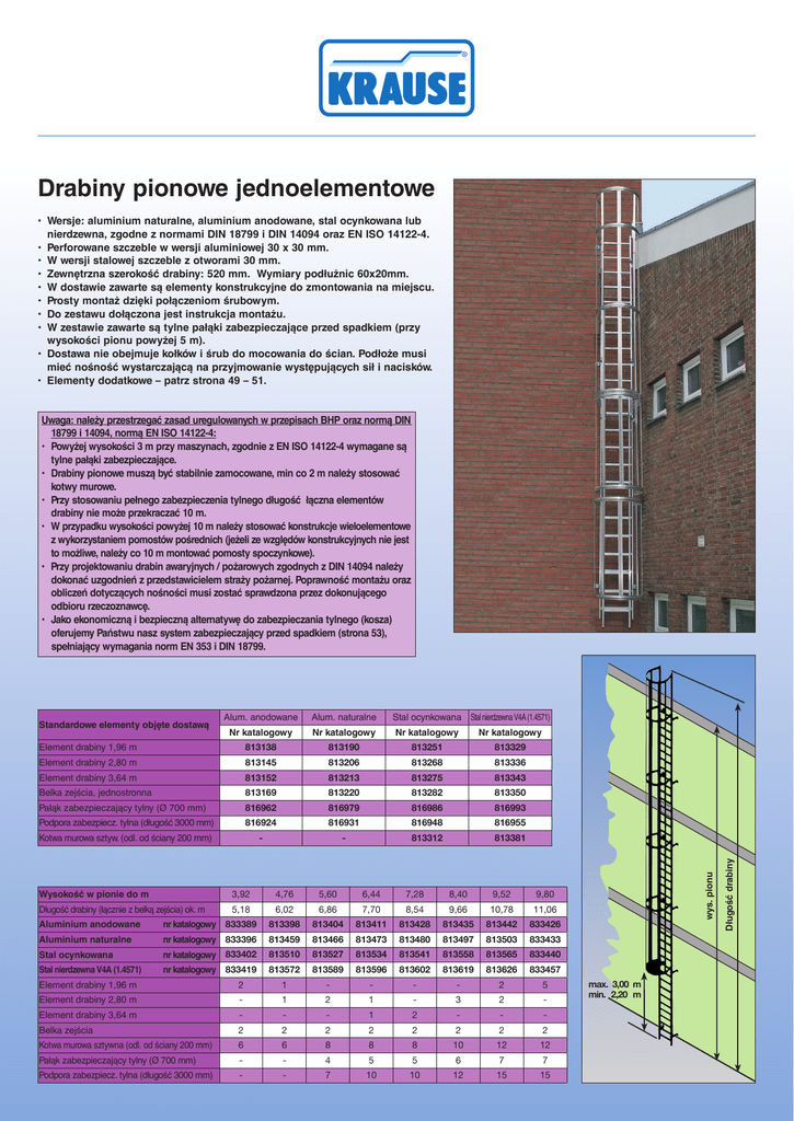 Drabiny pionowe jednoelementowe • Wersje: aluminium naturalne, aluminium anodowane, stal ocynkowana lub nierdzewna, zgodne z normami DIN 18799 i DIN 14094 oraz EN ISO 14122-4. • Perforowane szczeble w wersji aluminiowej 30 x 30 mm. • W wersji stalowej szczeble z otworami 30 mm. • Zewnętrzna szerokość drabiny: 520 mm. Wymiary podłużnic 60x20mm. • W dostawie zawarte są elementy konstrukcyjne do zmontowania na miejscu. • Prosty montaż dzięki połączeniom śrubowym. • Do zestawu dołączona jest instrukcja montażu. • W zestawie zawarte są tylne pałąki zabezpieczające przed spadkiem (przy wysokości pionu powyżej 5 m). • Dostawa nie obejmuje kołków i śrub do mocowania do ścian. Podłoże musi mieć nośność wystarczającą na przyjmowanie występujących sił i nacisków. • Elementy dodatkowe – patrz strona 49 – 51. Alum. naturalne Stal ocynkowana Stal nierdzewna V4A (1.4571) Nr katalogowy Nr katalogowy Nr katalogowy Nr katalogowy Element drabiny 1,96 m 813138 813190 813251 813329 Element drabiny 2,80 m 813145 813206 813268 813336 Element drabiny 3,64 m 813152 813213 813275 813343 Belka zejścia, jednostronna 813169 813220 813282 813350 Pałąk zabezpieczający tylny (Ø 700 mm) 816962 816979 816986 816993 Podpora zabezpiecz. tylna (długość 3000 mm) 816924 816931 816948 816955 Kotwa murowa sztyw. (odl. od ściany 200 mm) - - 813312 813381 Wysokość w pionie do m 3,92 4,76 5,60 6,44 7,28 8,40 9,52 9,80 Długość drabiny (łącznie z belką zejścia) ok. m 5,18 6,02 6,86 7,70 8,54 9,66 10,78 11,06 Aluminium anodowane nr katalogowy 833389 813398 813404 813411 813428 813435 813442 833426 Aluminium naturalne nr katalogowy 833396 813459 813466 813473 813480 813497 813503 833433 Stal ocynkowana nr katalogowy 833402 813510 813527 813534 813541 813558 813565 833440 Stal nierdzewna V4A (1.4571) nr katalogowy 833419 813572 813589 813596 813602 813619 813626 833457 Element drabiny 1,96 m 2 1 - - - - 2 5 Element drabiny 2,80 m - 1 2 1 - 3 2 - Element drabiny 3,64 m - - - 1 2 - - - Belka zejścia 2 2 2 2 2 2 2 2 Kotwa murowa sztywna (odl. od ściany 200 mm) 6 6 8 8 8 10 12 12 Pałąk zabezpieczający tylny (Ø 700 mm) - - 4 5 5 6 7 7 Podpora zabezpiecz. tylna (długość 3000 mm) - - 7 10 10 12 15 15 max. 3,00 m min. 2,20 m Długość drabiny Alum. anodowane Standardowe elementy objęte dostawą wys. pionu Uwaga: należy przestrzegać zasad uregulowanych w przepisach BHP oraz normą DIN 18799 i 14094, normą EN ISO 14122-4: • Powyżej wysokości 3 m przy maszynach, zgodnie z EN ISO 14122-4 wymagane są tylne pałąki zabezpieczające. • Drabiny pionowe muszą być stabilnie zamocowane, min co 2 m należy stosować kotwy murowe. • Przy stosowaniu pełnego zabezpieczenia tylnego długość łączna elementów drabiny nie może przekraczać 10 m. • W przypadku wysokości powyżej 10 m należy stosować konstrukcje wieloelementowe z wykorzystaniem pomostów pośrednich (jeżeli ze względów konstrukcyjnych nie jest to możliwe, należy co 10 m montować pomosty spoczynkowe). • Przy projektowaniu drabin awaryjnych / pożarowych zgodnych z DIN 14094 należy dokonać uzgodnień z przedstawicielem straży pożarnej. Poprawność montażu oraz obliczeń dotyczących nośności musi zostać sprawdzona przez dokonującego odbioru rzeczoznawcę. • Jako ekonomiczną i bezpieczną alternatywę do zabezpieczania tylnego (kosza) oferujemy Państwu nasz system zabezpieczający przed spadkiem (strona 53), spełniający wymagania norm EN 353 i DIN 18799.