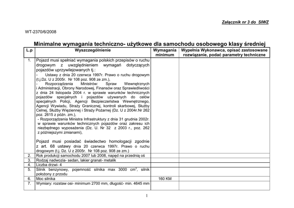 Załącznik nr 3 do SIWZ WT-2370/6/2008 Minimalne wymagania techniczno- uŜytkowe dla samochodu osobowego klasy średniej L.p Wyszczególnienie Wymagania minimum 1. Pojazd musi spełniać wymagania polskich przepisów o ruchu drogowym z uwzględnieniem wymagań dotyczących pojazdów uprzywilejowanych tj.: Ustawy z dnia 20 czerwca 1997r. Prawo o ruchu drogowym (t.j.Dz. U z 2005r. Nr 108 poz. 908 ze zm.), Rozporządzenia Ministrów: Spraw Wewnętrznych i Administracji, Obrony Narodowej, Finansów oraz Sprawiedliwości z dnia 24 listopada 2004 r. w sprawie warunków technicznych pojazdów specjalnych i pojazdów uŜywanych do celów specjalnych Policji, Agencji Bezpieczeństwa Wewnętrznego, Agencji Wywiadu, StraŜy Granicznej, kontroli skarbowej, SłuŜby Celnej, SłuŜby Więziennej i StraŜy PoŜarnej (Dz. U z 2004r.Nr 262 poz. 2615 z późn. zm.), - Rozporządzenia Ministra Infrastruktury z dnia 31 grudnia 2002r. w sprawie warunków technicznych pojazdów oraz zakresu ich niezbędnego wyposaŜenia (Dz. U. Nr 32 z 2003 r., poz. 262 z późniejszymi zmianami), Pojazd musi posiadać świadectwo homologacji zgodnie z art. 68 ustawy dnia 20 czerwca 1997r. Prawo o ruchu 2. 3. 4. 5. 6. 7. drogowym (t.j. Dz. U z 2005r. Nr 108 poz. 908 ze zm.) Rok produkcji samochodu 2007 lub 2008, napęd na przednią oś Rodzaj nadwozia- sedan, lakier granat- metalik Liczba drzwi- 4 Silnik benzynowy, pojemność silnika max 3000 cm3, silnik połoŜony z przodu Moc silnika Wymiary: rozstaw osi- minimum 2700 mm, długość- min. 4645 mm 1 160 KM Wypełnia Wykonawca, opisać zastosowane rozwiązanie, podać parametry techniczne 8. WyposaŜenie: - poduszka powietrzna dla kierowcy i pasaŜera oraz boczne, - kurtyny powietrzne, - ABS, system kontroli trakcji, - system stabilizacji toru jazdy, - przednie fotele wyposaŜone w regulację wysokości oraz odcinka lędźwiowego dla fotela kierowcy, wszystkie fotele wyposaŜone w zagłówki, - klimatyzacja dwustrefowa automatyczna, - wspomaganie układu kierowniczego, - regulacja wysokości i kąta kierownicy, - lusterka boczne elektrycznie ustawiane i ogrzewane, - centralny zamek sterowany drogą radiową, - pasy bezpieczeństwa bezwładnościowe, dla przednich siedzeńnapinacze, - immobiliser, - elektrycznie otwierane szyby z przodu i z tyłu, - dywaniki tkaninowe z przodu i z tyłu, - blokada skrzyni biegów, - autoalarm antywłamaniowy, - pełnowymiarowe koło zapasowe, - akustyczny sygnalizator niewyłącznych świateł, - obręcze kół ze stopów metali lekkich, - radioodtwarzacz płyt CD wraz z instalacją radiową i głośnikami, - ksenonowe lampy główne, - komputer pokładowy, - tempomat, - trzecie światło stop, - pojemność bagaŜnika min. 480 l, - sterowanie radiem w kierownicy, - zestaw głośnomówiący do telefonu komórkowego z funkcją Bluetooth, - przyciemniane szyby do 30% za pomocą folii posiadającej stosowne dopuszczenie do stosowania tj.: tylna i boczne tylne, - minimum dwa niezaleŜne gniazda (zapalniczki) zasilające 12V w zasięgu kierowcy i pasaŜera siedzącego z przodu pojazdu oraz jedno gniazdo w bagaŜniku. 2 9. 10. 11. 12. 13. 14. 15. 16. Po obu stronach pojazdu pas wyróŜniający barwy czerwieni sygnałowej z folii odblaskowej magnetycznej oraz napisy „STRAś” barwy czerwonej mocowane na listwach magnetycznych. Pojazd wyposaŜony w urządzenie sygnalizacyjno- ostrzegawcze, dźwiękowe i świetlne. Z przodu pojazdu zamontowane tylko dwa światła pulsacyjne ostrzegawcze koloru niebieskiego. Na wyposaŜeniu pojazdu pojedyncza lampa elektroniczna koloru niebieskiego z mocowaniem magnetycznym, zasilana z gniazdka zapalniczki samochodowej W kabinie pojazdu musi być zamontowany radiotelefon przewoźny klasy Motorola GM 360 wraz z instalacją antenową na pasmo radiowe 148 MHz. Radiotelefon zaprogramowany wg wskazań zamawiającego. Zmiany adaptacyjne pojazdu dotyczące montaŜu wyposaŜenia nie mogą powodować utraty ani ograniczenia uprawnień wynikających z fabrycznej gwarancji Pojazd powinien być oceniony na min. 4 gwiazdki w ochronie dorosłych otrzymane w teście EuroNCAP Dostępność serwisu na terenie Poznania lub powiatu poznańskiego Średnie zuŜycie paliwa wg danych technicznych pojazdu wynosi(naleŜy podać wartość ) Przyspieszenie 0-100 km/h (s) wg danych technicznych pojazdu wynosi- (naleŜy podać wartość ) 3 4