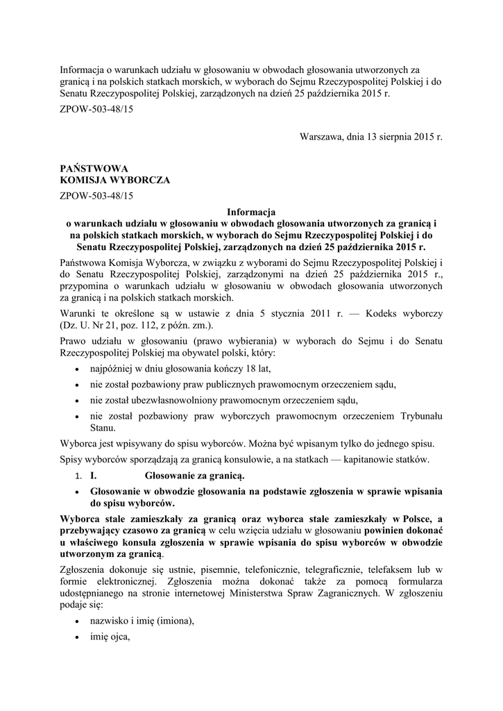 Informacja o warunkach udziału w głosowaniu w obwodach głosowania utworzonych za granicą i na polskich statkach morskich, w wyborach do Sejmu Rzeczypospolitej Polskiej i do Senatu Rzeczypospolitej Polskiej, zarządzonych na dzień 25 października 2015 r. ZPOW-503-48/15 Warszawa, dnia 13 sierpnia 2015 r. PAŃSTWOWA KOMISJA WYBORCZA ZPOW-503-48/15 Informacja o warunkach udziału w głosowaniu w obwodach głosowania utworzonych za granicą i na polskich statkach morskich, w wyborach do Sejmu Rzeczypospolitej Polskiej i do Senatu Rzeczypospolitej Polskiej, zarządzonych na dzień 25 października 2015 r. Państwowa Komisja Wyborcza, w związku z wyborami do Sejmu Rzeczypospolitej Polskiej i do Senatu Rzeczypospolitej Polskiej, zarządzonymi na dzień 25 października 2015 r., przypomina o warunkach udziału w głosowaniu w obwodach głosowania utworzonych za granicą i na polskich statkach morskich. Warunki te określone są w ustawie z dnia 5 stycznia 2011 r. — Kodeks wyborczy (Dz. U. Nr 21, poz. 112, z późn. zm.). Prawo udziału w głosowaniu (prawo wybierania) w wyborach do Sejmu i do Senatu Rzeczypospolitej Polskiej ma obywatel polski, który: najpóźniej w dniu głosowania kończy 18 lat, nie został pozbawiony praw publicznych prawomocnym orzeczeniem sądu, nie został ubezwłasnowolniony prawomocnym orzeczeniem sądu, nie został pozbawiony praw wyborczych prawomocnym orzeczeniem Trybunału Stanu. Wyborca jest wpisywany do spisu wyborców. Można być wpisanym tylko do jednego spisu. Spisy wyborców sporządzają za granicą konsulowie, a na statkach — kapitanowie statków. 1. I. Głosowanie za granicą. Głosowanie w obwodzie głosowania na podstawie zgłoszenia w sprawie wpisania do spisu wyborców. Wyborca stale zamieszkały za granicą oraz wyborca stale zamieszkały w Polsce, a przebywający czasowo za granicą w celu wzięcia udziału w głosowaniu powinien dokonać u właściwego konsula zgłoszenia w sprawie wpisania do spisu wyborców w obwodzie utworzonym za granicą. Zgłoszenia dokonuje się ustnie, pisemnie, telefonicznie, telegraficznie, telefaksem lub w formie elektronicznej. Zgłoszenia można dokonać także za pomocą formularza udostępnianego na stronie internetowej Ministerstwa Spraw Zagranicznych. W zgłoszeniu podaje się: nazwisko i imię (imiona), imię ojca, datę urodzenia, numer ewidencyjny PESEL, adres zamieszkania lub pobytu wyborcy za granicą, adres zamieszkania wyborcy w kraju, tj. miejsce ujęcia w rejestrze wyborców (w odniesieniu do osób przebywających czasowo za granicą), numer ważnego polskiego paszportu oraz miejsce i datę jego wydania. W państwach, w których dowód osobisty jest wystarczającym dokumentem do przekroczenia granicy, w miejsce numeru ważnego polskiego paszportu można podać numer ważnego dowodu osobistego. Zgłoszenia dokonuje się najpóźniej w 3. dniu przed dniem wyborów, tj. do dnia 22 października 2015 r. Obwody głosowania za granicą tworzy Minister Spraw Zagranicznych w drodze rozporządzenia. Wykaz tych obwodów będzie dostępny we wszystkich polskich placówkach konsularnych, delegaturach Krajowego Biura Wyborczego oraz na stronie internetowej Państwowej Komisji Wyborczej http://parlament2015.pkw.gov.pl. Głosowanie korespondencyjne Wyborca stale zamieszkały za granicą oraz wyborca stale zamieszkały w Polsce, a przebywający czasowo za granicą może głosować korespondencyjnie. W tym celu powinien dokonać u właściwego konsula zgłoszenia zamiaru głosowania korespondencyjnego. Zamiar głosowania korespondencyjnego powinien być zgłoszony przez wyborcę, najpóźniej w 18. dniu przed dniem wyborów, tj. do dnia 7 października 2015 r. Zgłoszenie może być dokonane ustnie, pisemnie, telefaksem lub w formie elektronicznej. W zgłoszeniu podaje się: oznaczenie wyborów, których dotyczy zgłoszenie, nazwisko i imię (imiona), imię ojca, datę urodzenia, numer ewidencyjny PESEL, adres zamieszkania lub pobytu wyborcy za granicą, adres zamieszkania wyborcy w kraju, tj. miejsce ujęcia w rejestrze wyborców (w odniesieniu do osób przebywających czasowo za granicą), numer ważnego polskiego paszportu oraz miejsce i datę jego wydania. W państwach, w których dowód osobisty jest wystarczającym dokumentem do przekroczenia granicy, w miejsce numeru ważnego polskiego paszportu można podać numer ważnego dowodu osobistego, adres, pod który ma zostać wysłany przez konsula pakiet wyborczy zawierający karty do głosowania, albo deklarację osobistego odbioru pakietu wyborczego u konsula. W przypadku gdy wyborca zgłosił zamiar głosowania korespondencyjnego za granicą, wyborcy temu zaświadczenia o prawie do głosowania w miejscu pobytu w dniu wyborów nie wydaje się po wysłaniu do wyborcy pakietu wyborczego, chyba że zwrócił on pakiet wyborczy w stanie nienaruszonym. Głosowanie na podstawie zaświadczenia o prawie do głosowania. · Wyborca stale zamieszkały w kraju zamierzający głosować za granicą może otrzymać zaświadczenie o prawie do głosowania. Z zaświadczeniem takim można głosować w dowolnym obwodzie głosowania w kraju, za granicą lub na polskim statku morskim. Wniosek o wydanie zaświadczenia o prawie do głosowania składa się w urzędzie gminy, w której wyborca będzie ujęty w spisie wyborców, najpóźniej w 2. dniu przed dniem wyborów, tj. do dnia 23 października 2015 r. Wniosek o wydanie zaświadczenia o prawie do głosowania może zostać złożony pisemnie, telefaksem lub w formie elektronicznej (nie jest wymagane posiadanie profilu zaufanego lub kwalifikowanego podpisu elektronicznego). Wniosek może być zatem złożony za pośrednictwem poczty elektronicznej (e-mail). Do odbioru zaświadczenia wyborca może upoważnić inną osobę. Wówczas wyborca sporządza wniosek o wydanie zaświadczenia i upoważnienie (może to być jeden dokument), w którym wskazuje swoje imię (imiona) i nazwisko oraz numer PESEL, a także dane osoby upoważnionej