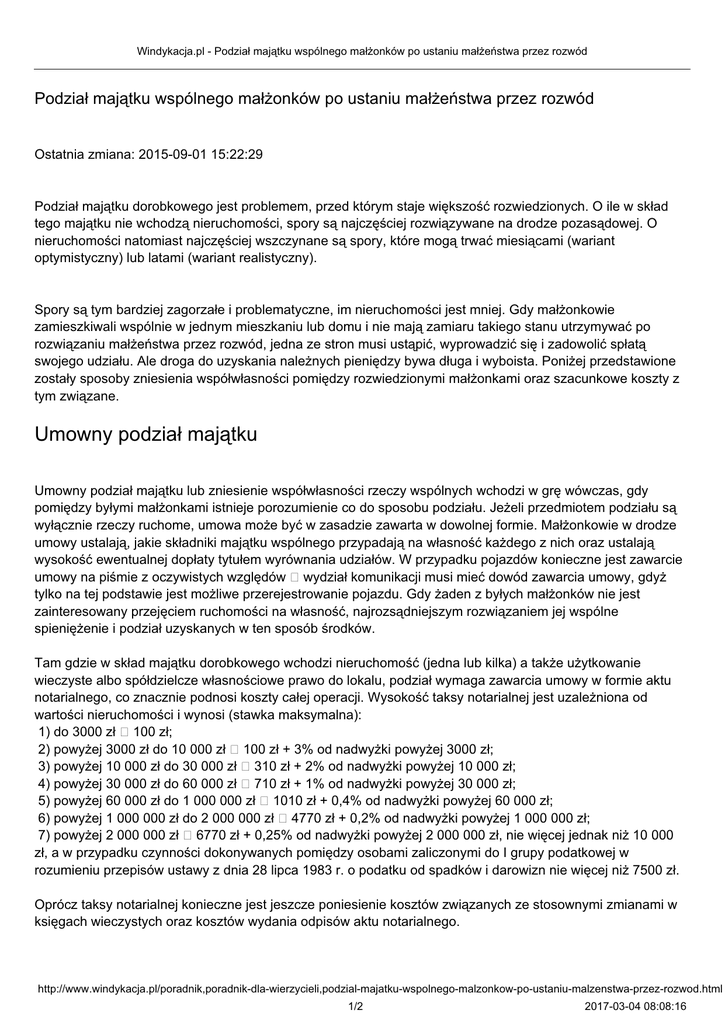 Windykacja.pl - Podział majątku wspólnego małżonków po ustaniu małżeństwa przez rozwód Podział majątku wspólnego małżonków po ustaniu małżeństwa przez rozwód Ostatnia zmiana: 2015-09-01 15:22:29 Podział majątku dorobkowego jest problemem, przed którym staje większość rozwiedzionych. O ile w skład tego majątku nie wchodzą nieruchomości, spory są najczęściej rozwiązywane na drodze pozasądowej. O nieruchomości natomiast najczęściej wszczynane są spory, które mogą trwać miesiącami (wariant optymistyczny) lub latami (wariant realistyczny). Spory są tym bardziej zagorzałe i problematyczne, im nieruchomości jest mniej. Gdy małżonkowie zamieszkiwali wspólnie w jednym mieszkaniu lub domu i nie mają zamiaru takiego stanu utrzymywać po rozwiązaniu małżeństwa przez rozwód, jedna ze stron musi ustąpić, wyprowadzić się i zadowolić spłatą swojego udziału. Ale droga do uzyskania należnych pieniędzy bywa długa i wyboista. Poniżej przedstawione zostały sposoby zniesienia współwłasności pomiędzy rozwiedzionymi małżonkami oraz szacunkowe koszty z tym związane. Umowny podział majątku Umowny podział majątku lub zniesienie współwłasności rzeczy wspólnych wchodzi w grę wówczas, gdy pomiędzy byłymi małżonkami istnieje porozumienie co do sposobu podziału. Jeżeli przedmiotem podziału są wyłącznie rzeczy ruchome, umowa może być w zasadzie zawarta w dowolnej formie. Małżonkowie w drodze umowy ustalają, jakie składniki majątku wspólnego przypadają na własność każdego z nich oraz ustalają wysokość ewentualnej dopłaty tytułem wyrównania udziałów. W przypadku pojazdów konieczne jest zawarcie umowy na piśmie z oczywistych względów wydział komunikacji musi mieć dowód zawarcia umowy, gdyż tylko na tej podstawie jest możliwe przerejestrowanie pojazdu. Gdy żaden z byłych małżonków nie jest zainteresowany przejęciem ruchomości na własność, najrozsądniejszym rozwiązaniem jej wspólne spieniężenie i podział uzyskanych w ten sposób środków. Tam gdzie w skład majątku dorobkowego wchodzi nieruchomość (jedna lub kilka) a także użytkowanie wieczyste albo spółdzielcze własnościowe prawo do lokalu, podział wymaga zawarcia umowy w formie aktu notarialnego, co znacznie podnosi koszty całej operacji. Wysokość taksy notarialnej jest uzależniona od wartości nieruchomości i wynosi (stawka maksymalna): 1) do 3000 zł 100 zł; 2) powyżej 3000 zł do 10 000 zł 100 zł + 3% od nadwyżki powyżej 3000 zł; 3) powyżej 10 000 zł do 30 000 zł 310 zł + 2% od nadwyżki powyżej 10 000 zł; 4) powyżej 30 000 zł do 60 000 zł 710 zł + 1% od nadwyżki powyżej 30 000 zł; 5) powyżej 60 000 zł do 1 000 000 zł 1010 zł + 0,4% od nadwyżki powyżej 60 000 zł; 6) powyżej 1 000 000 zł do 2 000 000 zł 4770 zł + 0,2% od nadwyżki powyżej 1 000 000 zł; 7) powyżej 2 000 000 zł 6770 zł + 0,25% od nadwyżki powyżej 2 000 000 zł, nie więcej jednak niż 10 000 zł, a w przypadku czynności dokonywanych pomiędzy osobami zaliczonymi do I grupy podatkowej w rozumieniu przepisów ustawy z dnia 28 lipca 1983 r. o podatku od spadków i darowizn nie więcej niż 7500 zł. Oprócz taksy notarialnej konieczne jest jeszcze poniesienie kosztów związanych ze stosownymi zmianami w księgach wieczystych oraz kosztów wydania odpisów aktu notarialnego. http://www.windykacja.pl/poradnik,poradnik-dla-wierzycieli,podzial-majatku-wspolnego-malzonkow-po-ustaniu-malzenstwa-przez-rozwod.html 1/2 2017-03-04 08:08:16 Windykacja.pl - Podział majątku wspólnego małżonków po ustaniu małżeństwa przez rozwód Sądowy podział majątku Sądowy podział majątku jest oczywiście konieczny w przypadku braku porozumienia co do sposobu tego podziału. Postępowanie w sprawie o podział majątku dorobkowego ma charakter nieprocesowy, co dla przeciętnego uczestnika takiego postępowania ma niewielkie znaczenie. Podział sądowy zawsze może się okazać drogą przez mękę trwającą miesiącami lub latami, może się także wiązać z koniecznością powoływania biegłych w celu oszacowania wartości składników majątkowych podlegających poddziałowi. Biorąc pod uwagę czas konieczny na doprowadzenie do uzyskania prawomocnego orzeczenia sądu, koszty (początkowe) sądowego podziału majątku wydają się najmniej istotną przeszkodą. A są one następujące: Art. 38 ustawy z dnia 28 lipca 2005 r. o kosztach sądowych w sprawach cywilnych: 1. Opłatę stałą w kwocie 1000 złotych pobiera się od wniosku o podział majątku wspólnego po ustaniu małżeńskiej wspólności majątkowej. 2. Jeżeli wniosek zawiera zgodny projekt podziału tego majątku, pobiera się opłatę stałą w kwocie 300 złotych. Sądowy podział majątku bywa koniecznością w przypadku braku porozumienia ale bywa także alternatywą dla umowy notarialnej obejmującej nieruchomości. Jeżeli strony, pomiędzy którymi nie istnieje spór w przedmiocie sposobu podziału majątku nieruchomego chcą zaoszczędzić kilka lub kilkanaście tysięcy złotych i nie zależy im na czasie, powinny rozważyć podział sądowy. Istnieje jeszcze jeden sposób pozwalający na tani podział majątku dorobkowego zawarcie ugody sądowej w trybie zawezwania drugiej strony do próby ugodowej. Zawezwanie do próby ugodowej może się także przyczynić do wysondowania zamiarów drugiej strony i nawet jeżeli nie dojdzie do zawarcia ugody, pozwala ocenić czas i nakłady konieczne na doprowadzeni do uzyskania korzystnego rozstrzygnięcia w postępowaniu sądowym. Zawezwanie do próby ugodowej wydaje się także dobrym rozwiązaniem na zniesienie współwłasności lub podział majątku, w skład którego wchodzą nieruchomości wszak ugoda zawarta przed sądem, jak powszechnie wiadomo, ma moc wyroku sądowego. Ale rozwiązanie takie nie jest zbyt często praktykowane i według stanowiska niektórych przedstawicieli doktryny i judykatury, jest t