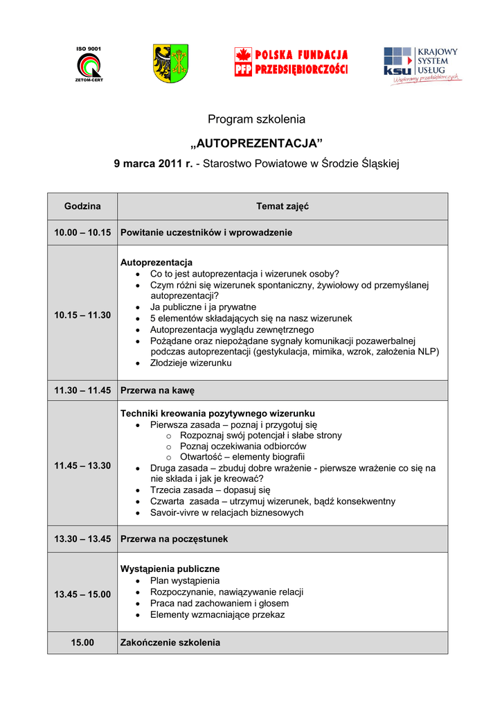 ISO 9001 ZETOM-CERT Program szkolenia „AUTOPREZENTACJA” 9 marca 2011 r. - Starostwo Powiatowe w Środzie Śląskiej Temat zajęć Godzina 10.00 – 10.15 Powitanie uczestników i wprowadzenie 10.15 – 11.30 Autoprezentacja Co to jest autoprezentacja i wizerunek osoby? Czym różni się wizerunek spontaniczny, żywiołowy od przemyślanej autoprezentacji? Ja publiczne i ja prywatne 5 elementów składających się na nasz wizerunek Autoprezentacja wyglądu zewnętrznego Pożądane oraz niepożądane sygnały komunikacji pozawerbalnej podczas autoprezentacji (gestykulacja, mimika, wzrok, założenia NLP) Złodzieje wizerunku 11.30 – 11.45 Przerwa na kawę 11.45 – 13.30 Techniki kreowania pozytywnego wizerunku Pierwsza zasada – poznaj i przygotuj się o Rozpoznaj swój potencjał i słabe strony o Poznaj oczekiwania odbiorców o Otwartość – elementy biografii Druga zasada – zbuduj dobre wrażenie - pierwsze wrażenie co się na nie składa i jak je kreować? Trzecia zasada – dopasuj się Czwarta zasada – utrzymuj wizerunek, bądź konsekwentny Savoir-vivre w relacjach biznesowych 13.30 – 13.45 Przerwa na poczęstunek 13.45 – 15.00 Wystąpienia publiczne Plan wystąpienia Rozpoczynanie, nawiązywanie relacji Praca nad zachowaniem i głosem Elementy wzmacniające przekaz zawodowych) 15.00 Zakończenie szkolenia