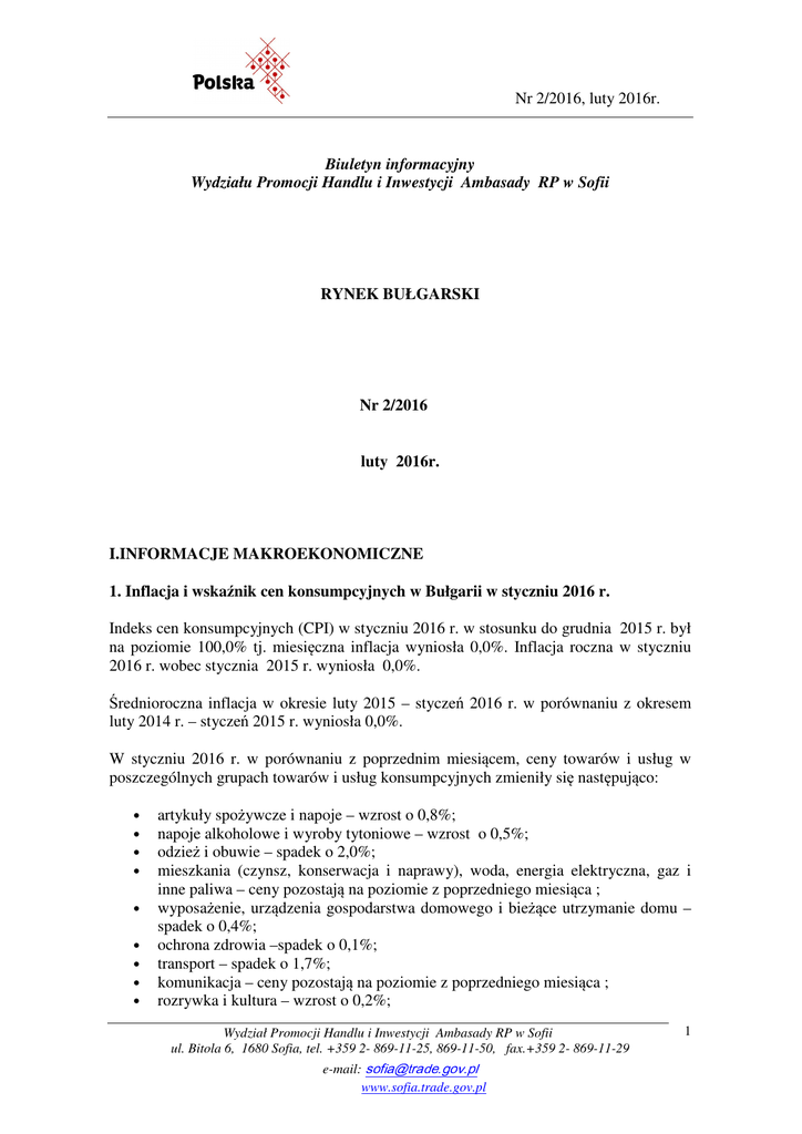 Nr 2/2016, luty 2016r. Biuletyn informacyjny Wydziału Promocji Handlu i Inwestycji Ambasady RP w Sofii RYNEK BUŁGARSKI Nr 2/2016 luty 2016r. I.INFORMACJE MAKROEKONOMICZNE 1. Inflacja i wskaźnik cen konsumpcyjnych w Bułgarii w styczniu 2016 r. Indeks cen konsumpcyjnych (CPI) w styczniu 2016 r. w stosunku do grudnia 2015 r. był na poziomie 100,0% tj. miesięczna inflacja wyniosła 0,0%. Inflacja roczna w styczniu 2016 r. wobec stycznia 2015 r. wyniosła 0,0%. Średnioroczna inflacja w okresie luty 2015 – styczeń 2016 r. w porównaniu z okresem luty 2014 r. – styczeń 2015 r. wyniosła 0,0%. W styczniu 2016 r. w porównaniu z poprzednim miesiącem, ceny towarów i usług w poszczególnych grupach towarów i usług konsumpcyjnych zmieniły się następująco: • • • • • • • • • artykuły spożywcze i napoje – wzrost o 0,8%; napoje alkoholowe i wyroby tytoniowe – wzrost o 0,5%; odzież i obuwie – spadek o 2,0%; mieszkania (czynsz, konserwacja i naprawy), woda, energia elektryczna, gaz i inne paliwa – ceny pozostają na poziomie z poprzedniego miesiąca ; wyposażenie, urządzenia gospodarstwa domowego i bieżące utrzymanie domu – spadek o 0,4%; ochrona zdrowia –spadek o 0,1%; transport – spadek o 1,7%; komunikacja – ceny pozostają na poziomie z poprzedniego miesiąca ; rozrywka i kultura – wzrost o 0,2%; Wydział Promocji Handlu i Inwestycji Ambasady RP w Sofii ul. Bitola 6, 1680 Sofia, tel. +359 2- 869-11-25, 869-11-50, fax.+359 2- 869-11-29 e-mail: [email protected] www.sofia.trade.gov.pl 1 Nr 2/2016, luty 2016r. • • • edukacja –spadek o 0,1%; restauracje i hotele – wzrost o 0,3%; różne towary i usługi – spadek o 1,1% W styczniu 2016r. wzrosły ceny następujących produktów spożywczych: ryżu – o 0,1%,˛mąki – o 0,8%, chleba ,,Dobrudża” – o 0,3%, mięsa wieprzowego – o 0,3%, kiełbas o krótkiej trwałości – o 0,7%, mleka – o 0,1%, sera żółtego – o 0,1%, masła – o 2,6%, oleju roślinnego – o 0,6%, jabłek – o 0,6%, pomidorów – o 15,0%, ogórków – o 0,8%, marchwi – o 4,7%, cebuli – o 2,8%, ziemniaków – o 2,7%, fasoli i soczewicy – odpowiednio 0,6% i 5,6%, cukru – o 0,7%, przypraw ze świeżych warzyw – o 2,9%, napojów gazowanych – o 1,0%, kawy – o 1,3%, rakii – o 0,4%, wina – o 0,6%, i in. W styczniu 2016 r. zmniejszyły się ceny następujących produktów spożywczych: suchych wyrobów cukierniczych – o 0,8%, makaronów – o 0,5%, mięsa z bydła – o 2,5%, mięsa z drobiu – o 0,4%, mięsa mielonego – o 0,5%, sera białego – o 0,4%, jajek – o 0,8%, margaryny – o 1,6%, owoców cytrusowych i południowych – o 0,1%, przypraw z suszonych warzyw – o 0,2%, gotowych artykułów spożywczych – o 3,4%, wody mineralnej – o 0,4%, piwa – o 0,2%, i in. W odniesieniu do towarów nieżywnościowych i usług w styczniu 2016 r. odnotowano wzrost cen w przypadku: papierosów – o 0,6%, czyszczenia chemicznego – o 0,8%, lodówek i zamrażalek – o 0,7%, instalacji klimatycznych – o 0,9%, pralek i zmywarek – o 0,8%, opłat drogowych /winietki/ - o 47,4%, kina, teatru, koncertów – o 1,1%, usług kompleksowych dotyczących wypoczynku i podróży turystycznych w Bułgarii – o 0,3%, usług gastronomicznych – o 0,2%, produktów higieny osobistej i kosmetyczne – o 1,0%, i in. W styczniu 2016 r. odnotowano spadek cen w odniesieniu do towarów nieżywnościowych i usług w następujących grupach: odzież i obuwie - odpowiednio o 1,6% i 2,9%, paliwo gazowe i ciekłe na potrzeby gospodarstw domowych – odpowiednio o 2,3% i 6,5%, meble – o 0,3%, proszki do prania – o 2,1%, olej napędowy – o 6,1%, benzyna A95H – o 3,6%, benzyna A98H – o 3,8%, gaz propan - butan dla prywatnych środków transportu – o 2,1%, metan – o 0,2%, pasażerski transport lotniczy – o 9,8%, i in. W styczniu 2016 r. odnotowano spadek cen wyrobów farmaceutycznych o 0,1%, natomiast ceny usług lekarskich i stomatologicznych wzrosły odpowiedni o 0,1%. Zharmonizowany wskaźnik cen konsumpcyjnych (HICP) według wstępnych danych NSI za styczeń 2016 r. w porównaniu ze styczniem 2015 r. wyniósł 99,9%, tj. miesięczna inflacja wyniosła minus 0,1%. Inflacja roczna w styczniu 2016 r. wobec stycznia 2015 r. wyniosła minus 0,3%. Średnioroczna inflacja w okresie luty 2015 – styczeń 2016 r. w porównaniu z okresem luty 2014 – styczeń 2015 r. wyniosła minus 0,9%. Według HICP w styczniu 2016 r. w porównaniu z poprzednim miesiącem, ceny towarów i usług w grupach konsumpcyjnych zmieniły się następująco: Wydział Promocji Handlu i Inwestycji Ambasady RP w Sofii ul. Bitola 6, 1680 Sofia, tel. +359 2- 869-11-25, 869-11-50, fax.+359 2- 869-11-29 e-mail: [email protected] www.sofia.trade.gov.pl 2 Nr 2/2016, luty 2016r. • • • • • • • • • • • • artykuły spożywcze i napoje – wzrost o 0,7%; napoje alkoholowe i wyroby tytoniowe – wzrost o 0,4%; odzież i obuwie – spadek o 1,7%; mieszkania (czynsz, konserwacja i naprawy), woda, energia elektryczna, gaz i inne paliwa – ceny pozostają na poziomie z poprzedniego miesiąca; meble, sprzęt gospodarstwa domowego i bieżące utrzymanie domu – wzrost o 0,1%; ochrona zdrowia – spadek o 0,1%; transport – spadek o 1,5%; komunikacja – ceny pozostają na poziomie z poprzedniego miesiąca; rozrywka i kultura – wzrost o 0,1%; edukacja – spadek o 0,1%; restauracje i hotele – wzrost o 0,6%; różne towary i usługi – spadek o 1,2% Źródło: Krajowy Instytut Statystyczny (NSI) (www.nsi.bg). 2. Produkcja budowlana w Bułgarii w grudniu 2015 r. Według wstępnych danych z Krajowego Instytutu Statystycznego RB, w grudniu 2015 r. wskaźnik produkcji w sektorze budownictwa, obliczony na podstawie danych wyrównanych sezonowo, zwiększył się o 0,1% w porównaniu z poprzednim miesiącem. W stosunku do analogicznego miesiąca 2014 r., dane skorygowane kalendarzowo wykazały wzrost produkcji budowla