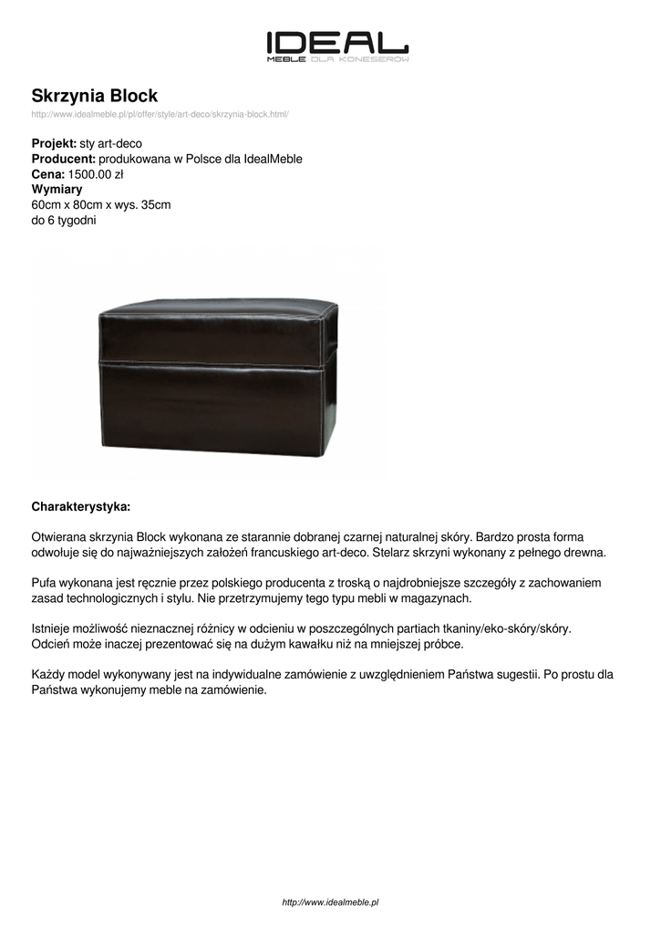 Skrzynia Block http://www.idealmeble.pl/pl/offer/style/art-deco/skrzynia-block.html/ Projekt: sty art-deco Producent: produkowana w Polsce dla IdealMeble Cena: 1500.00 zł Wymiary 60cm x 80cm x wys. 35cm do 6 tygodni Charakterystyka: Otwierana skrzynia Block wykonana ze starannie dobranej czarnej naturalnej skóry. Bardzo prosta forma odwołuje się do najważniejszych założeń francuskiego art-deco. Stelarz skrzyni wykonany z pełnego drewna. Pufa wykonana jest ręcznie przez polskiego producenta z troską o najdrobniejsze szczegóły z zachowaniem zasad technologicznych i stylu. Nie przetrzymujemy tego typu mebli w magazynach. Istnieje możliwość nieznacznej różnicy w odcieniu w poszczególnych partiach tkaniny/eko-skóry/skóry. Odcień może inaczej prezentować się na dużym kawałku niż na mniejszej próbce. Każdy model wykonywany jest na indywidualne zamówienie z uwzględnieniem Państwa sugestii. Po prostu dla Państwa wykonujemy meble na zamówienie. http://www.idealmeble.pl http://www.idealmeble.pl Zdjęcia produktu: http://www.idealmeble.pl Powered by TCPDF (www.tcpdf.org)