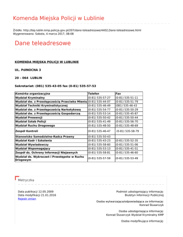 Komenda Miejska Policji w Lublinie Źródło: http://bip.lublin.kmp.policja.gov.pl/207/dane-teleadresowe/4402,Dane-teleadresowe.html Wygenerowano: Sobota, 4 marca 2017, 08:08 Dane teleadresowe KOMENDA MIEJSKA POLICJI W LUBLINIE UL. PółNOCNA 3 20 – 064 LUBLIN Sekretariat: (081) 535-43-05 fax (0-81) 535-57-53 Komórka organizacyjna Wydział Kryminalny Wydział dw. z Przestępczością Przeciwko Mieniu Wydział Techniki Kryminalistycznej Wydział dw. z Przestępczością Narkotykową Wydział dw. z Przestępczością Gospodarczą Wydział Prewencji Wydział Sztab Policji Wydział Ruchu Drogowego Telefon (0-81) 535-57-27 (0-81) 535-44-07 (0-81) 535-46-49 (0-81) 535-54-77 (0-81) 535-53-14 (0-81) 535-50-42 (0-81) 535-41-49 (0-81) 535-48-50 Fax (0-81) 535-51-11 (0-81) 535-51-79 (081) 535-46-43 (0-81) 535-50-29 (0-81) 535-45-87 (0-81) 535-50-44 (0-81) 535-56-70 (0-81) 535-48-69 Zespół Kontroli (0-81) 535-46-47 (0-81) 535-58-79 Stanowisko Samodzielne-Radca Prawny Wydział Kadr i Szkolenia Wydział Wywiadowczy Wydział Wspomagający (0-81) 535-50-43 (0-81) 535-43-23 (0-81) 535-58-60 (0-81) 535-53-13 (0-81) 535-52-35 (0-81) 535-51-06 (0-81) 535-41-51 Zespół ds. Ochrony Informacji Niejawnych (0-81) 535-58-81 (0-81) 535-46-60 Wydział ds. Wykroczeń i Przestępstw w Ruchu Drogowym (0-81) 535-57-59 (0-81) 535-53-49 Metryczka Data publikacji 12.05.2009 Data modyfikacji 21.01.2016 Rejestr zmian Podmiot udostępniający informację: Biuletyn Informacji Publicznej Osoba wytwarzająca/odpowiadająca za informację: Konrad Ślusarczyk Osoba udostępniająca informację: Konrad Ślusarczyk Wydział Kryminalny KMP Osoba modyfikująca informację: Konrad Ślusarczyk