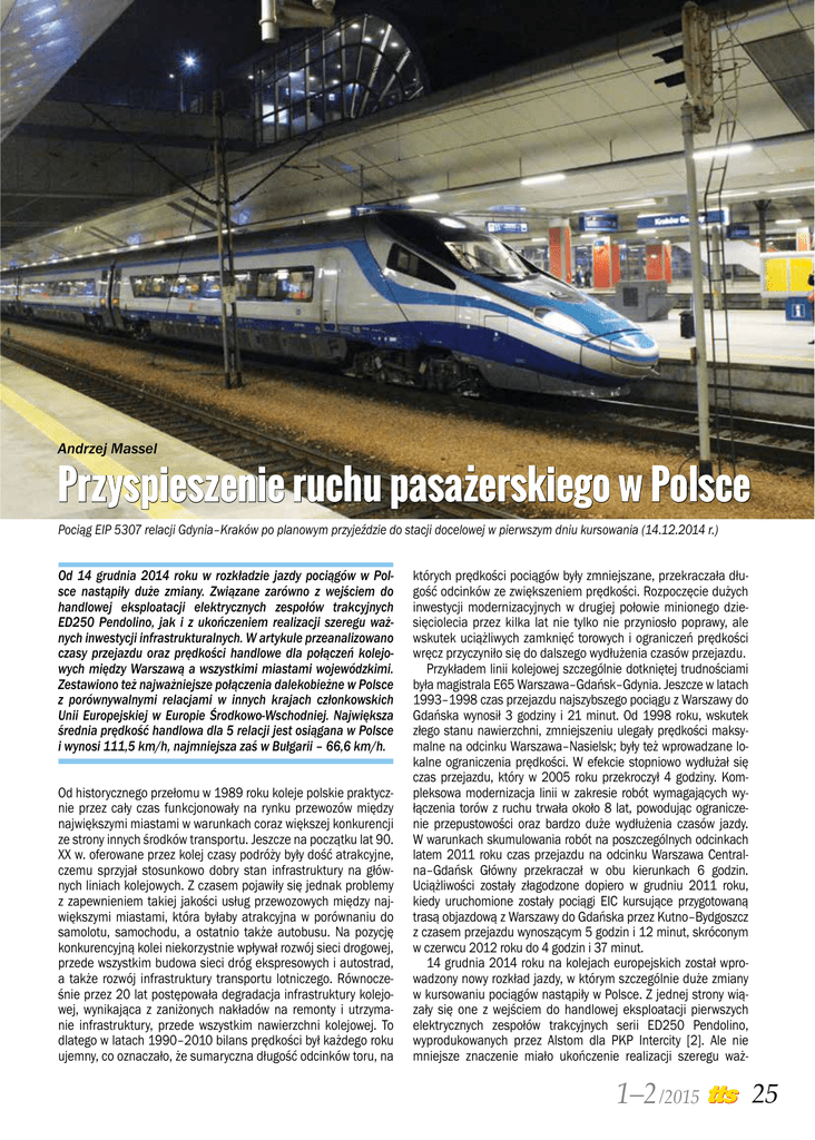 Andrzej Massel Przyspieszenie ruchu pasażerskiego w Polsce Pociąg EIP 5307 relacji Gdynia–Kraków po planowym przyjeździe do stacji docelowej w pierwszym dniu kursowania (14.12.2014 r.) Od 14 grudnia 2014 roku w rozkładzie jazdy pociągów w Polsce nastąpiły duże zmiany. Związane zarówno z wejściem do handlowej eksploatacji elektrycznych zespołów trakcyjnych ED250 Pendolino, jak i z ukończeniem realizacji szeregu ważnych inwestycji infrastrukturalnych. W artykule przeanalizowano czasy przejazdu oraz prędkości handlowe dla połączeń kolejowych między Warszawą a wszystkimi miastami wojewódzkimi. Zestawiono też najważniejsze połączenia dalekobieżne w Polsce z porównywalnymi relacjami w innych krajach członkowskich Unii Europejskiej w Europie Środkowo-Wschodniej. Największa średnia prędkość handlowa dla 5 relacji jest osiągana w Polsce i wynosi 111,5 km/h, najmniejsza zaś w Bułgarii – 66,6 km/h. Od historycznego przełomu w 1989 roku koleje polskie praktycznie przez cały czas funkcjonowały na rynku przewozów między największymi miastami w warunkach coraz większej konkurencji ze strony innych środków transportu. Jeszcze na początku lat 90. XX w. oferowane przez kolej czasy podróży były dość atrakcyjne, czemu sprzyjał stosunkowo dobry stan infrastruktury na głównych liniach kolejowych. Z czasem pojawiły się jednak problemy z zapewnieniem takiej jakości usług przewozowych między największymi miastami, która byłaby atrakcyjna w porównaniu do samolotu, samochodu, a ostatnio także autobusu. Na pozycję konkurencyjną kolei niekorzystnie wpływał rozwój sieci drogowej, przede wszystkim budowa sieci dróg ekspresowych i autostrad, a także rozwój infrastruktury transportu lotniczego. Równocześnie przez 20 lat postępowała degradacja infrastruktury kolejowej, wynikająca z zaniżonych nakładów na remonty i utrzymanie infrastruktury, przede wszystkim nawierzchni kolejowej. To dlatego w latach 1990–2010 bilans prędkości był każdego roku ujemny, co oznaczało, że sumaryczna długość odcinków toru, na których prędkości pociągów były zmniejszane, przekraczała długość odcinków ze zwiększeniem prędkości. Rozpoczęcie dużych inwestycji modernizacyjnych w drugiej połowie minionego dziesięciolecia przez kilka lat nie tylko nie przyniosło poprawy, ale wskutek uciążliwych zamknięć torowych i ograniczeń prędkości wręcz przyczyniło się do dalszego wydłużenia czasów przejazdu. Przykładem linii kolejowej szczególnie dotkniętej trudnościami była magistrala E65 Warszawa–Gdańsk–Gdynia. Jeszcze w latach 1993–1998 czas przejazdu najszybszego pociągu z Warszawy do Gdańska wynosił 3 godziny i 21 minut. Od 1998 roku, wskutek złego stanu nawierzchni, zmniejszeniu ulegały prędkości maksymalne na odcinku Warszawa–Nasielsk; były też wprowadzane lokalne ograniczenia prędkości. W efekcie stopniowo wydłużał się czas przejazdu, który w 2005 roku przekroczył 4 godziny. Kompleksowa modernizacja linii w zakresie robót wymagających wyłączenia torów z ruchu trwała około 8 lat, powodując ograniczenie przepustowości oraz bardzo duże wydłużenia czasów jazdy. W warunkach skumulowania robót na poszczególnych odcinkach latem 2011 roku czas przejazdu na odcinku Warszawa Centralna–Gdańsk Główny przekraczał w obu kierunkach 6 godzin. Uciążliwości zostały złagodzone dopiero w grudniu 2011 roku, kiedy uruchomione zostały pociągi EIC kursujące przygotowaną trasą objazdową z Warszawy do Gdańska przez Kutno–Bydgoszcz z czasem przejazdu wynoszącym 5 godzin i 12 minut, skróconym w czerwcu 2012 roku do 4 godzin i 37 minut. 14 grudnia 2014 roku na kolejach europejskich został wprowadzony nowy rozkład jazdy, w którym szczególnie duże zmiany w kursowaniu pociągów nastąpiły w Polsce. Z jednej strony wiązały się one z wejściem do handlowej eksploatacji pierwszych elektrycznych zespołów trakcyjnych serii ED250 Pendolino, wyprodukowanych przez Alstom dla PKP Intercity [2]. Ale nie mniejsze znaczenie miało ukończenie realizacji szeregu waż- 1–2 /2015 25 Systemy transportowe zostało przedstawione w nowym ujęciu. W pierwszej kolejności przeanalizowano połączenia kolejowe Warszawy ze wszystkimi miastami wojewódzkimi. Następnie zbadano relację między charakterystyką infrastruktury a uzyskiwanymi prędkościami handlowymi dla 5 najważniejszych połączeń. Zestawiono też najważniejsze połączenia dalekobieżne w Polsce z porównywalnymi relacjami w innych krajach członkowskich Unii Europejskiej w Europie Środkowo-Wschodniej. Połączenia Warszawy z miastami wojewódzkimi Ocenę czasów przejazdu dla połączeń kolejowych między Warszawą a miastami wojewódzkimi przeprowadzono, przyjmując następujące założenia: Pociąg 54000 Sobieski relacji Gdynia–Wiedeń w rejonie Ciechanowa. Fot. K. Waszkiewicz ¡¡ analizie poddano połączenia z Warszawy do 17 miast będących siedzibami urzędów wojewódzkich lub marszałkowskich (oznacza to, że nych inwestycji infrastrukturalnych lub ich istotnych etapów. Bez w przypadku województwa kujawsko-pomorskiego uwzględwątpienia najważniejszymi z nich są modernizacja linii E65 Warszawa–Gdańsk oraz rewitalizacja odcinków Włoszczowa Północ– niono zarówno Toruń, jak i Bydgoszcz, w przypadku wojewódzCzęstochowa Stradom–Fosowskie–Opole Główne, składających twa lubuskiego – Zieloną Górą i Gorzów Wielkopolski); się na tak zwaną łącznicę koniecpolską i zapewniających szybkie ¡¡ w porównaniach uwzględniono główne dworce kolejowe w popołączenie Warszawy z Wrocławiem. Na Centralnej Magistrali Koszczególnych miastach (za wyjątkiem Łodzi, dla której – z uwalejowej, jako pierwszej linii na kolejach polskich, podjęty został gi na trwającą budowę nowego dworca Łódź Fabryczna – poruch z wykorzystaniem systemu bezpiecznej kontroli jazdy pociądano czasy przejaz