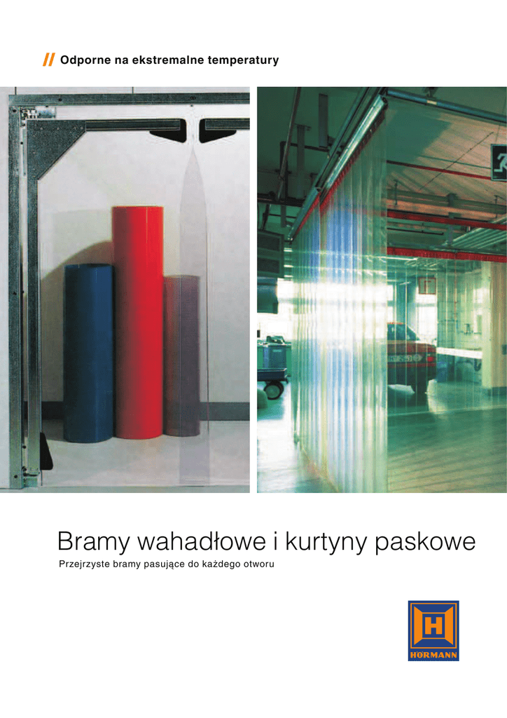 ¬¬ Odporne na ekstremalne temperatury Bramy wahadłowe i kurtyny paskowe Przejrzyste bramy pasujące do każdego otworu PTF Bramy wahadłowe Elastyczne rozwiązanie Elastyczne rozwiązanie Bramy wahadłowe firmy Hörmann są przeznaczone do zastosowania wewnątrz budynków do normalnego natężenia ruchu wózków widłowych. Dla ułatwienia montażu dostarczane bramy wahadłowe są w całości zmontowane fabrycznie. Wymiary otworów Brama powinna być dwa razy szersza i 500 mm wyższa niż transportowany towar. Wyposażenie dodatkowe • płyta bramy z wkładem z siatki odpornej na rozerwanie • kolorowa płyta bramy z pełnym wkładem tkaninowym odpornym na rozerwanie i przezroczystą sekcją • płyta bramy wykonana z PCV o grubości 10 mm • płyta bramy nadaje się do zastosowania w mroźniach, jest odporna na temperaturę od -40°C do +40°C • zabezpieczenie antykolizyjne z pełnym wkładem tkaninowym odpornym na rozerwanie • blokada elektromagnetyczna ze wspornikiem kątowym, ocynkowana • w ścianach kartonowo-gipsowywch lub betonie komórkowym 2- lub 3-częściowa ościeżnica obejmująca do montażu Specjalne wersje wykonania • bramy wahadłowe PFT w wersji V2A (stal nierdzewna) • bramy wahadłowe z napędem Inne specjalne wersje wykonania na zapytanie Dane techniczne Konstrukcja Elementy z ocynkowanej stali Profile ramy 3 mm (ciężka wersja przemysłowa), 2,5 mm (półciężka wersja przemysłowa) Płyta bramy Miękki i przezroczysty PCV, grubość ok. 7 mm, dodatkowe wzmocnienia naroży z tworzywa sztucznego jako zabezpieczenie przed rozerwaniem Ościeżnica ciężka wersja przemysłowa rofil kołpakowy 165 × 20 mm p płaskownik 80 × 8 mm półciężka wersja przemysłowa profil kołpakowy 110 × 20 mm płaskownik 60 × 6 mm fabrycznie wywiercone otwory do montażu na kołki rozporowe Zakres wymiarów: ciężka wersja przemysłowa półciężka wersja przemysłowa szerokość wysokość szerokość wysokość do do do do 3750 mm 4500 mm 3000 mm 3000 mm Obsługa ręczna, siła zamykania regulowana do 50 Nm urządzenie zamykające z regulowaną siłą zamykania, wbudowane zintegrowane w profilu ramy, kąt otwarcia bramy obustronnie 90° Obciążenie wiatrowe brak SVF Kurtyny paskowe Oszczędność miejsca Minimalne straty energii Kurtyny paskowe firmy Hörmann nadają się szczególnie jako niedrogie zamknięcia dużych otworów w halach. Te wytrzymałe pasy wykonane z PCV stanowią niemal szczelne zamknięcie i otwierają się tylko na szerokość pojazdu lub ładunku. Dzięki temu straty energii cieplnej są ograniczone do minimum, nawet przy dużym natężeniu ruchu. Jest to energooszczędne rozwiązanie. Duża przejrzystość kurtyn paskowych poprawia warunki oświetleniowe wewnątrz i pozwala zmniejszyć koszty energii elektrycznej zużywanej na oświetlenie. Kurtyny te nadają się do zastosowania w mroźniach oraz przemyśle spożywczym i farmaceutycznym. System klipsów i prowadnic Dzięki temu systemowi montaż kurtyn paskowych jest szczególnie łatwy. Klips z tworzywa sztucznego wraz z przynitowanym do niego paskiem z PCV zawiesza się na profilowanej szynie aluminiowej bez pomocy narzędzi. Klipsy i pasy PCV są dostarczane jako zestaw gotowy do montażu. Dzięki temu pasy można w razie potrzeby łatwo zdjąć i wymienić. Dane techniczne Wersje wykonania • Szyna aluminiowa Pasy PCV są zawieszane bezpośrednio na szynie aluminiowej i mogą się swobodnie odchylać o 180°. • Szyna aluminiowa rozsuwana na boki Szyna aluminiowa wraz z pasami PCV jest mocowana do prowadnicy za pomocą mechanizmów rolkowych. Kurtynę można rozsuwać na boki pociągając za linkę. Opcjonalnie istnieje możliwość wyposażenia prowadnicy w element wygięty pod kątem 90° oraz odpowiedni mechanizm rolkowy do prowadzenia kurtyny po łuku. Konstrukcja Klips z tworzywa sztucznego z przynitowanym paskiem PCV, aluminiowa szyna nośna, mechanizmy rolkowe w prowadnicy z rolkami osadzonymi na łożysku kulkowym Zakres wymiarów (w mm) Wyposażenie dodatkowe • Osłona światłoszczelna do stanowisk spawalniczych: spawanie S7 gazowe (zielona) lub S9 łukowe (czarna), pasy 300 x 3 mm • Materiał PCV do zastosowania w mroźniach, odporny na temperaturę do -35°C, temperatura pękania pod wpływem zimna -55°C (zgodnie z DIN 53372) Materiał Specjalna wersja wykonania • napęd elektryczny do wersji rozsuwanej na boki (na zapytanie) maks. szerokość montażu 200 300 Grubość materiału 2 3 4 maks. wysokość montażu, wewnątrz 2000 3000 – 4000 3000 – 6000 – 2000 – 2500 3000 – 4500 maks. wysokość montażu, na zewnątrz 400 10000 Większe szerokości na zapytanie, pasy PCV z pełnym przekryciem 100% lub przekryciem częściowym od 25% do 75%. (ÙRMANNå+'å!MSHAUSENå (ÙRMANNå+'å!NTRIEBSTECHNIKå (ÙRMANNå+'å"RANDISå (ÙRMANNå+'å"ROCKHAGEN (ÙRMANNå+'å$ISSENå (ÙRMANNå+'å%CKELHAUSENå (ÙRMANNå+'å&REISENå (ÙRMANNå+'å)CHTERSHAUSEN Hörmann KG Werne Hörmann Genk NV, Belgia Hörmann Beijing, Chiny Hörmann Gadco LLC, Vonore TN, USA Grupa Hörmann oferuje wszystkie istotne elementy stolarki budowlanej BRAMY GARAŻOWE z jednej ręki- jako jedyny producent na międzynarodowym rynku. NAPĘDY (7YDANIE 03.08) å PL/P - - $RUK 06.08 Hörmann: Jakość bez kompromisów Produkowane są one w wysoko wyspecjalizowanych zakładach, zgodnie BRAMY PRZEMYSŁOWE z najnowszymi osiągnięciami techniki. Rozbudowana sieć dystrybucji TECHNIKA PRZEŁADUNKU że Hörmann jest solidnym partnerem w zakresie stolarki budowlanej, DRZWI której jakość nie dopuszcza żadnych kompromisów. OŚCIEŻNICE OFICJALNY SPONSOR PIŁKARSKIEJ REPREZENTACJI POLSKI www.hoermann.com i serwisu w Europie oraz obecność firmy w Ameryce i Chinach sprawia,