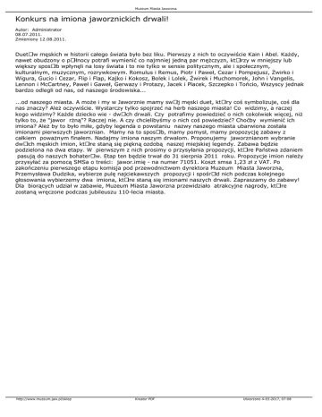 Muzeum Miasta Jaworzna Konkurs na imiona jaworznickich drwali! Autor: Administrator 08.07.2011. Zmieniony 12.08.2011. DuetÃłw męskich w historii całego świata było bez liku. Pierwszy z nich to oczywiście Kain i Abel. Każdy, nawet obudzony o pÃłłnocy potrafi wymienić co najmniej jedną par mężczyzn, ktÃłrzy w mniejszy lub większy sposÃłb wpłynęli na losy świata i to nie tylko w sensie politycznym, ale i społecznym, kulturalnym, muzycznym, rozrywkowym. Romulus i Remus, Piotr i Paweł, Cezar i Pompejusz, Żwirko i Wigura, Gucio i Cezar, Flip i Flap, Kajko i Kokosz, Bolek i Lolek, Żwirek i Muchomorek, John i Vangelis, Lennon i McCartney, Paweł i Gaweł, Gerwazy i Protazy, Jacek i Placek, Szczepko i Tońcio, Wszyscy jednak bardzo odlegli od nas, od naszego środowiska... ...od naszego miasta. A może i my w Jaworznie mamy swÃłj męski duet, ktÃłry coś symbolizuje, coś dla nas znaczy? Ależ oczywiście. Wystarczy tylko spojrzeć na herb naszego miasta! Co widzimy, a raczej kogo widzimy? Każde dziecko wie - dwÃłch drwali. Czy potrafimy powiedzieć o nich cokolwiek więcej, niż tylko to, że "jawor rżną"? Raczej nie. A czy chcielibyśmy o nich coś powiedzieć? Choćby wymienić ich imiona? Ależ by to było miłe, gdyby legenda o powstaniu nazwy naszego miasta ubarwiona została imionami pierwszych jaworznian. Mamy na to sposÃłb, mamy pomysł, mamy propozycję zabawy z całkiem poważnym finałem. Nadajmy imiona naszym drwalom. Proponujemy jaworznianom wybranie dwÃłch męskich imion, ktÃłre staną się piękną ozdobą naszej miejskiej legendy. Zabawa będzie podzielona na dwa etapy. W pierwszym z nich prosimy o przysyłania propozycji, ktÃłre Państwa zdaniem pasują do naszych bohaterÃłw. Etap ten będzie trwał do 31 sierpnia 2011 roku. Propozycje imion należy przysyłać za pomocą SMSa o treści: jawor.imię - na numer 71051. Koszt smsa 1,23 zł z VAT. Po zakończeniu pierwszego etapu komisja pod przewodnictwem dyrektora Muzeum Miasta Jaworzna, Przemysława Dudzika, wybierze pulę najciekawszych propozycji i spośrÃłd nich podczas kolejnego głosowania wybierzemy dwa imiona, ktÃłre staną się imionami naszych drwali. Zapraszamy do zabawy! Dla biorących udział w zabawie, Muzeum Miasta Jaworzna przewidziało atrakcyjne nagrody, ktÃłre zostaną wręczone podczas jubileuszu 110-lecia miasta. http://www.muzeum.jaw.pl/sklep Kreator PDF Utworzono 4-03-2017, 07:08