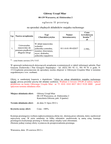 Główny Urząd Miar 00-139 Warszawa, ul. Elektoralna 2 ogłasza II przetarg na sprzedaż zbędnych składników majątku ruchomego Lp. Nazwa urządzenia 1. 1) Uniwersalne stanowisko do pomiaru prędkości i długości drogi Typ/ Charakterystyka W skład stanowiska wchodzi: jednostka centralna, monitor, klawiatura, mysz, drukarka, jednostka napędowa Numer inwentarzowy Cena wywoławcza brutto 1) zł 011-8-01-99-02837 2.590,- – cena brutto zawiera 23% VAT. W sprawach technicznych dotyczących urządzenia wymienionych w tabeli informacji udziela: Pani Grażyna Żochowska i Pan Grzegorz Stepanajtys - tel. (022) 581 92 11, 581 95 91 w godz. 915.Urządzenie przeznaczone do sprzedaży można obejrzeć w Głównym Urzędzie Miar w terminie uzgodnionym z ww. osobami. Oferty w zamkniętej kopercie z dopiskiem: ”oferta na zakup składników majątku ruchomego GUM” proszę przesłać pocztą lub składać osobiście. Wadium w kwocie 259,00 zł należy wpłacić przelewem na konto Głównego Urzędu Miar nr 75 1010 1010 0037 0813 9120 0000 przed upływem terminu składania ofert. Miejsce składania ofert: Główny Urząd Miar 00-139 Warszawa, ul. Elektoralna 2 Kancelaria Główna, pok. 8 (parter) Termin składania ofert: do dnia 31 lipca 2012 r. Kryteria oceny ofert: Cena - 100%. Komisja przetargowa wybiera najkorzystniejszą ofertę tzn. złożoną przez oferenta, który zaoferował najwyższą cenę. W razie ustalenia, że kilku oferentów zaoferowało tę samą cenę, komisja przetargowa kontynuuje przetarg w formie aukcji między tymi oferentami. Złożenie jednej ważnej oferty wystarcza do przeprowadzenia przetargu. Warszawa, dnia 29 czerwca 2012 r. ......................................................... ............................., dnia ............................... imię, nazwisko lub nazwa firmy - oferenta ......................................................... adres zamieszkania lub siedziba firmy ......................................................... NIP ............................................................. Oferta dla Głównego Urzędu Miar W odpowiedzi na ogłoszenie o przetargu na zakup składnika mienia ruchomego o nazwie Uniwersalne stanowisko do pomiaru prędkości i długości drogi poz. wykazu ........ za kwotę brutto ................................... zł (słownie zł: ..................................... ......................................................................................................................................................). Oświadczam, że zdobyłem niezbędne informacje na temat oferowanego urządzenia, zapoznałem się z jego stanem technicznym i nie wnoszę żadnych zastrzeżeń. Akceptuję warunki umowy sprzedaży, którą podpiszę w miejscu i terminie określonym przez Sprzedawcę. .............................................. podpis osoby upoważnionej do podejmowania zobowiązań finansowych Umowa nr………….. Zawarta w dniu … 2012 r. w Warszawie, pomiędzy: Skarbem Państwa- Głównym Urzędem Miar z siedzibą przy ul. Elektoralnej 2 w Warszawie, 01139 Warszawa, NIP…………., REGON ………………, zwanym dalej „Sprzedawcą”, reprezentowanym przez Roberta Ziółkowskiego – zastępującego Dyrektora Generalnego Urzędu a ………………………………………………………………………………………………………… ………………………………………………………………………………………………………… ………………………………………………………………………………… (nazwa, adres, nr KRS oferenta lub nr zaświadczenia do ewidencji działalności gospodarczej, nr i seria dowodu tożsamości, NIP, REGON), zwanym dalej: „Kupującym”, w wyniku dokonanego przez Sprzedawcę wyboru oferty w trybie przetargu publicznego prowadzonego na podstawie rozporządzenia Rady Ministrów z dnia 21 maja 2010 r. w sprawie sposobu i trybu gospodarowania składnikami rzeczowymi majątku ruchomego, w który wyposażone są jednostki budżetowe (Dz. U. Nr 114, poz. 761), została zawarta umowa o następującej treści: §1 Sprzedawca sprzedaje a Kupujący nabywa ………………………………………………………………………………………………………… ………………………………………………………………………………………………………… ………………………………………………………………………………… (przedmiot umowy – nr inwentaryzacyjny) za cenę brutto: ………………… zł (słownie zł:………………………………………………). §2 1. Kupujący zapłaci Sprzedawcy cenę, o której mowa w § 1 w terminie nie dłuższym niż 7 dni od dnia podpisania niniejszej umowy. 2. Kupujący dokona płatności za przedmiot umowy na podstawie wystawionej przez Sprzedawcę faktury VAT, według swojego wyboru: przelewem na rachunek Sprzedawcy (nr …………..) lub w kasie w siedzibie Sprzedawcy. 3. Sprzedawca zastrzega sobie własność przedmiotu umowy do chwili zapłaty ceny w pełnej wysokości. §3 1. Wydanie przedmiotu umowy Kupującemu nastąpi w siedzibie Sprzedawcy niezwłocznie po dokonaniu przez niego płatności, zgodnie z § 2 ust. 2 i przedstawieniu dowodu zapłaty. 2. Odbiór przedmiotu umowy będzie dokonany w terminie nie dłuższym niż 7 dni od dnia podpisania umowy. 3. Kupujący dokona odbioru przedmiotu umowy na własny koszt. §4 1.Wadium złożone przez Kupującego zalicza się na poczet ceny. 2. Wadium nie podlega zwrotowi w przypadku, gdy oferent, który wygrał przetarg, uchylił się od zawarcia umowy sprzedaży. §5 Sprzedawca może odstąpić od umowy jeżeli: a) Kupujący nie zapłacił i nie odebrał przedmiotu umowy w terminie wskazanym przez Sprzedawcę, b) Wystąpiła istotna zmiana okoliczności powodująca, że wykonanie umowy nie leży w interesie publicznym, czego nie można było przewidz