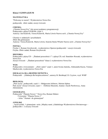 Klasa I GIMNAZJUM MATEMATYKA "Policzmy to razem", Wydawnictwo Nowa Era podręcznik, zbiór zadań, zeszyt ćwiczeń. CHEMIA „Chemia Nowej Ery” (do nowej podstawy programowej) Podręcznik z płytą CD-ROM, część 1. Autorzy: Jan Kulawik, Teresa Kulawik, Maria Litwin Nazwa serii: „Chemia Nowej Ery” Chemia w zadaniach i przykładach. Zbiór dla gimnazjum Autorzy: Teresa Kulawik, Maria Litwin, Szarota Styka-Wlazło Nazwa serii: „Chemia Nowej Ery” FIZYKA Fizyka 1, Roman Grzybowski , wydawnictwo Operon (podręcznik + zeszyt ćwiczeń) Fizyka. Zbiór zadań, Roman Grzybowski HISTORIA Podręcznik z płytą CD – „Śladami przeszłości 1” z płytą CD, red. Stanisław Roszak, wydawnictwo Nowa Era Zeszyt ćwiczeń – „Śladami przeszłości” klasa I, wydawnictwo Nowa Era WOS Podręcznik z ćwiczeniami – „Dziś i jutro” część 1, autor Iwona Janicka, Aleksandra Kucia, Tomasz Maćkowski, wydawnictwo Nowa Era EDUKACJA DLA BEZPIECZEŃSTWA Podręcznik – „Edukacja dla bezpieczeństwa”, autorzy B. Breitkopf, D. Czyżow, wyd. WSIP BIOLOGIA „Puls życia”, podręcznik, część 1 - Małgorzata Jefimow, Marian Sęktas Puls życia” Zeszyt ćwiczeń, część 1 - Elżbieta Mazurek, Joanna i Jacek Pawłowscy, Anna Zdziennicka GEOGRAFIA Podręcznik " Planeta Nowa1 " Nowa Era, Roman Malarz Ćwiczenia " Planeta Nowa 1" - Atlas " Demart do gimnazjum" J.POLSKI „ Język polski 1 gimnazjum seria „Między nami „Gdańskiego Wydawnictwa Oświatowego – podręcznik i 2 zeszyty ćwiczeń Klasa II GIMNAZJUM 4 osoby MATEMATYKA GWO Matematyka z plusem – podręcznik GWO Matematyka z plusem – zbiór zadań + zeszyt ćwiczeń CHEMIA „Chemia Nowej Ery” (do nowej podstawy programowej) Podręcznik z płytą CD-ROM, część 2 Autorzy: Jan Kulawik, Teresa Kulawik, Maria Litwin Nazwa serii: „Chemia Nowej Ery” FIZYKA Fizyka 2, Roman Grzybowski , wydawnictwo Operon (podręcznik i zeszyt ćwiczeń) HISTORIA Podręcznik z płytą CD – „Śladami przeszłości ” kl. 2 z płytą CD, red. Stanisław Roszak, wydawnictwo Nowa Era Zeszyt ćwiczeń – „Śladami przeszłości” klasa II, wydawnictwo Nowa Era WOS Podręcznik z ćwiczeniami – „Dziś i jutro” część 2, autor Iwona Janicka, Aleksandra Kucia, Tomasz Maćkowski, wydawnictwo Nowa Era BIOLOGIA „Puls życia”, podręcznik, część 2 - Małgorzata Jefimow "Puls życia” Zeszyt ćwiczeń, część 2 - Alicja Kasińska, Ewa Niemczewska-Borowczak, Jacek Pawłowski GEOGRAFIA Podręcznik " Planeta Nowa 2 " Nowa Era, Dawid Szczypiński Ćwiczenia " Planeta Nowa 2" J.POLSKI Język polski 2. Między nami. Podręcznik. Nowa wersja autor: A. Łuczak, E. Prylińska, Język polski 2. Między nami. Zeszyt ćwiczeń. Część 1. Nowa wersja autor: A. Łuczak, E. Prylińska Język polski 2. Między nami. Zeszyt ćwiczeń. Część 2. Nowa wersja autor: A. Łuczak, E. Prylińska J.ANGIELSKI New Exam Connections 4 - podręcznik i ćwiczenia J. NIEMIECKI "AHA- neu 2b" Klasa III GIMNAZJUM 2 osoby MATEMATYKA GWO Matematyka z plusem – GWO Podręcznik+ zbiór zadań Przed egzaminem gimnazjalnym z matematyki od roku 2012. Zbiór zadań otwartych i zamkniętych Wydawnictwo Podkowa CHEMIA „Chemia Nowej Ery” (do nowej podstawy programowej) Podręcznik z płytą CD-ROM. Część 3 FIZYKA Zrozumieć świat. Część 4 Wydawnictwo Zamkor Podręcznik + zeszyt ćwiczeń HISTORIA Podręcznik – „Śladami przeszłości ” kl. 3 z płytą CD, autorzy Stanisław Roszak, Anna Łaszkiewicz, wydawnictwo Nowa Era Skoroszyt gimnazjalisty klasa 3 – „Śladami przeszłości” klasa III, autor Iwona Janicka, wydawnictwo Nowa Era BIOLOGIA „Puls życia”, podręcznik, część 3 - Beata Sągin, Andrzej Boczarowski, Marian Sęktas "Puls życia” Zeszyt ćwiczeń, część 3 - Monika Jaworska, Jolanta Pawłowska, Jacek Pawłowski, Monika Zaleska GEOGRAFIA Podręcznik " Planeta Nowa 3 " Nowa Era, Mariusz Szubert Ćwiczenia " Planeta Nowa 3" J.POLSKI Język polski 3. Między nami. Podręcznik. Nowa wersja autor: A. Łuczak, E. Prylińska, K. Krzemieniewska-Kleban Język polski 3. Między nami. Zeszyt ćwiczeń. Część 1. Nowa wersja autor: A. Łuczak, E. Prylińska J.ANGIELSKI New Oxford Gimnazjum Expert - podręcznik i zeszyt ćwiczeń J.HISZPAŃSKI "Soy Pepe 3" podręcznik + ćwiczenia Wydawnictwo Europa Klasa II GWO Matematyka z plusem – podręcznik GWO Matematyka z plusem – zbiór zadań Klasa III GWO Matematyka z plusem – podręcznik GWO Matematyka z plusem – zbiór zadań GWO Matematyka. Kalendarz gimnazjalisty. Przygotowanie do egzaminu po gimnazjum. Nowa wersja. (termin wydania: listopad 2011 r.)