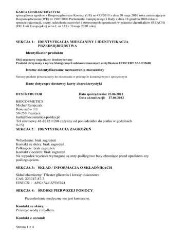 KARTA CHARAKTERYSTYKI sporządzona zgodnie z Rozporządzeniem Komisji (UE) nr 453/2010 z dnia 20 maja 2010 roku zmieniającym Rozporządzeniem (WE) nr 1907/2006 Parlamentu Europejskiego i Rady z dnia 18 grudnia 2006 roku w sprawie rejestracji, oceny, udzielania zezwoleń i stosowanych ograniczeń w zakresie chemikaliów (REACH) (DU Unii Europejskiej seria L nr 133 z 31maja 2010 roku) SEKCJA 1: IDENTYFIKACJA MIESZANINY I IDENTYFIKACJA PRZEDSIĘBIORSTWA Identyfikator produktu Olej arganowy organiczny deodoryzowany Produkt otrzymany z upraw biologicznych udokumentowanych certyfikatem ECOCERT SAS F32600 Istotne zidentyfikowane zastosowania mieszaniny Surowy produkt przeznaczony do stosowania w przemyśle kosmetycznym i spożywczym Dane dotyczące dostawcy karty charakterystyki DYSTRYBUTOR Data sporządzenia: 25.06.2012 Data aktualizacji: 27.06.2012 BIOCOSMETICS Michał Ratajczak Rościszów 1/1 58-250 Pieszyce [email protected] Tel alarmowy 48-881211204 (czynny od poniedziałku do piatku w godzinach 9-15) SEKCJA 2: IDENTYFIKACJA ZAGROŻEŃ Wdychanie: brak zagrożeń Kontakt ze skórą: brak zagrożeń Połknięcie: brak zagrożeń Kontakt z oczami: brak zagrożeń Na wypadek wycieku wymagane są anty-poślizgowe buty chroniące przed upadkiem czy poślizgnięciem. SEKCJA 3: SKŁAD / INFORMACJA O SKŁADNIKACH Skład chemiczny: Triester glicerolu i kwasy tłuszczowe CAS: 223747-87-3 EINECS: - ARGANIA SPINOSA SEKCJA 4: ŚRODKI PIERWSZEJ POMOCY Przeszkolenie medyczne nie jest konieczne. Kontakt ze skórą: Przemyć wodą z mydłem. Kontakt z oczami: Strona 1 z 4 KARTA CHARAKTERYSTYKI sporządzona zgodnie z Rozporządzeniem Komisji (UE) nr 453/2010 z dnia 20 maja 2010 roku zmieniającym Rozporządzeniem (WE) nr 1907/2006 Parlamentu Europejskiego i Rady z dnia 18 grudnia 2006 roku w sprawie rejestracji, oceny, udzielania zezwoleń i stosowanych ograniczeń w zakresie chemikaliów (REACH) (DU Unii Europejskiej seria L nr 133 z 31maja 2010 roku) Przemyć wodą. SEKCJA 5: POSTĘPOWANIE W PRZYPADKU POŻARU Środki gaśnicze Odpowiednie środki gaśnicze: Dwutlenek węgla, gaśnice pianowe lub proszkowe Niewłaściwe środki gaśnicze: Woda Informacje dla straży pożarnej Specjalistyczny sprzęt przeciwpożarowy: Nosić specjalną odzież ochronną oraz aparaty oddechowe chroniące układ oddechowy SEKCJA 6: POSTĘPOWANIE W PRZYPADKU NIEZAMIERZONEGO UWOLNIENIA DO ŚRODOWISKA Indywidualne środki ostrożności, wyposażenie ochronne i procedury w sytuacjach awaryjnych Brak określonych środków ostrożności. Środki ostrożności w zakresie ochrony środowiska Brak określonych środków ostrożności. Metody i materiały zapobiegające rozprzestrzenianiu się skażenia i służące do usuwania skażenia Niewielkie wylewy czy resztki mogą być zbierane za pomocą materiałów tj. tkaniny, trociny. Przemyć je wodą i pościerać wodą z detergentem. Większe wylewy mogą być odpompowane. SEKCJA 7: POSTĘPOWANIE Z MIESZANINĄ I JEJ MAGAZYNOWANIE Warunki przechowywania: Brak specjalnych warunków do przechowywania. Myć jedzenie pod bieżącą wodą. Instrukcje dotyczące miejsca przechowywania: Trzymać w chłodnym miejscu. Przechowywać w oryginalnym dokładnie zamkniętym pojemniku metalowym lub kontenerze aby chronić przed procesem utlenienia. Substancje, których należy unikać: Brak SEKCJA 8: KONTROLA NARAŻENIA / ŚRODKI OCHRONY INDYWIDUALNEJ Nie wymaga się żadnego specjalnego sprzętu ochronnego. Strona 2 z 4 KARTA CHARAKTERYSTYKI sporządzona zgodnie z Rozporządzeniem Komisji (UE) nr 453/2010 z dnia 20 maja 2010 roku zmieniającym Rozporządzeniem (WE) nr 1907/2006 Parlamentu Europejskiego i Rady z dnia 18 grudnia 2006 roku w sprawie rejestracji, oceny, udzielania zezwoleń i stosowanych ograniczeń w zakresie chemikaliów (REACH) (DU Unii Europejskiej seria L nr 133 z 31maja 2010 roku) Najwyższe dopuszczalne stężenie w środowisku pracy zgodnie z obowiązującymi przepisami krajowymi - Rozporządzenie Ministra Pracy i Polityki Socjalnej z dnia 29 listopada 2002 r. w sprawie najwyższych dopuszczalnych stężeń i natężeń czynników szkodliwych dla zdrowia w środowisku pracy (Dz.U.02.217.1833 ze zmianami w Dz.U.2005.212.1769; Dz.U.2007.161.1142; Dz.U.2009.105.873; Dz.U.2010.141.950). SEKCJA 9: WŁAŚCIWOŚCI FIZYCZNE I CHEMICZNE Informacje na temat podstawowych właściwości fizycznych i chemicznych Wygląd czysta ciecz Zapach neutralny Kolor blady . Ważne informacje dla zdrowia, ochrony i środowiska: pH nie dotyczy temperatura zapłonu > 240 oC temperatura samozapłonu >300 oC gęstość względna w 20 oC 0.908-0.918 rozpuszczalność rozpuszczalny w alkoholu oraz eterze lepkość w 20 oC nie określono SEKCJA 10: STABILNOŚĆ I REAKTYWNOŚĆ Stabilność chemiczna W normalnych warunkach stosowania i magazynowania mieszanina jest stabilna. Warunki, których należy unikać: - podgrzewania powyżej temperatury 180 oC ( zastosowanie w przemyśle spożywczym), oraz powyżej temperatury 60 oC ( zastosowanie w kosmetyce) SEKCJA 11: INFORMACJE TOKSYKOLOGICZNE Produkt nie jest toksyczny: zastosowanie w kosmetyce oraz przemyśle spożywczym SEKCJA 12: INFORMACJE EKOLOGICZNE Ekotoksyczność: niska Mobilność w glebie: niska Degradacja: ulega całkowitej biodegradacji ale jest bogaty w DBO SEKCJA 13: POSTĘPOWANIE Z ODPADAMI Olej absorbować za pomocą tkanin, papieru lub trocin albo spalając je. Zabroniony wywóz do środowiska naturalnego. Spalać wg lokalnych regulacji. Odpady z opakowań wg lokalnych regulacji. Strona 3 z 4 KARTA CHARAKTERYSTYKI sporządzona zgodnie z Rozporządzeniem Komisji (UE) nr 453/2010 z dnia 20 maja 2010 roku zmieniającym Rozporządzeniem (WE) nr 1907/2006 Parlamentu Europejskiego i Rady z dnia 18 grudnia 2006 roku w sprawie rejestracji, oceny, udzielania zezwoleń i stosowanych ograniczeń w zakresie chemikaliów (REACH) (DU Unii Europejskiej seria L nr 133 z 31maja 2010 roku) SEKCJA 14: INFORMACJE O TRANSPORCIE Produkt nie sklasyfikowano jako niebezpi
