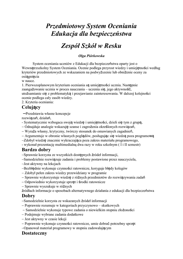 Przedmiotowy System Oceniania Edukacja dla bezpieczeństwa Zespół Szkół w Resku Olga Piórkowska System oceniania uczniów z Edukacji dla bezpieczeństwa oparty jest o Wewnątrzszkolny System Oceniania. Ocenie podlega przyrost wiedzy i umiejętności według kryteriów przedmiotowych ze wskazaniem na podwyższenie lub obniżenie oceny za osiągnięcia w nauce. 1. Pierwszoplanowym kryterium oceniania są umiejętności ucznia. Następnie zaangażowanie ucznia w proces nauczania – uczenia się, jego aktywność, utożsamianie się z problematyką i przejawianie zainteresowania. W dalszej kolejności ocenie podlega cały zasób wiedzy. 2. Kryteria oceniania: Celujący Przedstawia własne koncepcje rozwiązań, działań, - Systematycznie wzbogaca swoją wiedzę i umiejętności, dzieli się tym z grupą, Odnajduje analogie wskazuję szanse i zagrożenia określonych rozwiązań, Wyraża własny, krytyczny, twórczy stosunek do omawianych zagadnień, Argumentuje w obronie własnych poglądów, posługując się wiedzą poza programową Zdobył wiedzę znacznie wykraczająca poza zakres materiału programowego, - wykonał prezentację multimedialną dwa razy w roku szkolnym ( I i II semestr) Bardzo dobry Sprawnie korzysta ze wszystkich dostępnych źródeł informacji, Samodzielnie rozwiązuje zadania i problemy postawione przez nauczyciela, Jest aktywny na lekcjach Bezbłędnie wykonuje czynności ratownicze, koryguje błędy kolegów Zdobył pełen zakres wiedzy przewidziany w programie Sprawnie wykorzystuje wiedzę z różnych przedmiotów do rozwiązywania zadań Odpowiednio wykorzystuje sprzęt i środki ratownicze Sprawnie wyszukuje w różnych źródłach informacje o sposobach alternatywnego działania z edukacji dla bezpieczeństwa Dobry Samodzielnie korzysta ze wskazanych źródeł informacji Poprawnie rozumuje w kategoriach przyczynowo – skutkowych Samodzielnie wykonuje typowe zadania o niewielkim stopniu złożoności Podejmuje wybrane zadania dodatkowe Jest aktywny w czasie lekcji Poprawnie wykonuje czynności ratownicze, umie dobrać potrzebny sprzęt Opanował materiał programowy w stopniu zadowalającym Dostateczny Pod kierunkiem nauczyciela wykorzystuje podstawowe źródła informacji Samodzielnie wykonuje proste zadania w trakcie zajęć Przejawia przeciętną aktywność Opanował podstawowe elementy programu, pozwalające na podjęcie w otoczeniu działań ratowniczych i zabezpieczających Dopuszczający Przy pomocy nauczyciela wykonuje proste polecenia, wykorzystując podstawowe umiejętności Wykazuje braki w wiedzy, nie uniemożliwiają one jednak dalszej edukacji i mogą zostać usunięte Niedostateczny Nie potrafi wykonać prostych poleceń, wymagających zastosowania podstawowych umiejętności Wykazuje braki w wiedzy, które uniemożliwiają dalszy rozwój w ramach przedmiotu Monitorowanie wiedzy może odbywać się poprzez: odpowiedź ustną (bez ograniczeń) zawierającą określone umiejętności uwzględnione w wymaganiach na poszczególną ocenę; Trzy ostatnie lekcje. kartkówki (bez ograniczeń) zawierającą określone umiejętności uwzględnione w wymaganiach na poszczególną ocenę; Trzy ostatnie lekcje. sprawdziany (3 na semestr) obejmujące większa partię materiału (np.4 –5 tematów); zapowiedziane na 1 tydzień wcześniej. prace domowe (bez ograniczeń). Sprawdziany zakończone niepowodzeniem (ocena niedostateczna) powinny zostać poprawione w terminie ustalonym z nauczycielem. Uczeń ma prawo do zgłoszenia jednego nieprzygotowania do odpowiedzi ustnej oraz jednego nieprzygotowania z pracy domowej w trakcie semestru bez uzasadnienia. Przy stopniach cząstkowych dopuszcza się używanie znaków „plus” i „minus”, pozwalających dokładnie określić poziom opanowania przez ucznia wiadomości i umiejętności. Uzyskane stopnie w poszczególnych formach aktywności ucznia stanowią podstawę stopnia śródrocznego i rocznego. Uczeń jest klasyfikowany z przedmiotu jeżeli posiada 50% obecności na lekcjach. Ocenę śródroczną, roczną ustala się na podstawie co najmniej trzech ocen cząstkowych ( jeżeli przedmiot jest raz w tygodniu) Przy ustalaniu oceny śródrocznej i rocznej nauczyciel bierze pod uwagę stopnie ucznia z poszczególnych form działalności ucznia w następującej kolejności : Prace klasowe, sprawdziany - (największy wpływ na kształt oceny śródrocznej i rocznej). kartkówki, odpowiedź, prace domowe. aktywność na lekcji, praca w grupie.