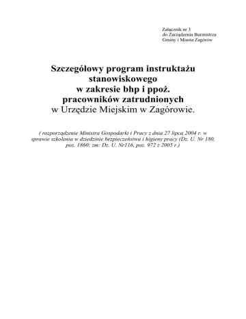 Załącznik nr 3 do Zarządzenia Burmistrza Gminy i Miasta Zagórów Szczegółowy program instruktażu stanowiskowego w zakresie bhp i ppoż. pracowników zatrudnionych w Urzędzie Miejskim w Zagórowie. ( rozporządzenie Ministra Gospodarki i Pracy z dnia 27 lipca 2004 r. w sprawie szkolenia w dziedzinie bezpieczeństwa i higieny pracy (Dz. U. Nr 180, poz. 1860; zm: Dz. U. Nr116, poz. 972 z 2005 r.) Program instruktażu stanowiskowego Celem szkolenia jest uzyskanie przez pracownika : 1) informacji o czynnikach środowiska pracy występujących na danym stanowisku pracy i w jego bezpośrednim otoczeniu oraz o ryzyku zawodowym związanym z wykonywaną pracą, 2) wiedzy i umiejętności dotyczących sposobów ochrony przed zagrożeniami wypadkowymi i zagrożeniami dla zdrowia w warunkach normalnej pracy i w warunkach awaryjnych, 3) wiedzy i praktycznych umiejętności z zakresu bezpiecznego wykonywana powierzonej pracy. Uczestnicy szkolenia : Szkolenie jest przeznaczone dla pracowników nowo zatrudnianych na stanowiskach pracy w Urzędzie Miejskim w Zagórowie, na których występuje narażenie na działanie czynników szkodliwych dla zdrowia, uciążliwych lub niebezpiecznych, dla pracowników przenoszonych na takie stanowiska oraz w przypadku zmiany warunków techniczno-organizacyjnych, zmiany organizacji stanowisk pracy, oraz nowych lub zmienianych narzędzi, maszyn i innych urządzeń. Szkolenie jest przeznaczone również dla studentów odbywających praktyki studenckie oraz uczniów odbywających praktyczną naukę zawodu w Urzędzie Gminy i Miasta Zagórów. Sposób organizacji szkolenia : Szkolenie powinno być prowadzone w formie instruktażu – na stanowisku, na którym będzie zatrudniony instruowany pracownik, na podstawie niniejszego szczegółowego programu. Szkolenie powinno uwzględniać następujące etapy: 1) rozmowę wstępną instruktora z instruowanym pracownikiem, 2) pokaz i objaśnienie przez instruktora całego procesu pracy, który ma być realizowany przez pracownika, 3) próbne wykonanie procesu pracy przez pracownika przy korygowaniu przez instruktora sposobów wykonywania pracy, 4) samodzielną pracę instruowanego pracownika pod nadzorem instruktora, 5) sprawdzenie i ocenę przez instruktora sposobu wykonywania pracy przez pracownika. Jeżeli pracownik wykonuje prace na różnych stanowiskach, szkolenie powinno uwzględniać wszystkie rodzaje prac, które będą należały do zakresu obowiązków pracownika. Sposób realizacji szkolenia i czas trwania poszczególnych jego części powinny być dostosowane do przygotowania zawodowego i dotychczasowego stażu pracy pracownika oraz zagrożeń występujących przy przewidzianej do wykonywania przez niego pracy. Powyższe uwarunkowania uwzględnia niniejszy „Program”. Instruktaż stanowiskowy – program szczegółowy I. Przygotowanie pracownika do wykonywania określonej pracy, w tym w szczególności: 1. Omówienie warunków pracy z uwzględnieniem: a) elementów pomieszczenia pracy, w którym ma pracować pracownik, mających wpływ na warunki pracy pracownika ( np. oświetlenie ogólne, ogrzewanie, wentylacja, urządzenia techniczne, urządzenia ochronne), b) elementów stanowiska roboczego mających wpływ na bezpieczeństwo i higienę pracy (np. pozycja przy pracy, oświetlenie miejscowe, wentylacja miejscowa, urządzenia zabezpieczające, znaki ostrzegawcze i sygnalizacyjne, narzędzia), c) przebiegu procesu na stanowisku pracy w nawiązaniu do charakteru przewidywanych do wykonania czynności w zakładzie pracy a także z uwzględnieniem czynności wykonywanych w środowisku. 2. Omówienie zagrożeń występujących przy określonych czynnościach na stanowisku pracy, wyników oceny ryzyka zawodowego związanego z wykonywaną pracą i sposobów ochrony przed zagrożeniami oraz zasad postępowania w razie wypadku lub awarii. 3. Przygotowanie wyposażenia stanowiska roboczego do wykonywania określonego zadania. 4. Organizacja stanowiska pracy z komputerem: a) rozmieszczenie elementów stanowiska pracy (siedzisko, stół, monitor, klawiatura), b) podstawowe zasady pracy przy komputerze, c) obowiązki pracodawcy. Czas trwania : 2 godz.* II. Pokaz przez instruktora sposobu wykonywania pracy na stanowisku pracy zgodnie z przepisami i zasadami bezpieczeństwa i higieny pracy, z uwzględnieniem metod bezpiecznego wykonywania poszczególnych czynności i ze szczególnym zwróceniem uwagi na czynności trudne i niebezpieczne. 1. Prowadzący pokazuje cały układ czynności w normalnym tempie, np. przygotowanie stanowiska pracy przy komputerze. 2. Prowadzący stosuje pokaz częściowy- elementowy. Pokazany pokaz fragmentu pracy staje się źródłem m. in.: - nabycia określonej umiejętności, - uzyskania wiadomości o charakterze wykonywanych czynności, sposobie ich wykonania, - dokonania spostrzeżeń o stopniu trudności i niebezpieczeństwie tkwiącym w pracy, - omówienie możliwych zagrożeń w środowisku podopiecznych. 3. Pokaz częściowy powinien przebiegać wg następującego porządku: a) pokazanie i określenie wszystkich elementów potrzebnych do wykonania danej czynności, b) pokazanie sposobu wykonania danej czynności, c) pokazanie sposobu posługiwania się urządzeniami , narzędziami itp. 4. Prowadzący zwraca uwagę na węzłowe ogniwa , mające duże znaczenie dla prawidłowego wykonania czynności. 5. Po pokazie całościowym i fragmentarycznym – ponowny pokaz układu czynności – w zwolnionym tempie , po raz drugi i trzeci raz w tempie rzeczywistym. 6. Sprawdzenie efektów pokazu poprzez polecenie uczestnikom powtórzenia demonstrowanych czynności. Czas trwania : 0,5 godz.* III. Próbne wykonanie zadania przez pracownika pod kontrolą instruktora. 1. Wstępna samodzielna próba wykonania pracy – w zwolnionym tempie z objaśnianiem wykonywanych czynności. 2. Wykonywanie poszczególnych fragmentów pracy z jednoczesnym objaśnianiem sposobu wykonywania tych czynności. 3. Wykonyw