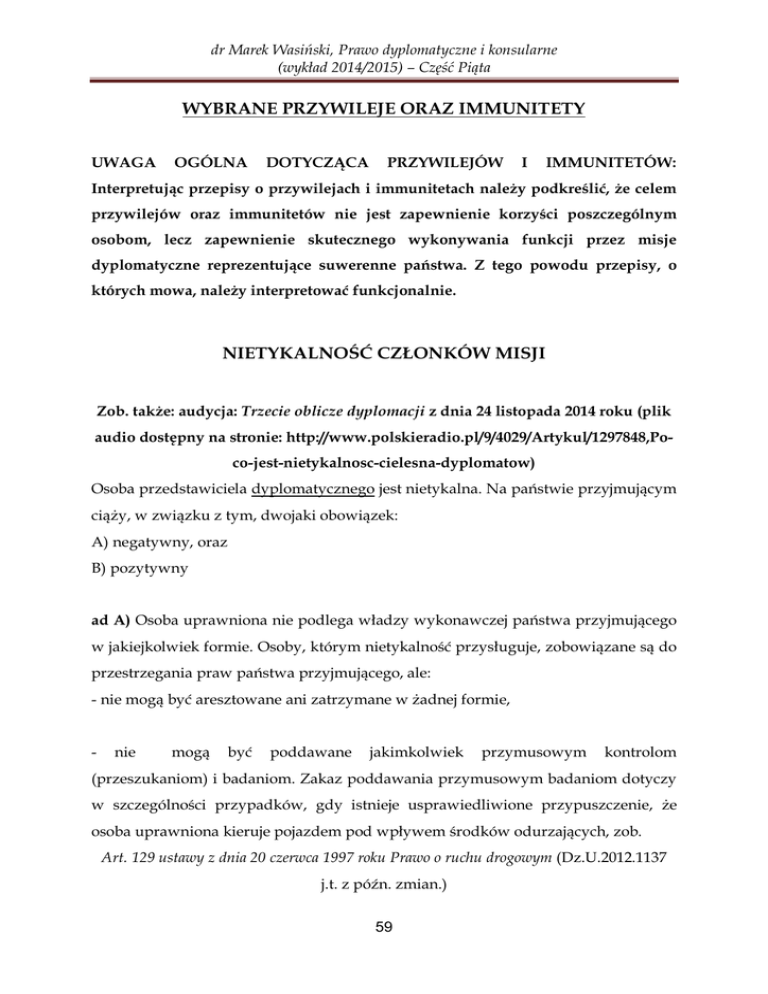 dr Marek Wasiński, Prawo dyplomatyczne i konsularne (wykład 2014/2015) – Część Piąta WYBRANE PRZYWILEJE ORAZ IMMUNITETY UWAGA OGÓLNA DOTYCZĄCA PRZYWILEJÓW I IMMUNITETÓW: Interpretując przepisy o przywilejach i immunitetach należy podkreślić, że celem przywilejów oraz immunitetów nie jest zapewnienie korzyści poszczególnym osobom, lecz zapewnienie skutecznego wykonywania funkcji przez misje dyplomatyczne reprezentujące suwerenne państwa. Z tego powodu przepisy, o których mowa, należy interpretować funkcjonalnie. NIETYKALNOŚĆ CZŁONKÓW MISJI Zob. także: audycja: Trzecie oblicze dyplomacji z dnia 24 listopada 2014 roku (plik audio dostępny na stronie: http://www.polskieradio.pl/9/4029/Artykul/1297848,Poco-jest-nietykalnosc-cielesna-dyplomatow) Osoba przedstawiciela dyplomatycznego jest nietykalna. Na państwie przyjmującym ciąży, w związku z tym, dwojaki obowiązek: A) negatywny, oraz B) pozytywny ad A) Osoba uprawniona nie podlega władzy wykonawczej państwa przyjmującego w jakiejkolwiek formie. Osoby, którym nietykalność przysługuje, zobowiązane są do przestrzegania praw państwa przyjmującego, ale: - nie mogą być aresztowane ani zatrzymane w żadnej formie, - nie mogą być poddawane jakimkolwiek przymusowym kontrolom (przeszukaniom) i badaniom. Zakaz poddawania przymusowym badaniom dotyczy w szczególności przypadków, gdy istnieje usprawiedliwione przypuszczenie, że osoba uprawniona kieruje pojazdem pod wpływem środków odurzających, zob. Art. 129 ustawy z dnia 20 czerwca 1997 roku Prawo o ruchu drogowym (Dz.U.2012.1137 j.t. z późn. zmian.) 59 dr Marek Wasiński, Prawo dyplomatyczne i konsularne (wykład 2014/2015) – Część Piąta W stosunku do: szefów i cudzoziemskiego personelu przedstawicielstw dyplomatycznych, szefów i cudzoziemskiego personelu urzędów konsularnych i misji specjalnych państw obcych oraz organizacji międzynarodowych, - którzy korzystają z przywilejów i immunitetów dyplomatycznych lub konsularnych na mocy ustaw, umów bądź powszechnie uznanych zwyczajów międzynarodowych, nie można: a) żądać poddania się badaniu w celu ustalenia zawartości w organizmie alkoholu lub środka działającego podobnie do alkoholu, nawet jeżeli zachodzi uzasadnione podejrzenie, że wskazana osoba mogła kierować pojazdem, b) wymagać poddania pojazdu znajdującego się na drodze sprawdzaniu jego: stanu technicznego, wyposażenia, ładunku, wymiarów, masy lub nacisku osi; c) odebrać im dokumentów stwierdzających uprawnienie do kierowania pojazdem lub jego używania. Wytyczne nr 1 Komendanta Głównego Policji z dnia 3 stycznia 2006 roku w sprawie postępowania policjantów wobec uczestników ruchu drogowego korzystających z immunitetów i przywilejów dyplomatycznych lub konsularnych oraz korzystających z immunitetów krajowych (fragmenty) (Dz.Urz.KGP.2006.4.17, z późn. sprost.) „§ 2 1. Stwierdzenie uprawnień osoby kontrolowanej do korzystania z immunitetu zakrajowego - następuje na podstawie legitymacji wydanej przez Ministra Spraw Zagranicznych, którą osoba ta ma obowiązek posiadać i okazać. §3 Każda interwencja podejmowana wobec osób korzystających z immunitetów lub przywilejów musi być przeprowadzana taktownie, ale stanowczo, z pełnym poszanowaniem przysługujących tym osobom praw. § 4. 1. Policjant ma prawo zatrzymać do kontroli każdy pojazd, również gdy jest on oznakowany tablicami dyplomatycznymi. 60 dr Marek Wasiński, Prawo dyplomatyczne i konsularne (wykład 2014/2015) – Część Piąta 2. W każdym przypadku uzasadnionego podejrzenia popełnienia wykroczenia przez kierującego pojazdem wyposażonym w dyplomatyczne tablice rejestracyjne policjant powinien zatrzymać pojazd i przeprowadzić kontrolę wymaganych dokumentów pojazdu oraz dokumentów osoby kierującej. 3. Jeżeli kierujący pojazdem, w przypadku określonym w ust. 2, jest osobą korzystającą z przywilejów i immunitetów dyplomatycznych lub konsularnych, policjant nie jest uprawniony do nałożenia grzywny w drodze mandatu karnego, skierowania sprawy do sądu jak również wpisania tej osoby do ewidencji kierowców naruszających przepisy ruchu drogowego. § 6. 1. Jeżeli istnieje uzasadnione podejrzenie, że kierujący pojazdem korzystający z immunitetu zakrajowego znajduje się w stanie nietrzeźwości lub w stanie po użyciu alkoholu albo środka działającego podobnie do alkoholu (np. wyczuwalna woń alkoholu z ust, trudności z zachowaniem równowagi po wyjściu z pojazdu, bełkotliwa mowa), policjant: 1) nie może żądać poddania się przez kierującego badaniu w celu ustalenia zawartości w organizmie alkoholu lub środka działającego podobnie do alkoholu, zwanego dalej „badaniem”; 2) jest obowiązany zaproponować kierującemu poddanie się badaniu; 3) uniemożliwia dalsze kierowanie pojazdem w razie odmowy poddania się badaniu lub w przypadku pozytywnego wyniku badania. 2. Uniemożliwienie kierowania, o którym mowa w ust. 1 pkt 3, powinno być połączone z nawiązaniem kontaktu z właściwym przedstawicielstwem dyplomatycznym lub konsularnym oraz przekazaniem pojazdu innej osobie wskazanej przez kontrolowanego i może nastąpić w szczególności przez: 1) zwrócenie się do kontrolowanego o powstrzymanie się od kierowania pojazdem; 2) zaproponowanie przekazania do depozytu kluczyków pojazdu, a w przypadku odmowy oraz gdy osoba kontrolowana znajduje się poza pojazdem, uniemożliwienie jej powrotu do pojazdu przez blokowanie dostępu do drzwi, w miarę możliwości bez naruszenia nietykalności tej osoby; 61 dr Marek Wasiński, Prawo dyplomatyczne i konsularne (wykład 2014/2015) – Część Piąta 3) zablokowanie kontrolowanego pojazdu przy użyciu pojazdu (pojazdów) służbowego Policji lub blokady na koła. 3. Uniemożliwienie kierowania, o którym mowa w ust. 1, powinno trwać do czasu przekazania kierującego do dyspozycji szefa misji lub urzędu, lub otrzymania innych, wyra