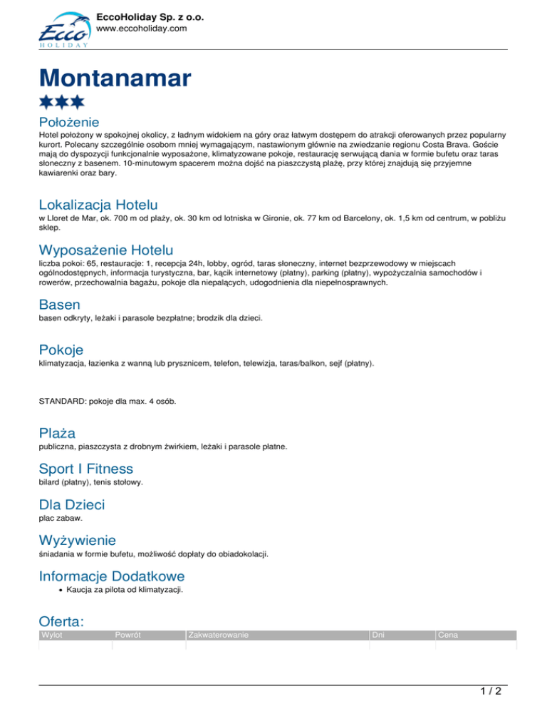 EccoHoliday Sp. z o.o. www.eccoholiday.com Montanamar Położenie Hotel położony w spokojnej okolicy, z ładnym widokiem na góry oraz łatwym dostępem do atrakcji oferowanych przez popularny kurort. Polecany szczególnie osobom mniej wymagającym, nastawionym głównie na zwiedzanie regionu Costa Brava. Goście mają do dyspozycji funkcjonalnie wyposażone, klimatyzowane pokoje, restaurację serwującą dania w formie bufetu oraz taras słoneczny z basenem. 10-minutowym spacerem można dojść na piaszczystą plażę, przy której znajdują się przyjemne kawiarenki oraz bary. Lokalizacja Hotelu w Lloret de Mar, ok. 700 m od plaży, ok. 30 km od lotniska w Gironie, ok. 77 km od Barcelony, ok. 1,5 km od centrum, w pobliżu sklep. Wyposażenie Hotelu liczba pokoi: 65, restauracje: 1, recepcja 24h, lobby, ogród, taras słoneczny, internet bezprzewodowy w miejscach ogólnodostępnych, informacja turystyczna, bar, kącik internetowy (płatny), parking (płatny), wypożyczalnia samochodów i rowerów, przechowalnia bagażu, pokoje dla niepalących, udogodnienia dla niepełnosprawnych. Basen basen odkryty, leżaki i parasole bezpłatne; brodzik dla dzieci. Pokoje klimatyzacja, łazienka z wanną lub prysznicem, telefon, telewizja, taras/balkon, sejf (płatny). STANDARD: pokoje dla max. 4 osób. Plaża publiczna, piaszczysta z drobnym żwirkiem, leżaki i parasole płatne. Sport I Fitness bilard (płatny), tenis stołowy. Dla Dzieci plac zabaw. Wyżywienie śniadania w formie bufetu, możliwość dopłaty do obiadokolacji. Informacje Dodatkowe Kaucja za pilota od klimatyzacji. Oferta: Wylot Powrót Zakwaterowanie Dni Cena 1/2 EccoHoliday Sp. z o.o. www.eccoholiday.com 01.01.1970 01.01.1970 godz. godz. -() dni os. dorosła 2/2 Powered by TCPDF (www.tcpdf.org)