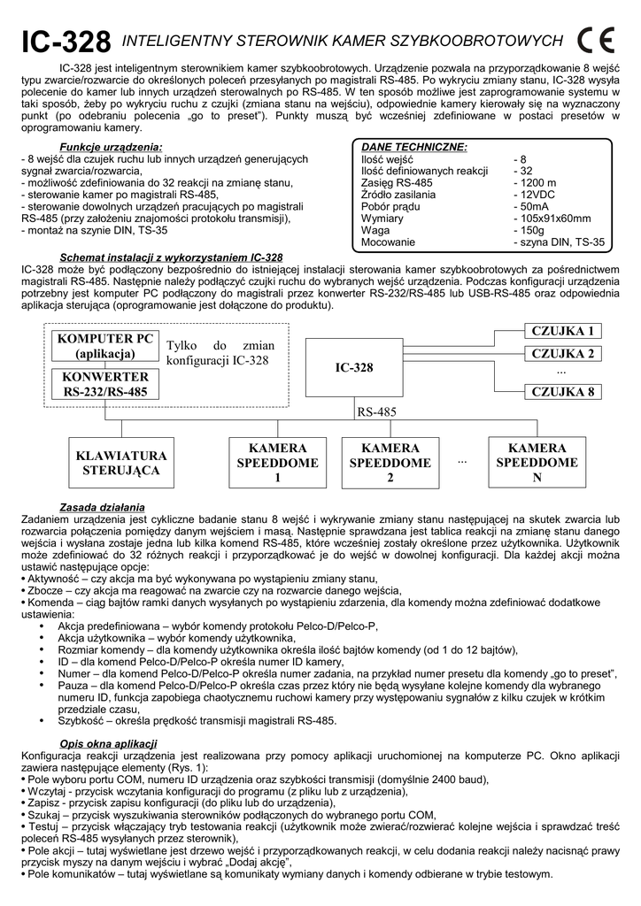 IC-328 INTELIGENTNY STEROWNIK KAMER SZYBKOOBROTOWYCH IC-328 jest inteligentnym sterownikiem kamer szybkoobrotowych. Urządzenie pozwala na przyporządkowanie 8 wejść typu zwarcie/rozwarcie do określonych poleceń przesyłanych po magistrali RS-485. Po wykryciu zmiany stanu, IC-328 wysyła polecenie do kamer lub innych urządzeń sterowalnych po RS-485. W ten sposób możliwe jest zaprogramowanie systemu w taki sposób, żeby po wykryciu ruchu z czujki (zmiana stanu na wejściu), odpowiednie kamery kierowały się na wyznaczony punkt (po odebraniu polecenia „go to preset”). Punkty muszą być wcześniej zdefiniowane w postaci presetów w oprogramowaniu kamery. Funkcje urządzenia: - 8 wejść dla czujek ruchu lub innych urządzeń generujących sygnał zwarcia/rozwarcia, - możliwość zdefiniowania do 32 reakcji na zmianę stanu, - sterowanie kamer po magistrali RS-485, - sterowanie dowolnych urządzeń pracujących po magistrali RS-485 (przy założeniu znajomości protokołu transmisji), - montaż na szynie DIN, TS-35 DANE TECHNICZNE: Ilość wejść Ilość definiowanych reakcji Zasięg RS-485 Źródło zasilania Pobór prądu Wymiary Waga Mocowanie -8 - 32 - 1200 m - 12VDC - 50mA - 105x91x60mm - 150g - szyna DIN, TS-35 Schemat instalacji z wykorzystaniem IC-328 IC-328 może być podłączony bezpośrednio do istniejącej instalacji sterowania kamer szybkoobrotowych za pośrednictwem magistrali RS-485. Następnie należy podłączyć czujki ruchu do wybranych wejść urządzenia. Podczas konfiguracji urządzenia potrzebny jest komputer PC podłączony do magistrali przez konwerter RS-232/RS-485 lub USB-RS-485 oraz odpowiednia aplikacja sterująca (oprogramowanie jest dołączone do produktu). KOMPUTER PC (aplikacja) CZUJKA 1 Tylko do zmian konfiguracji IC-328 KONWERTER RS-232/RS-485 CZUJKA 2 ... IC-328 CZUJKA 8 RS-485 KLAWIATURA STERUJĄCA KAMERA SPEEDDOME 1 KAMERA SPEEDDOME 2 ... KAMERA SPEEDDOME N Zasada działania Zadaniem urządzenia jest cykliczne badanie stanu 8 wejść i wykrywanie zmiany stanu następującej na skutek zwarcia lub rozwarcia połączenia pomiędzy danym wejściem i masą. Następnie sprawdzana jest tablica reakcji na zmianę stanu danego wejścia i wysłana zostaje jedna lub kilka komend RS-485, które wcześniej zostały określone przez użytkownika. Użytkownik może zdefiniować do 32 różnych reakcji i przyporządkować je do wejść w dowolnej konfiguracji. Dla każdej akcji można ustawić następujące opcje: ● Aktywność – czy akcja ma być wykonywana po wystąpieniu zmiany stanu, ● Zbocze – czy akcja ma reagować na zwarcie czy na rozwarcie danego wejścia, ● Komenda – ciąg bajtów ramki danych wysyłanych po wystąpieniu zdarzenia, dla komendy można zdefiniować dodatkowe ustawienia: ● Akcja predefiniowana – wybór komendy protokołu Pelco-D/Pelco-P, ● Akcja użytkownika – wybór komendy użytkownika, ● Rozmiar komendy – dla komendy użytkownika określa ilość bajtów komendy (od 1 do 12 bajtów), ● ID – dla komend Pelco-D/Pelco-P określa numer ID kamery, ● Numer – dla komend Pelco-D/Pelco-P określa numer zadania, na przykład numer presetu dla komendy „go to preset”, ● Pauza – dla komend Pelco-D/Pelco-P określa czas przez który nie będą wysyłane kolejne komendy dla wybranego numeru ID, funkcja zapobiega chaotycznemu ruchowi kamery przy występowaniu sygnałów z kilku czujek w krótkim przedziale czasu, ● Szybkość – określa prędkość transmisji magistrali RS-485. Opis okna aplikacji Konfiguracja reakcji urządzenia jest realizowana przy pomocy aplikacji uruchomionej na komputerze PC. Okno aplikacji zawiera następujące elementy (Rys. 1): ● Pole wyboru portu COM, numeru ID urządzenia oraz szybkości transmisji (domyślnie 2400 baud), ● Wczytaj - przycisk wczytania konfiguracji do programu (z pliku lub z urządzenia), ● Zapisz - przycisk zapisu konfiguracji (do pliku lub do urządzenia), ● Szukaj – przycisk wyszukiwania sterowników podłączonych do wybranego portu COM, ● Testuj – przycisk włączający tryb testowania reakcji (użytkownik może zwierać/rozwierać kolejne wejścia i sprawdzać treść poleceń RS-485 wysyłanych przez sterownik), ● Pole akcji – tutaj wyświetlane jest drzewo wejść i przyporządkowanych reakcji, w celu dodania reakcji należy nacisnąć prawy przycisk myszy na danym wejściu i wybrać „Dodaj akcję”, ● Pole komunikatów – tutaj wyświetlane są komunikaty wymiany danych i komendy odbierane w trybie testowym. Rys. 1 – okno główne aplikacji, wybór wejścia i dodawanie akcji, Rys. 2 – okno edycji akcji, użytkownik może wybrać jedną z predefiniowanych komend wysyłanych do kamery, Rys. 3 – okno edycji akcji, użytkownik może zdefiniować własną komendę o długości od 1 do 12 bajtów (bajty są wyświetlane w systemie szesnastkowym). Sposób konfiguracji Po uruchomieniu aplikacji użytkownik musi określić port COM komputera PC, do którego podłączone jest urządzenie. Następnym krokiem jest wybranie ID urządzenia lub wyszukanie sterownika za pomocą przycisku „Szukaj” i wczytanie konfiguracji z urządzenia za pomocą przycisku „Wczytaj”. W tym momencie użytkownik ma możliwość dodawania nowych akcji do wejść urządzenia (okno „Akcje”). Rysunki 2 i 3 przedstawiają okna edycji akcji i wybór opcji, które zostały szczegółowo opisane w poprzednim punkcie. Zapis konfiguracji do urządzenia ma miejsce po naciśnięciu przycisku „Zapisz”. Od tego momentu nowe ustawienia znajdują się w pamięci stałej urządzenia. Adres ID i konfiguracja wielu sterowników Adres ID urządzenia jest wykorzystywany przy programowaniu większej ilości urządzeń na jednej magistrali RS-485. Każdy z podłączonych IC-328 musi posiadać niepowtarzalny adres ID, aby aplikacja programująca mogła je rozpoznać. RS-485 KOMPUTER PC (aplikacja) IC-328 ID=0 KONWERTER RS-232/RS-485 IC-328 ID=1 IC-328 ID=15 