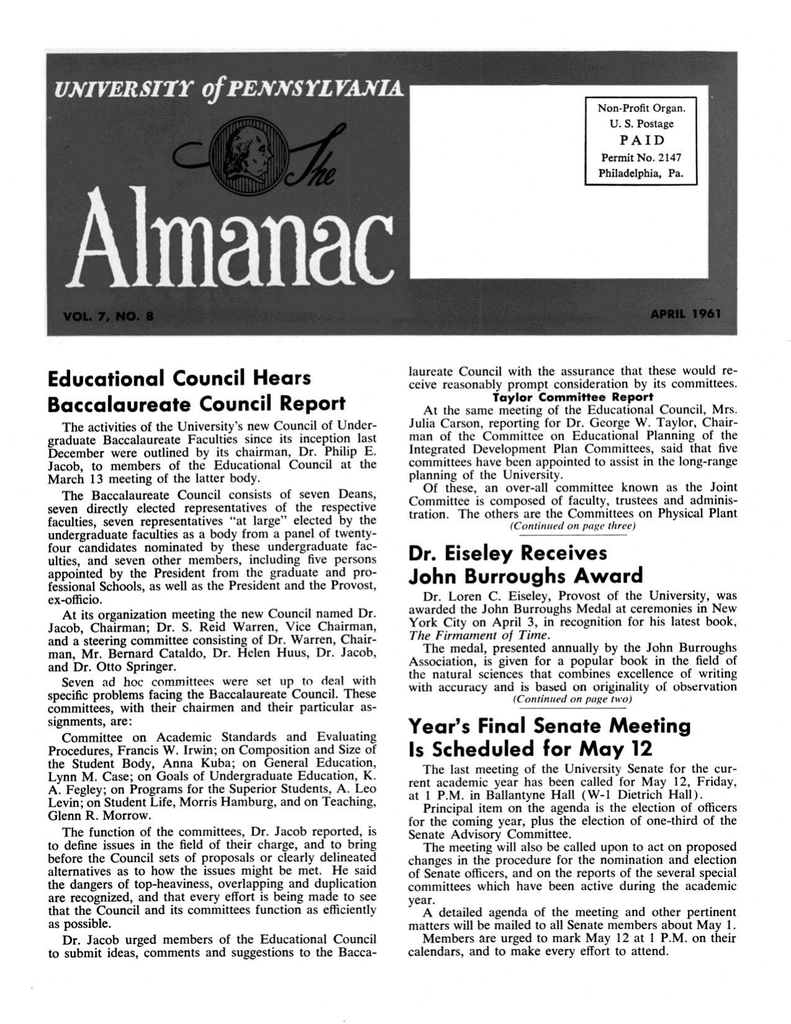 Educational Council Hears Baccalaureate Council Report The activities of the University's new Council of Undergraduate Baccalaureate Faculties since its inception last December were outlined by its chairman, Dr. Philip E. Jacob, to members of the Educational Council at the March 13 meeting of the latter body. The Baccalaureate Council consists of seven Deans, seven directly elected representatives of the respective faculties, seven representatives "at large" elected by the undergraduate faculties as a body from a panel of twentyfour candidates nominated by these undergraduate faculties, and seven other members, including five persons appointed by the President from the graduate and professional Schools, as well as the President and the Provost, ex-officio. At its organization meeting the new Council named Dr. Jacob, Chairman; Dr. S. Reid Warren, Vice Chairman, and a steering committee consisting of Dr. Warren, Chairman, Mr. Bernard Cataldo, Dr. Helen Huus, Dr. Jacob, and Dr. Otto Springer. Seven ad hoc committees were set up to deal with specific problems facing the Baccalaureate Council. These committees, with their chairmen and their particular assignments, are: Committee on Academic Standards and Evaluating Procedures, Francis W. Irwin; on Composition and Size of the Student Body, Anna Kuba; on General Education, Lynn M. Case; on Goals of Undergraduate Education, K. A. Fegley; on Programs for the Superior Students, A. Leo Levin; on Student Life, Morris Hamburg, and on Teaching, Glenn R. Morrow. The function of the committees, Dr. Jacob reported, is to define issues in the field of their charge, and to bring before the Council sets of proposals or clearly delineated alternatives as to how the issues might be met. He said the dangers of top-heaviness, overlapping and duplication are recognized, and that every effort is being made to see that the Council and its committees function as efficiently as possible. Dr. Jacob urged members of the Educational Council to submit ideas, comments and suggestions to the Bacca- laureate Council with the assurance that these would receive reasonably prompt consideration by its committees. Taylor Committee Report At the same meeting of the Educational Council, Mrs. Julia Carson, reporting for Dr. George W. Taylor, Chairman of the Committee on Educational Planning of the Integrated Development Plan Committees, said that five committees have been appointed to assist in the long-range planning of the University. Of these, an over-all committee known as the Joint Committee is composed of faculty, trustees and administration. The others are the Committees on Physical Plant (Continued on page three) Dr. Eiseley Receives John Burroughs Award Dr. Loren C. Eiseley, Provost of the University, was awarded the John Burroughs Medal at ceremonies in New York City on April 3, in recognition for his latest book, The Firmament of Time. The medal, presented annually by the John Burroughs Association, is given for a popular book in the field of the natural sciences that combines excellence of writing with accuracy and is based on originality of observation (Continued on page two) Year's Final Senate Meeting Is Scheduled for May 12 The last meeting of the University Senate for the current academic year has been called for May 12, Friday, at 1 P.M. in Ballantyne Hall (W-1 Dietrich Hall). Principal item on the agenda is the election of officers for the coming year, plus the election of one-third of the Senate Advisory Committee. The meeting will also be called upon to act on proposed changes in the procedure for the nomination and election of Senate officers, and on the reports of the several special committees which have been active during the academic year. A detailed agenda of the meeting and other pertinent matters will be mailed to all Senate members about May 1. Members are urged to mark May 12 at 1 P.M. on their calendars, and to make every effort to attend. THE ALMANAC 2 Backgrounder University Counseling Service The University Counseling Service functions under the office of the Vice President for Student Affairs. Its purpose is to provide such specialized counseling as students may require and which may not be available in other campus agencies. It is not designed to replace any previously existing services but to complement them. This counseling gives the student an opportunity to explore areas of concern which may inhibit his or her best performance and thus prevent fulfillment of maximum potential. The emphasis is upon helping the student to become increasingly self-directive. An analysis of the first year's contacts with students emphasizes certain factors: Thirty percent of contacts were with freshmen and 29 percent with sophomores, stressing the need for assistance in the crucial first years of college. A number of students of good potential were helped to avoid failure and elimination from the University. Many needed extra attention with reading and study skills, and the Service works closely with the Reading Clinic. It is most important that such students be identified as early as possible. The majority of student contacts were for the purpose of clarifying vocational and educational planning. Many of these illustrated a close relationship between vocational planning, or lack of it, and academic performance. At least one-third of those who came for vocational counseling had educational or personal problems which were brought out and dealt with in the course of the contacts. In considering the referral of a student the question arises, "When do I refer a student to Mental Health Clinic, and when to the Counseling Service?" This is not easy to answer, since it involves the more basic question, "Where does counseling end and psychotherapy begin?" All that can be done is to suggest a general guide: If the student is facing some problem, decision or difficulty which he is having trouble handling, but he knows reasonably well what the problem is, he probably need