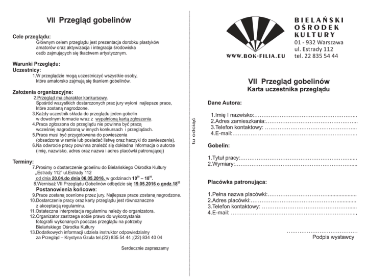 VII Przegl¹d gobelinów Cele przeglàdu: Gùównym celem przeglàdu jest prezentacja dorobku plastyków amatorów oraz aktywizacja i integracja úrodowiska osób zajmujàcych siæ tkactwem artystycznym. Warunki Przeglàdu: Uczestnicy: 1.W przeglàdzie mogà uczestniczyã wszystkie osoby, które amatorsko zajmujà siæ tkaniem gobelinów. VII Przegl¹d gobelinów Karta uczestnika przegl¹du Zaùoýenia organizacyjne: Terminy: 7.Prosimy o dostarczenie gobelinu do Bielañskiego Oœrodka Kultury ,,Estrady 112” ul.Estrady 112 od dnia 20.04.do dnia 06.05.2016. w godzinach 1000 – 1800. 8.Wernisaý VII Przegl¹du Gobelinów odbêdzie siê 19.05.2016 o godz.1800 Postanowienia koñcowe: 9.Prace zostanà ocenione przez jury. Najlepsze prace zostanà nagrodzone. 10.Dostarczenie pracy oraz karty przeglàdu jest równoznaczne z akceptacjà regulaminu. 11.Ostateczna interpretacja regulaminu naleýy do organizatora. 12.Organizator zastrzega sobie prawo do wykorzystania fotografii wykonanych podczas przeglàdu na potrzeby Bielañskiego Oúrodka Kultury 13.Dodatkowych informacji udziela instruktor odpowiedzialny za Przegl¹d – Krystyna Gzula tel.(22) 835 54 44 ;(22) 834 40 04 Serdecznie zapraszamy Dane Autora: tu odci¹æ 2.Przeglàd ma charakter konkursowy. Spoúród wszystkich dostarczonych prac jury wyùoni najlepsze prace, które zostanà nagrodzone. 3.Kaýdy uczestnik skùada do przeglàdu jeden gobelin w dowolnym formacie wraz z wypeùnionà kartà zgùoszenia. 4.Praca zgùoszona do przeglàdu nie powinna byã pracà wczeúniej nagrodzonà w innych konkursach i przeglàdach. 5.Praca musi byã przygotowana do powieszenia (obsadzona w ramie lub posiadaã listwæ oraz haczyki do zawieszenia). 6.Na odwrocie pracy powinna znaleêã siæ dokùadna informacja o autorze (imiæ, nazwisko, adres oraz nazwa i adres placówki patronujàcej) 1.Imiæ I nazwisko:………………………………………………... 2.Adres zamieszkania:…………………………………………... 3.Telefon kontaktowy: …………………………………………... 4.E-mail:…………………………………………………………... Gobelin: 1.Tytuù pracy:……………………………………………………..... 2.Wymiary:………………………………………………………..... Placówka patronujàca: 1.Peùna nazwa placówki:……………………………................... 2.Adres placówki:…………………………………………............ 3.Telefon kontaktowy: …………………………………………..... 4.E-mail: …………………………………………………………..., ………………………………… Podpis wystawcy