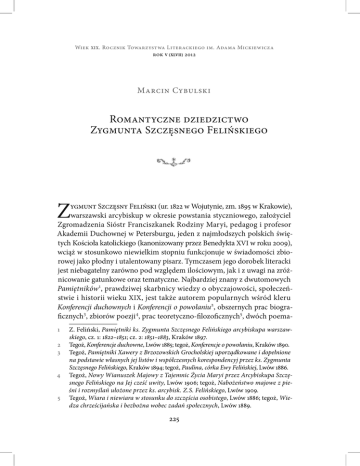 Wiek XIX . Rocznik Towarzystwa Literackiego im. Adama Mickiewicza rok V (XLVII) 2012 Marcin Cybulski Romantyczne dziedzictwo Zygmunta Szczęsnego Felińskiego Z ygmunt Szczęsny Feliński (ur. 1822 w Wojutynie, zm. 1895 w Krakowie), warszawski arcybiskup w okresie powstania styczniowego, założyciel Zgromadzenia Sióstr Franciszkanek Rodziny Maryi, pedagog i profesor Akademii Duchownej w Petersburgu, jeden z najmłodszych polskich świętych Kościoła katolickiego (kanonizowany przez Benedykta XVI w roku 2009), wciąż w stosunkowo niewielkim stopniu funkcjonuje w świadomości zbiorowej jako płodny i utalentowany pisarz. Tymczasem jego dorobek literacki jest niebagatelny zarówno pod względem ilościowym, jak i z uwagi na zróżnicowanie gatunkowe oraz tematyczne. Najbardziej znany z dwutomowych Pamiętników1, prawdziwej skarbnicy wiedzy o obyczajowości, społeczeństwie i historii wieku XIX, jest także autorem popularnych wśród kleru Konferencji duchownych i Konferencji o powołaniu2, obszernych prac biograficznych3, zbiorów poezji4, prac teoretyczno-filozoficznych5, dwóch poema1 2 3 4 5 Z. Feliński, Pamiętniki ks. Zygmunta Szczęsnego Felińskiego arcybiskupa warszawskiego, cz. 1: 1822–1851; cz. 2: 1851–1883, Kraków 1897. Tegoż, Konferencje duchowne, Lwów 1885; tegoż, Konferencje o powołaniu, Kraków 1890. Tegoż, Pamiętniki Xawery z Brzozowskich Grocholskiej uporządkowane i dopełnione na podstawie własnych jej listów i współczesnych korespondencyj przez ks. Zygmunta Szczęsnego Felińskiego, Kraków 1894; tegoż, Paulina, córka Ewy Felińskiej, Lwów 1886. Tegoż, Nowy Wianuszek Majowy z Tajemnic Życia Maryi przez Arcybiskupa Szczęsnego Felińskiego na Jej cześć uwity, Lwów 1906; tegoż, Nabożeństwo majowe z pieśni i rozmyślań ułożone przez ks. arcybisk. Z.S. Felińskiego, Lwów 1909. Tegoż, Wiara i niewiara w stosunku do szczęścia osobistego, Lwów 1886; tegoż, Wiedza chrześcijańska i bezbożna wobec zadań społecznych, Lwów 1889. 225 • Marcin Cybulski • tów6, pomijając już liczne pomniejsze szkice i artykuły. Twórczość ta pozostaje jednak w cieniu jego działalności kościelnej i społecznej, pomijana jest z reguły w monografiach charakteryzujących polską literaturę dziewiętnastowieczną, a jedyną próbą jej opisu do niedawna pozostawał kilkudziesięciostronicowy rozdział w biografii autorstwa Hieronima Wyczawskiego7 oraz epizodyczne artykuły o niewielkiej objętości8. Tymczasem działalność pisarska Zygmunta Szczęsnego Felińskiego zasługuje na większe zainteresowanie tak czytelników, jak i literaturoznawców, bowiem jest to twórczość oryginalna i chociaż artystycznie dość nierówna, to stanowiąca interesującą pozycję w polskiej literaturze XIX wieku, choćby z uwagi na różnorodne inspiracje, wartość historyczną oraz niepospolitą osobę jej autora. Niniejszy artykuł poświęcony zostanie tylko jednej kwestii związanej z pisarstwem Felińskiego, która jednak jak dotąd nie znalazła żadnego odzwierciedlenia w pracach krytycznych. Chodzi o wpływ literackiego etosu romantycznego na wybrane prace warszawskiego arcybiskupa. Na powinowactwa w szczególności poematów Felińskiego z literaturą romantyczną zwracali już uwagę Wyczawski9, Franciszek Ziejka10 i Teresa Frącek11, jednak nie podjęto dotąd bardziej wnikliwej analizy tego pokrewieństwa i brak jest tym samym przekonujących wniosków, które pozwoliłyby odpowiedzieć na pytanie, czy Felińskiego można uznać za spóźnionego romantyka, a jeżeli nie, to chociaż w jakim stopniu romantyczny etos wpłynął na jego postawę literacką. Przede wszystkim wydaje się, że problemu tego nie można rozpatrywać w oderwaniu od biografii samego arcybiskupa warszawskiego, jej przełomowych momentów zwrotnych, ale również formacji światopoglądowej wyniesionej z rodzinnego domu, która stała się w dużej mierze podstawą dla jego późniejszej twórczości. Urodzony w wołyńskim środowisku ziemiańskim Feliński wzrastał w otoczeniu, w którym niezwykłą wagę przyTegoż, Prakseda. Oskar i Wanda. Dwa poematy z teki Anhellego, Szczecinek 2010. H. Wyczawski, Arcybiskup Zygmunt Szczęsny Feliński 1822–1895, Warszawa 1975, s. 386–416. 8 Zob. F. Ziejka, Błogosławiony Zygmunt Szczęsny Feliński – poeta, w: Rodzina Maryi, dzieło bł. Zygmunta Szczęsnego Felińskiego 1857–2007: materiały z sympozjum, pod red. J. Wołczańskiego, Kraków 2009, s. 37–64; zob. także: J. Kędzierski, Poezja religijna św. abp. Zygmunta Szczęsnego Felińskiego. Ku czci Matki Bożej, „Aspekt Polski” 2010, nr 3. 9 H. Wyczawski, dz. cyt., s. 392–393. 10 F. Ziejka, dz. cyt., s. 40–41, 51. 11 T. Frącek, Wstęp, w: Z. Feliński, Prakseda…, s. 26. 6 7 226 • Romantyczne dziedzictwo Zygmunta Szczęsnego Felińskiego • wiązywano do etosu patriotycznego i religijnego12. Nie bez znaczenia była kultywowana w domu pamięć o Alojzym Felińskim, stryju Zygmunta, patriocie i autorze m.in. hymnu Boże, coś Polskę13. Na dzieciństwo przyszłego arcybiskupa przypadają także dramatyczne wydarzenia powstania listopadowego, które bezpośrednio rzutowały na losy familii, zmuszając ją do czasowego opuszczenia rodzinnego domu i przyspieszając zgon schorowanego ojca, Gerarda Felińskiego14. W następnych latach matka Zygmunta, Ewa Felińska, zaangażowała się w konspiracyjną działalność ruchu Szymona Konarskiego15. Jak wynika ze wspomnień samego arcybiskupa, przywódca konspiracji był dla niego prawdziwym wzorem do naśladowania i uosobieniem jedynie słusznej postawy światopoglądowej16. Rozbicie spisku, aresztowanie i zesłanie Ewy Felińskiej oraz rozproszenie osieroconego rodzeństwa po różnych opiekunach stało się symbolicznym końcem dzieciństwa dla młodego Zygmunta, jednak umocniło w nim tylko bezkompromisowe przekonania polityczne, zbudowane na micie narodowego powstania i romantycznego poświęcenia dla ojczy
