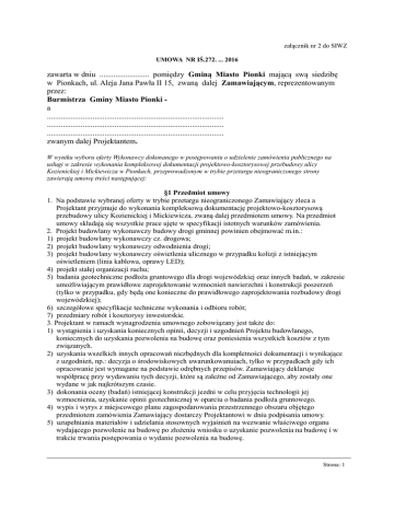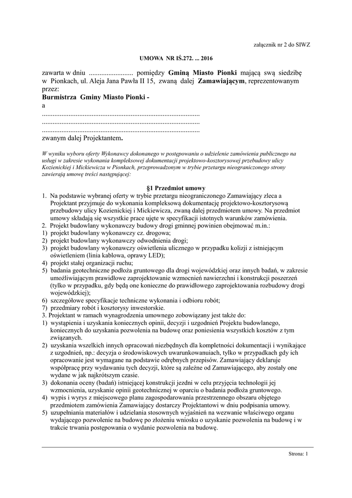 załącznik nr 2 do SIWZ UMOWA NR IŚ.272. ... 2016 zawarta w dniu ......................... pomiędzy Gminą Miasto Pionki mającą swą siedzibę w Pionkach, ul. Aleja Jana Pawła II 15, zwaną dalej Zamawiającym, reprezentowanym przez: Burmistrza Gminy Miasto Pionki a ......................................................................................... ......................................................................................... ......................................................................................... zwanym dalej Projektantem. W wyniku wyboru oferty Wykonawcy dokonanego w postępowaniu o udzielenie zamówienia publicznego na usługi w zakresie wykonania kompleksowej dokumentacji projektowo-kosztorysowej przebudowy ulicy Kozienickiej i Mickiewicza w Pionkach, przeprowadzonym w trybie przetargu nieograniczonego strony zawierają umowę treści następującej: §1 Przedmiot umowy 1. Na podstawie wybranej oferty w trybie przetargu nieograniczonego Zamawiający zleca a Projektant przyjmuje do wykonania kompleksową dokumentację projektowo-kosztorysową przebudowy ulicy Kozienickiej i Mickiewicza, zwaną dalej przedmiotem umowy. Na przedmiot umowy składają się wszystkie prace ujęte w specyfikacji istotnych warunków zamówienia. 2. Projekt budowlany wykonawczy budowy drogi gminnej powinien obejmować m.in.: 1) projekt budowlany wykonawczy cz. drogowa; 2) projekt budowlany wykonawczy odwodnienia drogi; 3) projekt budowlany wykonawczy oświetlenia ulicznego w przypadku kolizji z istniejącym oświetleniem (linia kablowa, oprawy LED); 4) projekt stałej organizacji ruchu; 5) badania geotechniczne podłoża gruntowego dla drogi wojewódzkiej oraz innych badań, w zakresie umożliwiającym prawidłowe zaprojektowanie wzmocnień nawierzchni i konstrukcji poszerzeń (tylko w przypadku, gdy będą one konieczne do prawidłowego zaprojektowania rozbudowy drogi wojewódzkiej); 6) szczegółowe specyfikacje techniczne wykonania i odbioru robót; 7) przedmiary robót i kosztorysy inwestorskie. 3. Projektant w ramach wynagrodzenia umownego zobowiązany jest także do: 1) wystąpienia i uzyskania koniecznych opinii, decyzji i uzgodnień Projektu budowlanego, koniecznych do uzyskania pozwolenia na budowę oraz poniesienia wszystkich kosztów z tym związanych. 2) uzyskania wszelkich innych opracowań niezbędnych dla kompletności dokumentacji i wynikające z uzgodnień, np.: decyzja o środowiskowych uwarunkowanuiach, tylko w przypadkach gdy ich opracowanie jest wymagane na podstawie odrębnych przepisów. Zamawiający deklaruje współpracę przy wydawaniu tych decyzji, które są zależne od Zamawiającego, aby zostały one wydane w jak najkrótszym czasie. 3) dokonania oceny (badań) istniejącej konstrukcji jezdni w celu przyjęcia technologii jej wzmocnienia, uzyskanie opinii geotechnicznej w oparciu o badania podłoża gruntowego. 4) wypis i wyrys z miejscowego planu zagospodarowania przestrzennego obszaru objętego przedmiotem zamówienia Zamawiający dostarczy Projektantowi w dniu podpisania umowy. 5) uzupełniania materiałów i udzielania stosownych wyjaśnień na wezwanie właściwego organu wydającego pozwolenie na budowę po złożeniu wniosku o uzyskanie pozwolenia na budowę i w trakcie trwania postępowania o wydanie pozwolenia na budowę. Strona: 1 6) uzyskania aktualnych map do celów projektowych w formie numerycznej i papierowej, wykonanych na podstawie obowiązujących przepisów, przyjętej do Powiatowego Ośrodka Dokumentacji Geodezyjnej i Kartograficznej. 7) Projektant dołączy do projektu budowlanego oświadczenie, że jest on wykonany zgodnie z umową, obowiązującymi przepisami techniczno-budowlanymi, normami i wytycznymi oraz, że został wykonany w stanie kompletnym z punktu widzenia celu, któremu ma służyć. 4. Wymagania formalne: 1) Projektant przed przystąpieniem do prac projektowych przedstawi wersję roboczą projektu (koncepcję) do zaakceptowania przez Zamawiającego i zarządcę drogi. Zaakceptowana wersja robocza projektu będzie podstawą do dalszego opracowania, wystąpień oraz uzgodnień. 2) Do opracowanej dokumentacji budowlanej należy dołączyć oświadczenia projektantów branżowych, że dokumentacja spełnia wymogi ustawy Prawo zamówień publicznych z dnia 29.01.2004r. (Dz. U. z 2013r., poz. 907 z późn. zm.). 3) Dokumentacja budowlana powinna być uzgodniona ze wszystkimi instytucjami branżowymi, których urządzeń dotyczą prace projektowe. 5. Projekt budowlany wykonawczy należy wykonać w 6 egzemplarzach (plus w wersji elektronicznej na płycie CD lub pendrive), pozostałe opracowania po 1 egzemplarzu (plus w wersji elektronicznej na płycie CD lub pendrive). Specyfikacje techniczne mają być zapisane w powszechnie używanym edytorze tekstowym w formacie *.doc i *.pdf , przedmiary robót i kosztorysy inwestorskie mają być zapisane w programie kosztorysowym i w formacie *.pdf 6. Kosztorys inwestorski winien być opracowany zgodnie z Rozporządzeniem Ministra Infrastruktury z dnia 18 maja 2004r. w sprawie określenia metod i podstaw sporządzania kosztorysu inwestorskiego, obliczania planowanych kosztów prac projektowych oraz planowanych kosztów robót budowlanych określonych w programie funkcjonalno-użytkowym (Dz. U. z dnia 8 czerwca 2004 r. Nr 130, poz. 1389) i przy dołożeniu najwyższej staranności. 7. Przedmiar robót oraz specyfikacja techniczna wykonania i odbioru robót budowlanych ma być opracowany zgodnie z Rozporządzeniem Ministra Infrastruktury z dnia 2 września 2004r. w sprawie szczegółowego zakresu i formy dokumentacji projektowej, specyfikacji technicznych wykonania i odbioru robót budowlanych oraz programu funkcjonalno-użytkowego (Dz. U. z 2004 r., Nr 202, poz. 2072 z późn. zm.) i przy dołożeniu najwyższej staranności. § 2. Wykonanie umowy. 1. Projektant zobowiązuje się wykonać umowę z zachowaniem szczególnej staranności wymaganej od profesjonalisty, zgodnie z 