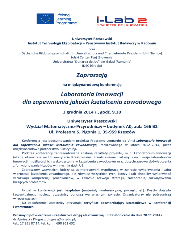 Uniwersytet Rzeszowski Instytut Technologii Eksploatacji – Państwowy Instytut Badawczy w Radomiu oraz Sächsische Bildungsgesellschaft für Umweltschutz und Chemieberufe Dresden mbH (Niemcy) Šolski Center Ptuj (Słowenia) Universitatea "Dunarea de Jos" din Galati (Rumunia) IDEC (Grecja) Zapraszają na międzynarodową konferencję Laboratoria innowacji dla zapewnienia jakości kształcenia zawodowego 3 grudnia 2014 r., godz. 9.30 Uniwersytet Rzeszowski Wydział Matematyczno-Przyrodniczy – budynek A0, aula 166 B2 Ul. Profesora S. Pigonia 1, 35-959 Rzeszów Konferencja jest podsumowaniem projektu Programu Leonardo da Vinci Laboratoria innowacji dla zapewnienia jakości kształcenia zawodowego, realizowanego w latach 2012–2014, przez międzynarodowe partnerstwo 6 instytucji. Podczas konferencji zaprezentowane zostaną rezultaty projektu, m.in. Laboratorium Innowacji (i-Lab), utworzone na Uniwersytecie Rzeszowskim. Przedstawione zostaną: idea i misja laboratoriów innowacji, możliwości ich wykorzystania w kształceniu zawodowym oraz dotychczasowe doświadczenia z funkcjonowania i-Labów w innych krajach UE. Zapraszamy wszystkich, którzy są zainteresowani współpracą w zakresie wykorzystania i-Labu w procesie kształcenia zawodowego, ale również wszystkich tych, którzy i-Lab chcieliby wykorzystać w rozwoju kompetencji pracowników, w zakresie rozwoju strategii, zarządzania, rozwiązywania bieżących problemów. Udział w konferencji jest bezpłatny (materiały konferencyjne, poczęstunek). Koszty dojazdu i ewentualnego noclegu uczestnicy ponoszą we własnym zakresie. Organizatorzy nie pośredniczą w rezerwacjach. Na zakończenie uczestnicy otrzymają certyfikat potwierdzający uczestnictwo w konferencji i warsztatach. Prosimy o potwierdzenie uczestnictwa drogą elektroniczną lub telefonicznie do dnia 28.11.2014 r.: dr Agnieszka Długosz: [email protected]; tel.: 17 851 87 14; tel. kom.: 698 962 632 Program konferencji Laboratoria innowacji dla zapewnienia jakości kształcenia zawodowego 3 grudnia 2014 r. 9.00 – 9.30 9.30 – 9.45 9.45 – 10.15 10.15 – 10.30 10.30-11.30 Rejestracja uczestników konferencji Powitanie uczestników konferencji prof. dr hab. Aleksander Bobko, Rektor Uniwersytetu Rzeszowskiego dr Krzysztof Symela, Kierownik Ośrodka Pedagogiki Pracy Innowacyjnej Gospodarki – ITeE-PIB w Radomiu Geneza laboratoriów innowacji, ich potencjał, perspektywy rozwoju dr Jolanta Religa, Ośrodek Pedagogiki Pracy Innowacyjnej Gospodarki – ITeE-PIB w Radomiu Prezentacja Projektu Leonardo da Vinci Laboratoria innowacji dla zapewnienia jakości kształcenia zawodowego mgr Tomasz Sułkowski, Ośrodek Pedagogiki Pracy Innowacyjnej Gospodarki – ITeE-PIB w Radomiu Grupa I Warsztaty praktycznego wykorzystania i-Labu – s. 264 B2 prof. UR Aleksander Piecuch dr Agnieszka Długosz Grupa II Warsztaty rozwoju kreatywności – s. 265 B2 Dr Wiesław Poleszak Wyższa Szkoła Ekonomii i Innowacji w Lublinie Grupa III Laboratoria Innowacji w procesie kształcenia zawodowego – aula 166 B2 Mgr Darja Harb – Šolski Center, Ptuj Mgr Jens Hofmann – SGB, Drezno dr Anna Koziorowska – UR Dr Adina Cocu – Uniwersytet w Galati Mgr Xenia Chronopoulou – IDEC, Pireus 11.30 – 12.00 Przerwa kawowa 12.00-13.00 Grupa I Warsztaty rozwoju kreatywności – s. 265 B2 Dr Wiesław Poleszak Wyższa Szkoła Ekonomii i Innowacji w Lublinie Grupa II Laboratoria Innowacji w procesie kształcenia zawodowego – aula 166 B2 Mgr Darja Harb – Šolski Center, Ptuj Mgr Jens Hofmann – SGB, Drezno Grupa III Warsztaty praktycznego wykorzystania i-Labu – s. 264 B2 prof. UR Aleksander Piecuch dr Agnieszka Długosz dr Anna Koziorowska – UR Dr Adina Cocu – Uniwersytet w Galati Mgr Xenia Chronopoulou – IDEC, Pireus 13.00–14.00 Grupa I Laboratoria Innowacji w procesie kształcenia zawodowego – aula 166 B2 Mgr Darja Harb – Šolski Center, Ptuj Mgr Jens Hofmann – SGB, Drezno Grupa II Warsztaty praktycznego wykorzystania i-Labu – s. 264 B2 prof. UR Aleksander Piecuch dr Agnieszka Długosz Grupa III Warsztaty rozwoju kreatywności – s. 265 B2 Dr Wiesław Poleszak Wyższa Szkoła Ekonomii i Innowacji w Lublinie dr Anna Koziorowska – UR Dr Adina Cocu – Uniwersytet w Galati Mgr Xenia Chronopoulou – IDEC, Pireus 14.00 – 14.30 Podsumowanie i zamknięcie konferencji – prof. dr hab. Waldemar Furmanek, Uniwersytet Rzeszowski 14.30 Obiad