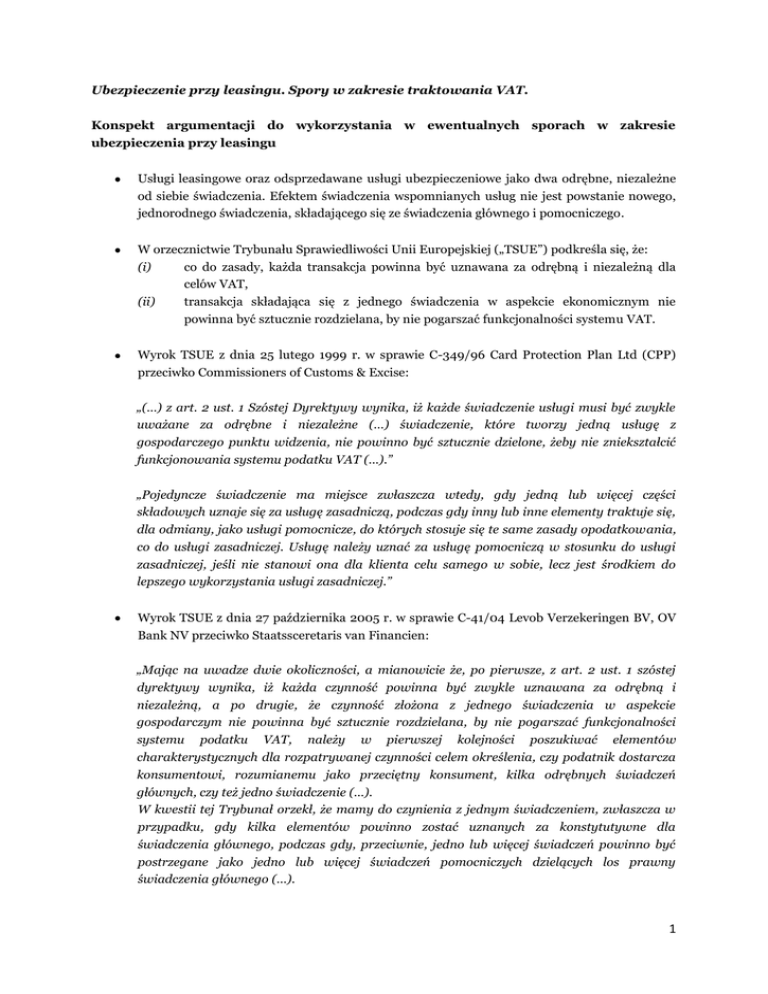 Ubezpieczenie przy leasingu. Spory w zakresie traktowania VAT. Konspekt argumentacji do wykorzystania w ewentualnych sporach w zakresie ubezpieczenia przy leasingu Usługi leasingowe oraz odsprzedawane usługi ubezpieczeniowe jako dwa odrębne, niezależne od siebie świadczenia. Efektem świadczenia wspomnianych usług nie jest powstanie nowego, jednorodnego świadczenia, składającego się ze świadczenia głównego i pomocniczego. W orzecznictwie Trybunału Sprawiedliwości Unii Europejskiej („TSUE”) podkreśla się, że: (i) co do zasady, każda transakcja powinna być uznawana za odrębną i niezależną dla celów VAT, (ii) transakcja składająca się z jednego świadczenia w aspekcie ekonomicznym nie powinna być sztucznie rozdzielana, by nie pogarszać funkcjonalności systemu VAT. Wyrok TSUE z dnia 25 lutego 1999 r. w sprawie C-349/96 Card Protection Plan Ltd (CPP) przeciwko Commissioners of Customs & Excise: „(…) z art. 2 ust. 1 Szóstej Dyrektywy wynika, iż każde świadczenie usługi musi być zwykle uważane za odrębne i niezależne (…) świadczenie, które tworzy jedną usługę z gospodarczego punktu widzenia, nie powinno być sztucznie dzielone, żeby nie zniekształcić funkcjonowania systemu podatku VAT (…).” „Pojedyncze świadczenie ma miejsce zwłaszcza wtedy, gdy jedną lub więcej części składowych uznaje się za usługę zasadniczą, podczas gdy inny lub inne elementy traktuje się, dla odmiany, jako usługi pomocnicze, do których stosuje się te same zasady opodatkowania, co do usługi zasadniczej. Usługę należy uznać za usługę pomocniczą w stosunku do usługi zasadniczej, jeśli nie stanowi ona dla klienta celu samego w sobie, lecz jest środkiem do lepszego wykorzystania usługi zasadniczej.” Wyrok TSUE z dnia 27 października 2005 r. w sprawie C-41/04 Levob Verzekeringen BV, OV Bank NV przeciwko Staatssceretaris van Financien: „Mając na uwadze dwie okoliczności, a mianowicie że, po pierwsze, z art. 2 ust. 1 szóstej dyrektywy wynika, iż każda czynność powinna być zwykle uznawana za odrębną i niezależną, a po drugie, że czynność złożona z jednego świadczenia w aspekcie gospodarczym nie powinna być sztucznie rozdzielana, by nie pogarszać funkcjonalności systemu podatku VAT, należy w pierwszej kolejności poszukiwać elementów charakterystycznych dla rozpatrywanej czynności celem określenia, czy podatnik dostarcza konsumentowi, rozumianemu jako przeciętny konsument, kilka odrębnych świadczeń głównych, czy też jedno świadczenie (…). W kwestii tej Trybunał orzekł, że mamy do czynienia z jednym świadczeniem, zwłaszcza w przypadku, gdy kilka elementów powinno zostać uznanych za konstytutywne dla świadczenia głównego, podczas gdy, przeciwnie, jedno lub więcej świadczeń powinno być postrzegane jako jedno lub więcej świadczeń pomocniczych dzielących los prawny świadczenia głównego (…). 1 Podobnie jest w przypadku, jeśli dwa lub więcej świadczenia (lub czynności) dokonane przez podatnika na rzecz konsumenta, rozumianego jako przeciętny konsument, są tak ściśle związane, że stanowią one obiektywnie jedno tylko nierozerwalne świadczenie gospodarcze, którego rozdzielenie miałoby charakter sztuczny.” Wyrok TSUE z dnia 21 lutego 2008 r. w sprawie C-425/06 Ministero dell’Economia e delle Finanse przeciwko Part Service Srl: „(…) z jej [Szóstej Dyrektywy VAT – przyp.] art. 2 wynika, że każde świadczenie powinno być zwykle uznawane za odrębne i niezależne (…).” Usługa ubezpieczeniowa jako cel sam w sobie dla leasingobiorcy, a nie środek do lepszego czy prawidłowego wykonania usługi leasingu. Brak charakteru pomocniczego usługi ubezpieczeniowej względem usługi leasingu. Rozdzielenie usługi leasingu i usługi ubezpieczenia nie ma sztucznego charakteru. Wyraźne wskazanie odrębności tych usług na gruncie Kodeksu cywilnego, przewidującego odrębne regulacje w zakresie umowy leasingu (Księga trzecia, Tytuł XVII 1) i umowy ubezpieczenia (Księga trzecia, Tytuł XXVII). Swoboda leasingodawcy i leasingobiorcy w zakresie różnorodnego ustalenia sposobu ubezpieczenia przedmiotu leasingu, tj. zarówno (i) możliwość po stronie leasingodawcy ubezpieczenia przedmiotu leasingu w swoim imieniu, na koszt leasingobiorcy i obciążenia jego kosztem leasingobiorcy, jak i (ii) możliwość po stronie leasingobiorcy samodzielnego nabycia usługi ubezpieczeniowej bezpośrednio u ubezpieczyciela. Brak jakiegokolwiek wpływu sposobu ubezpieczenia przedmiotu leasingu na funkcjonowanie samej usługi leasingu. Inne cele w obrocie gospodarczym realizowane przez usługę leasingu i usługę ubezpieczenia. Umowa leasingu jako sposób finansowania działalności gospodarczej leasingobiorcy; umowa ubezpieczenia jako związana z zabezpieczeniem przez ubezpieczyciela ryzyka związanego z utratą bądź uszkodzeniem rzeczy. Wniosek Komisji Wspólnot Europejskich z dnia 20 lutego 2008 r. w sprawie dyrektywy Rady zmieniającej dyrektywę 2006/112/WE w sprawie wspólnego systemu podatku od wartości dodanej w odniesieniu do opodatkowania usług ubezpieczeniowych i finansowych [KOM(2007) 747 wersja ostateczna/2, skreślający i zastępujący wniosek w sprawie dyrektywy Rady COM(2007) 747 wersja ostateczna z dnia 28 listopada 2007 r.] przewiduje jasne uregulowanie sytuacji, w której, w przypadku, gdy elementem określonej transakcji jest element ubezpieczenia, takie ubezpieczenie jest traktowane jako oddzielna usługa. Praktyka traktowania usługi leasingu i usługi ubezpieczenia jako rozdzielnych świadczeń w wielu Państwach Członkowskich Unii Europejskiej (m.in. w Irlandii, Finlandii, Włoszech, Luksemburgu, Portugalii, Holandii, Czechach, Estonii, Słowacji, Słowenii oraz Bułgarii). Odrębność usługi leasingu i usługi ubezpieczenia przedmiotu leasingu determinuje odrębne opodatkowanie tych usług. W konsekwencji – konieczność odrębnego określania podstawy 2 