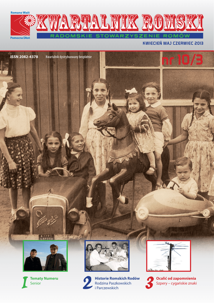 Romano Waśt Pomocna Dłoń KWIECIEŃ MAJ CZERWIEC 2013 ISSN 2082-4378 nr 10/3 Kwartalnik dystrybuowany bezpłatnie Tematy Numeru Senior Historie Romskich Rodów Rodzina Paszkowskich i Parczewskich Ocalić od zapomnienia Szpery – cygańskie znaki OD REDAKCJI / SPIS TREŚCI / STOPKA AKTUALNOŚCI W numerze Od redakcji Tematy Numeru Senior Zbliża się koniec pewnego etapu. Bieżący numer kwartalnika jest bowiem ostatnim numerem drugiej edycji w ramach, której wydaliśmy 6 numerów czasopisma. Jak dotąd staraliśmy się zainteresować państwa tematami ważnymi dla społeczności romskiej. Współczesność i tradycja, która szczególnie w kulturze materialnej odchodzi w przeszłość. Nowe numery czasopisma również będą poruszały te zagadnienia, ale w zmienionej formie. Tymczasem zapraszamy do lektury aktualnego, równie ciekawego numeru „Kwartalnika Romskiego”. Historie Romskich Rodów Rodzina Paszkowskich i Parczewskich Dawa numero kwartalnikoskro sy pe jagur dre wawyr edycja wawyre projektoskro, dre sawo wydyjam śow numery. Ke dawa ćiro kerasys dasawe tematy sawe sys ważna romenge i sawe interesynen gadźien. Dadywesuno dywes i tradycja dre ćiro kaj sy kultura pał łowe, oddźał ke pałatune ćiry. Newe numery dre kwartalniko jawena da korkore tematy dre wawyr forma. A kana zamangas ke dawa „Kwartalniko Romano” den apre, sy sostyr. Ocalić od zapomnienia Szpery – cygańskie znaki Redaktoro naczelno Agnieszka Mirosława Caban Spis treści Aktualności . . . . . . . . . . . . . . . . . . . . . . . . . . . . . . . . . 3 Stopka redakcyjna Wydarzenia . . . . . . . . . . . . . . . . . . . . . . . . . . . . . . . . . 6 Własność i wydawca: Radomskie Stowarzyszenie Romów ul. Twarda 13, 26-600 Radom www.romowieradom.pl www.romanowast.pl Tematy numeru . . . . . . . . . . . . . . . . . . . . . . . . . . . . . . 8 Historie Romskich Rodów . . . . . . . . . . . . . . . . . . . 14 Kultura . . . . . . . . . . . . . . . . . . . . . . . . . . . . . . . . . . . . 20 Zespół redakcyjny: Redaktor naczelny: Agnieszka M. Caban Redaktor działu publicystycznego: dr Justyna Garczyńska Redaktor działu poradniczo-informacyjnego: Grzegorz Kondrasiuk Wywiad . . . . . . . . . . . . . . . . . . . . . . . . . . . . . . . . . . . . 22 Współpraca: Jan Adamowski, Adam Bartosz, Agnieszka J. Kowarska, Grzegorz Kondrasiuk, Jacek Milewski, Stanisław Stankiewicz, Marcin Wosik Romanipen . . . . . . . . . . . . . . . . . . . . . . . . . . . . . . . . 28 Recenzje . . . . . . . . . . . . . . . . . . . . . . . . . . . . . . . . . . . 24 Romskie profesje . . . . . . . . . . . . . . . . . . . . . . . . . . . 25 Publikowane w Kwartalniku Romskim artykuły są recenzowane Recenzent numeru 10/3 2013: prof. dr hab. Jan Adamowski Młodzież romska pisze . . . . . . . . . . . . . . . . . . . . . 29 Praktyczne porady . . . . . . . . . . . . . . . . . . . . . . . . . 31 Z życia wzięte . . . . . . . . . . . . . . . . . . . . . . . . . . . . . . 34 Projekt i skład: Dominik Popławski Druk: PRINTY POLAND Tadeusz Porzyczka, ul. M.C. Skłodowskiej 5, 26-600 Radom. Na okładce: Dzieci romskie lata 60-te, Gorzów Wielkopolski (Archiwum rodzinne) Nakład: 300 egz. Paramisi romane . . . . . . . . . . . . . . . . . . . . . . . . . . . 36 Ocalić od zapomnienia . . . . . . . . . . . . . . . . . . . . . 39 Aktualności Spotkania na rzecz Dialogu w Sejnach Nabór na seminarium „Sinti i Romowie – historia i teraźniejszość” 18 kwietnia w Domu Pogranicza, ul. Piłsudskiego 37 w Sejnach odbyło się spotkanie z Piotrem Wójcikiem – fotografem, redaktorem albumów kuratorem wystaw i inicjatorem działań artystycznych dotyczących dokumentu fotograficznego, który od wielu lat fotografuje Romów w Europie i współtworzy kwartalnik Dialog-Pheniben w jego nowej formule. Rozmowę z fotografem przeprowadzili m.in., Bożena Schroeder z Fundacji Pogranicze oraz Tomasz Kizny, fotograf i dokumentalista. Spotkanie poprowadziła dr Kinga Orzeł-Dereń. W programie znalazł się także wernisaż wystawy „Romowie Europy” autorstwa Piotra Wójcika pod kuratelą artystyczną Dominique Roynette. Organizatorem wystaw było Stowarzyszenie Romów w Polsce, Fundacja Opowiedz To - Picture This, Fundacja Dialog-Pheniben, Fundacja Pogranicze. Celem seminarium „Sinti i Romowie – historia i teraźniejszość” jest wspólnie badanie, z perspektywy polskiej i niemieckiej, procesu pozbawiania praw, wykluczania i eksterminacji Sinti i Romów w przeszłości oraz naświetlenie współczesnych form ich dyskryminacji w Europie. Szczególna uwaga zostanie zwrócona na fakt mordu na 20.000 Sinti i Romów w KL Auschwitz. Pamięć o nich przywracana jest co roku 2 sierpnia, w rocznicę likwidacji tzw. „obozu cygańskiego”. Uczestnicy seminarium wezmą udział w corocznych obchodach rocznicy na terenie obozu. Termin seminarium: 28.07.-03.08.2013 w MDSM Oświęcim. Organizatorami są: MDSM Oświęcim, Stowarzyszenie Romów w Polsce, Alternatywne Centrum Młodzieży Dessau. I Katowickie Dni Kultury Romów „Choć raz zobacz, jak się kręcą tylne koła wozu” Nowych wydarzeń związanych z kulturą romską przybywa. Nie są to tylko stałe wydarzenia, takie jak festiwale i koncerty tworzone z dużym rozmachem, ale również regionalne obchody. Takim wydarzeniem były z pewnością I Katowickie Dni Kultury Romów, które odbyły się 8 i 9 kwietnia w Miejskim Domu Kultury „Bogucice-Zawodzie” w Katowicach. W ramach programu obchodów odbyła się wystawa plastyczna uczniów katowickich szkół o tematyce romskiej oraz występ w wykonaniu Romskiej Orkiestry Kameralnej z Koszyc ze Słowacji pod dyrekcją Karela Adama. „Choć raz zobacz, jak się kręcą tylne koła wozu” to tytuł CD i DVD wydanego na cześć Edwarda Dębickiego. Jest to uhonorowanie bogatego dorobku artystycznego muzyka i kompozytora. Na płytach umieszczone zostały przeboje oraz dokumentacja działalności artystycznej Edwarda Dębickiego. I to wszystko 