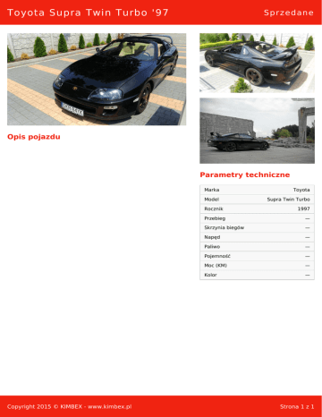 Toyota Supra Twin Turbo '97 Sprzedane Opis pojazdu Parametry techniczne Marka Toyota Model Supra Twin Turbo Rocznik Copyright 2015 © KIMBEX - www.kimbex.pl 1997 Przebieg — Skrzynia biegów — Napęd — Paliwo — Pojemność — Moc (KM) — Kolor — Strona 1 z 1