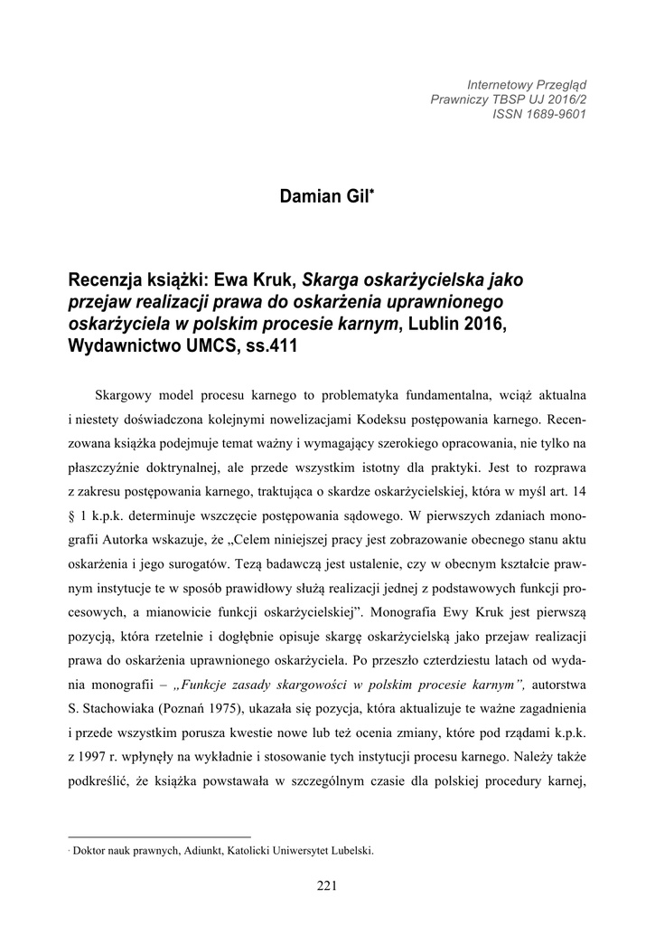 Internetowy Przegląd Prawniczy TBSP UJ 2016/2 ISSN 1689-9601 Damian Gil∗ Recenzja książki: Ewa Kruk, Skarga oskarżycielska jako przejaw realizacji prawa do oskarżenia uprawnionego oskarżyciela w polskim procesie karnym, Lublin 2016, Wydawnictwo UMCS, ss.411 Skargowy model procesu karnego to problematyka fundamentalna, wciąż aktualna i niestety doświadczona kolejnymi nowelizacjami Kodeksu postępowania karnego. Recenzowana książka podejmuje temat ważny i wymagający szerokiego opracowania, nie tylko na płaszczyźnie doktrynalnej, ale przede wszystkim istotny dla praktyki. Jest to rozprawa z zakresu postępowania karnego, traktująca o skardze oskarżycielskiej, która w myśl art. 14 § 1 k.p.k. determinuje wszczęcie postępowania sądowego. W pierwszych zdaniach monografii Autorka wskazuje, że „Celem niniejszej pracy jest zobrazowanie obecnego stanu aktu oskarżenia i jego surogatów. Tezą badawczą jest ustalenie, czy w obecnym kształcie prawnym instytucje te w sposób prawidłowy służą realizacji jednej z podstawowych funkcji procesowych, a mianowicie funkcji oskarżycielskiej”. Monografia Ewy Kruk jest pierwszą pozycją, która rzetelnie i dogłębnie opisuje skargę oskarżycielską jako przejaw realizacji prawa do oskarżenia uprawnionego oskarżyciela. Po przeszło czterdziestu latach od wydania monografii – „Funkcje zasady skargowości w polskim procesie karnym”, autorstwa S. Stachowiaka (Poznań 1975), ukazała się pozycja, która aktualizuje te ważne zagadnienia i przede wszystkim porusza kwestie nowe lub też ocenia zmiany, które pod rządami k.p.k. z 1997 r. wpłynęły na wykładnie i stosowanie tych instytucji procesu karnego. Należy także podkreślić, że książka powstawała w szczególnym czasie dla polskiej procedury karnej, ∗ Doktor nauk prawnych, Adiunkt, Katolicki Uniwersytet Lubelski. 221 spowitej obszernymi nowelizacjami z 27 września 2013 r., 20 lutego 2015 r. i 11 marca 2016 r. Książka składa się z dziewięciu rozdziałów, których systematyka jest dla czytelnika właściwym sposobem odkrycia tych ważnych, złożonych i interesujących zagadnień polskiego procesu karnego. Rozdział pierwszy Autorka nazwała „Skarga oskarżycielska a zasady procesowe”. Zasadnicze rozważania rozpoczyna od realizacji prawa oskarżonego do sądu. Podzielić należy pogląd, że „Nie można mówić o oskarżonym tam, gdzie nie ma oskarżenia. Oskarżenie jest przywilejem, ale też obowiązkiem wyspecjalizowanych instytucji państwa, a wszędzie tam, gdzie dopuszcza to obowiązujące prawo, również innych uprawnionych oskarżycieli” (s.31). To może oczywiste stwierdzenie Autorki, uświadamia czytelnikowi jak fundamentalne znaczenie ma sporządzenie, doręczenie i zapoznanie się ze skargą uprawnionego oskarżyciela. Na kolejnych stronach występuje odniesienie do zasad: skargowości, kontradyktoryjności i legalizmu, które ściśle łączą się z tezą badawczą i celem monografii. Na uwagę zasługuje część nt. „Oskarżenie a funkcja ochrony interesu publicznego”, w której Autorka wyraźnie twierdzi, że prokurator występujący jako rzecznik interesu społecznego nie jest stroną, zatem nie może przypisywać sobie innych uprawnień, niż te o których wyraźnie stanowi ustawa (s.50). Jeżeli zrezygnuje ze swoich uprawnień w trybie art. 14 § 2 k.p.k., zostaje automatycznie zwolniony z czynności stricte oskarżycielskich (s.51). Ewa Kruk gruntownie bada także zmiany z września 2013 r. i marca 2016 r., które miały istotny wpływ na omawiane zagadnienie. Kolejne rozważania dotyczą skargi oskarżycielskiej jako przesłanki procesowej oraz ważnej problematyce, którą przedstawiła w części – „Granice aktu oskarżenia a granice sądowego rozpoznania sprawy”. Z akceptacją należy się odnieść do twierdzenia, że „granice sądowego rozpoznania sprawy są obszarem objętym badaniem sądu w kontekście okoliczności wymienionych w art. 2 § 1 pkt 1 i są pojęciem węższym od pojęcia granic procesu karnego” (s.58). W kolejnej części Autorka prezentuje rodzaje i funkcje skarg oskarżycielskich. Posługuje się znanymi dotąd podziałami na akty oskarżenia zwyczajne, szczególne, prywatne, prokuratorskie, nieprokuratorskie oraz wyróżnia tzw. surogaty aktu oskarżenia. Nowym terminem użytym w książce jest „namiastka aktu oskarżenia”, do której zalicza wniosek o warunkowe umorzenie postępowania karnego (art. 336 k.p.k.) i wniosek prokuratora o umorzenie postępowania karnego połączony z wnioskiem o zastosowanie środków zabezpieczających (art. 324 k.p.k.) (s.69). Rzeczywiście wnioski te nie sposób zaliczyć do suroga- 222 tów aktu oskarżenia, natomiast nie budzi wątpliwości, że inicjują one postępowanie sądowe. W mojej ocenie lepszym terminem byłoby pojęcie „skargi zastępczej” lub „wniosku zastępczego”, które semantycznie wskazywałyby na fakt respektowania zasady skargowości, z uwzględnieniem osobliwego charakteru skargi. Trzeci rozdział traktuje o zwykłym akcie oskarżenia i jego elementach składowych. Ciekawe i zarazem nowatorskie są rozważania nt. języka aktu oskarżenia (s.89-93). Autorka trafnie zauważa, że „akt oskarżenia musi spełniać funkcję informacyjną, czego nie da się osiągnąć, brnąć w nazbyt hermetyczne i niezrozumiałe w swej warstwie językowej rozważania” (s. 92-93). Ewa Kruk skrupulatnie opisuje wymogi formalne aktu oskarżenia, o czym świadczą m.in. rozważania o podpisie oskarżyciela (s. 122-127) oraz nt. wniosku o zaniechanie wezwania niektórych świadków (s. 131-132). Osobną część poświęcono problematyce uproszczonych aktów oskarżenia i surogatów aktu oskarżenia. Początkowe wywody stanowią wprowadzenie do rozważań, które Autorka pogłębiła w rozdziałach VII – IX monografii. Na uwagę zasługuje dogłębna analiza problematyki surogatów aktu oskarżenia, połączona z oceną zmian wprow