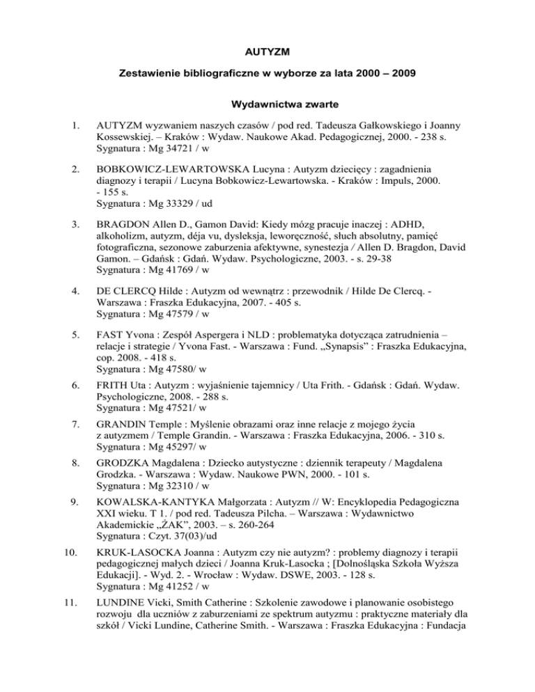 AUTYZM Zestawienie bibliograficzne w wyborze za lata 2000 – 2009 Wydawnictwa zwarte 1. AUTYZM wyzwaniem naszych czasów / pod red. Tadeusza Gałkowskiego i Joanny Kossewskiej. – Kraków : Wydaw. Naukowe Akad. Pedagogicznej, 2000. - 238 s. Sygnatura : Mg 34721 / w 2. BOBKOWICZ-LEWARTOWSKA Lucyna : Autyzm dziecięcy : zagadnienia diagnozy i terapii / Lucyna Bobkowicz-Lewartowska. - Kraków : Impuls, 2000. - 155 s. Sygnatura : Mg 33329 / ud 3. BRAGDON Allen D., Gamon David: Kiedy mózg pracuje inaczej : ADHD, alkoholizm, autyzm, déja vu, dysleksja, leworęczność, słuch absolutny, pamięć fotograficzna, sezonowe zaburzenia afektywne, synestezja / Allen D. Bragdon, David Gamon. – Gdańsk : Gdań. Wydaw. Psychologiczne, 2003. - s. 29-38 Sygnatura : Mg 41769 / w 4. DE CLERCQ Hilde : Autyzm od wewnątrz : przewodnik / Hilde De Clercq. Warszawa : Fraszka Edukacyjna, 2007. - 405 s. Sygnatura : Mg 47579 / w 5. FAST Yvona : Zespół Aspergera i NLD : problematyka dotycząca zatrudnienia – relacje i strategie / Yvona Fast. - Warszawa : Fund. „Synapsis” : Fraszka Edukacyjna, cop. 2008. - 418 s. Sygnatura : Mg 47580/ w 6. FRITH Uta : Autyzm : wyjaśnienie tajemnicy / Uta Frith. - Gdańsk : Gdań. Wydaw. Psychologiczne, 2008. - 288 s. Sygnatura : Mg 47521/ w 7. GRANDIN Temple : Myślenie obrazami oraz inne relacje z mojego Ŝycia z autyzmem / Temple Grandin. - Warszawa : Fraszka Edukacyjna, 2006. - 310 s. Sygnatura : Mg 45297/ w 8. GRODZKA Magdalena : Dziecko autystyczne : dziennik terapeuty / Magdalena Grodzka. - Warszawa : Wydaw. Naukowe PWN, 2000. - 101 s. Sygnatura : Mg 32310 / w 9. KOWALSKA-KANTYKA Małgorzata : Autyzm // W: Encyklopedia Pedagogiczna XXI wieku. T 1. / pod red. Tadeusza Pilcha. – Warszawa : Wydawnictwo Akademickie „śAK”, 2003. – s. 260-264 Sygnatura : Czyt. 37(03)/ud 10. KRUK-LASOCKA Joanna : Autyzm czy nie autyzm? : problemy diagnozy i terapii pedagogicznej małych dzieci / Joanna Kruk-Lasocka ; [Dolnośląska Szkoła WyŜsza Edukacji]. - Wyd. 2. - Wrocław : Wydaw. DSWE, 2003. - 128 s. Sygnatura : Mg 41252 / w 11. LUNDINE Vicki, Smith Catherine : Szkolenie zawodowe i planowanie osobistego rozwoju dla uczniów z zaburzeniami ze spektrum autyzmu : praktyczne materiały dla szkół / Vicki Lundine, Catherine Smith. - Warszawa : Fraszka Edukacyjna : Fundacja „Synapsis”, cop. 2008. - 232 s. Sygnatura : Mg 47581 / w 12. MACIARZ Aleksandra, Biadasiewicz Małgorzata : Dziecko autystyczne z zespołem Aspergera : studium przypadku / Aleksandra Maciarz, Małgorzata Biadasiewicz. – Kraków : Impuls, 2000. - 69 s. Sygnatura : Mg 30553 / w 13. MIHILEWICZ Stanisława : Teoria rozwoju umysłowego J. Piageta i przetwarzanie informacji u dzieci autystycznych // W: Dziecko z trudnościami w rozwoju / pod red. nauk. Stanisławy Mihilewicz. - Wyd. 2. - Kraków : Impuls, 2005. – s. 45-54 Sygnatura : Mg 46625 / w 14. NOWATORSKIE i alternatywne metody w teorii i praktyce pedagogiki specjalnej : przewodnik metodyczny / pod red. Władysław Dykcik, Barbara Szychowiak. - Poznań : Wydaw. Nauk. UAM, 2001. – 492 s. Sygnatura : Mg 34948 / w, Mg 35428 / w, Mg 35429 / w 15. OKOŃ Wincenty : Autyzm // W: Nowy słownik pedagogiczny / pod red. Wincentego Okonia. – Warszawa : Wydawnictwo Akademickie „śAK”, 2007. – s. 38 Sygnatura : Czyt. 37(03)/ ud 16. OLECHNOWICZ Hanna : Autyzm wczesny dziecięcy // W: Encyklopedia Pedagogiczna XXI wieku. T 1 / pod red. Tadeusza Pilcha. – Warszawa : Wydawnictwo Akademickie „śAK”, 2003. – s. 264-270 Sygnatura : Czyt. 37(03)/ud 17. OLECHNOWICZ Hanna: Drugie opowieści terapeutów / Hanna Olechnowicz. – Warszawa : Wydaw. Szk. i Pedagogiczne, 2000. - 208 s. Sygnatura : Mg 32613 / w 18. OLECHNOWICZ Hanna : Wokół autyzmu : fakty, skojarzenia, refleksje / Hanna Olechnowicz. - Warszawa : Wydaw. Szk. i Pedagogiczne, cop. 2004. - 104 s. Sygnatura : Mg 42176 / w 19. PEDAGOGIKA specjalna : [wybór literatury] / Pedagogiczna Biblioteka Wojewódzka im. prof. Tadeusza Kotarbińskiego w łodzi. – Wyd. 4 zm. i popr. - Łódź: PBW, 2001. – 2 T. T.1, Zagadnienia ogólne, kształcenie specjalne, autyzm, zespół downa, poraŜenie mózgowe, dziecko niepełnosprawne / [oprac. i red. Marcin Paszkowski]. - 37 s. Sygnatura : Czyt. M011/016 / ud 20. PISULA Ewa : Autyzm i przywiązanie : [studia nad interakcjami dzieci z autyzmem i ich matek] / Ewa Pisula. - Gdańsk : Gdań. Wydaw. Psychologiczne, 2003. - 160 s. Sygnatura : Mg 40408 / w 21. PISULA Ewa : Autyzm u dzieci : diagnoza, klasyfikacja, etiologia / Ewa Pisula. Warszawa : Wydaw. Naukowe PWN, 2000. - 152 s. Sygnatura : Mg 32768 / w 22. PISULA Ewa : Dziecko z zespołem Aspergera // W: Dzieci chore, niepełnosprawne i z utrudnieniami w rozwoju / pod red. nauk. Beaty Cytowskiej, Barbary Wilczury, Andrzeja Stawarskiego. - Kraków : Impuls, 2008. – s. 375-387 Sygnatura : Mg 48035 / w 23. PISULA Ewa : Jak matki spostrzegają swoje dzieci z autyzmem // W: Rodzina z dzieckiem z niepełnosprawnością / pod red. Ewy Pisuli i Doroty Danilewicz. - Gdańsk : Harmonia, 2007. - s. 47-72 Sygnatura : Mg 46627 / w 24. PISULA Ewa : Małe dziecko z autyzmem : [diagnoza i terapia] / Ewa Pisula. Gdańsk : Gdań. Wydaw. Psychologiczne, 2005. – 172 s. Sygnatura : Mg 46627 / w 25. PRZYBYLSKA Ewa : Autyzm pisany miłością : relacje rodziców i terapeutów / Ewa Przybylska; Stowarzyszenie Rodziców Dzieci Autystycznych. – Gorzów Wielkopolski. : Woj. Ośr. Metodyczny, 2007. - 90 s. Sygnatura : Mg 45629 / w, Mg 45630 / w, PIP 0/9(06)/WOM /ud 26. RANDALL Peter, Parker Jonathan : Autyzm: jak pomóc rodzinie / Peter Randall, Jonathan Parker - Gdańsk : Gdań. Wydaw. Psychologiczne, 2001. - 319 s. Sygnatura : Mg 33721 / w 27. SEKUŁOWICZ Małgorzata : Psychologiczno-pedagogiczne aspekty terapii artystycznej dzieci autystycznych // W: Wybrane elementy terapii / pod red. nauk. Lidii Kataryńczuk-Manii. - Zielona Góra : Wydaw. UZ, 2002. - s. 41-47 Sygnatura : Mg 36389 / ud 28. WALCZOWSKA-DUTKA Maria : Program nauki