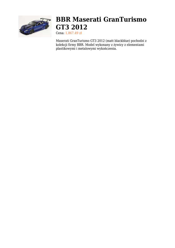 BBR Maserati GranTurismo GT3 2012 Cena: 1,867.49 zł Maserati GranTurismo GT3 2012 (matt blackblue) pochodzi z kolekcji firmy BBR. Model wykonany z żywicy z elementami plastikowymi i metalowymi wykończenia.