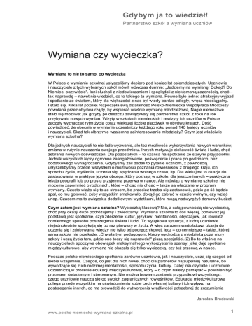 Gdybym ja to wiedział! Partnerstwo szkół a wymiana uczniów Wymiana czy wycieczka? Wymiana to nie to samo, co wycieczka W Polsce o wymianie szkolnej usłyszeliśmy dopiero pod koniec lat osiemdziesiątych. Uczniowie i nauczyciele z tych wybranych szkół mówili wówczas dumnie: „Jedziemy na wymianę! Dokąd? Do Niemiec, oczywiście". Inni słuchali z niedowierzaniem i spoglądali z niekłamaną zazdrością, choć – tak naprawdę – nawet nie wiedzieli, co to takiego ta wymiana. Pewne było jedno: atrakcyjny wyjazd i spotkanie ze światem, który dla większości z nas był wtedy bardzo odległy, wręcz nieosiągalny. I stało się. Kilka lat później rozpoczęła swą działalność Polsko-Niemiecka Współpraca Młodzieży powołana przez obydwa rządy, by wspierać właśnie wymianę młodzieżową. Nagle niemożliwe stało się możliwe: jak grzyby po deszczu zawiązywały się partnerstwa szkół, z roku na rok przybywało nowych wymian. Wizyty w szkołach niemieckich i rewizyty ich uczniów w Polsce zaczęły wyznaczać rytm życia coraz większej liczbie placówek w obydwu krajach. Dość powiedzieć, że obecnie w wymianie uczestniczy każdego roku ponad 140 tysięcy uczniów i nauczycieli. Skąd tak olbrzymie wzajemne zainteresowanie młodzieży? Czym jest właściwie wymiana szkolna? Dla jednych nauczycieli to nie lada wyzwanie, ale też możliwość wykorzystania nowych warunków, zmiana w rutynie nauczania swojego przedmiotu. Innych motywuje ciekawość świata i ludzi, chęć zebrania nowych doświadczeń. Dla pozostałych – to szansa na spotkanie ze starymi przyjaciółmi. Jednak wszystkich łączy ogromne zaangażowanie, poświęcenie i praca po godzinach, bez dodatkowego wynagrodzenia. Gdybyśmy zaś zadali to pytanie uczniom, z pewnością usłyszelibyśmy przede wszystkim o możliwości poznania rówieśników z drugiego kraju, ich sposobu życia, myślenia, uczenia się, spędzania wolnego czasu, itp. Dla wielu jest to okazja do zastosowania w praktyce języka obcego, który poznają w szkole, dla jeszcze innych – praktyczna lekcja geografii lub po prostu przyjemna przerwa w nauce. Ale mówiąc o wymianie szkolnej nie możemy zapomnieć o rodzinach, które – chcąc nie chcąc – także są włączane w program wymiany. Często wiąże się to ze stresem, bo przecież trzeba się zastanowić, gdzie go ść będzie spał, co mu gotować, żeby wszystkim smakowało, dokąd go zabrać w czasie wolnym, czy wziąć urlop. Czasem ma to związek z dodatkowymi wydatkami, które mogą nadwyrężyć domowy budżet. Czym zatem jest wymiana szkolna? Wycieczką klasową? Nie, z całą pewnością nie wycieczką, choć przy okazji dużo podróżujemy i zwiedzamy. Wymiana szkolna to coś więcej, ponieważ jej podstawą jest spotkanie, czyli zderzenie kultur, języków, mentalności, obyczajów, jak również odmiennego sposobu postrzegania świata i ludzi. To wyjątkowa sytuacja, z którą uczniowie niejednokrotnie spotykają się po raz pierwszy w życiu. A więc zarazem wartościowa okazja do uczenia się i zdobywania wiedzy nie tylko tej podręcznikowej, lecz – co cenniejsze – takiej, której sama szkoła nie przekaże. „Chwała tym pedagogom, którzy wychodzą z młodzieżą poza mury szkoły i uczą życia tam, gdzie ono toczy się naprawdę!" piszą specjaliści.(2) Bo to właśnie na nauczycielach spoczywa obowiązek maksymalnego wykorzystania szansy, jaką daje spotkanie międzykulturowe, aby wymiana nie okazała się tylko wycieczką, czy też przerwą w nauce. Podczas polsko-niemieckiego spotkania zarówno uczniowie, jak i nauczyciele, uczą się czegoś od siebie wzajemnie. Czegoś, co jest dla nich nowe, choć dla partnerów najzupełniej naturalne, bo wywodzące się z ich rodzimej mentalności, sposobu życia, kultury. Dalej: nauczyciele i uczniowie uczestniczą w procesie edukacji międzykulturowej, który – o czym należy pamiętać – powinien być procesem świadomym i sterowanym. Nie można bowiem zostawić przypadkowi wszystkiego, czego uczniowie nauczą się od swoich zagranicznych rówieśników. Edukacja międzykulturowa polega przede wszystkim na uświadomieniu sobie cech własnej kultury i ich wpływu na postrzeganie innych, co ma prowadzić do wytworzenia wrażliwości potrzebnej do zrozumienia Jarosław Brodowski www.polsko-niemiecka-wymiana-szkolna.pl 1 Gdybym ja to wiedział! Partnerstwo szkół a wymiana uczniów tego, co obce. Dzięki temu można się stać bardziej otwartym na innych i tolerancyjnym, nauczyć się unikania stereotypów, a co najważniejsze - dzięki zmianie perspektywy – poznać lepiej samego siebie. Uczniowie i nauczyciele nie skorzystają ze spotkania międzykulturowego, jeżeli program wymiany będzie ograniczał się tylko do wspólnego zwiedzania kolejnej katedry z przewodnikiem, wizyty w ratuszu i wysłuchania okrągłych zdań pana burmistrza, czy nawet wspólnego wyjścia na dyskotekę. Nie oznacza to, że takie punkty programu – jakże typowe! – są złe i trzeba z nich zrezygnować. Poznanie miasta partnerów zza granicy jest ważne, a spotkanie z burmistrzem często konieczne – zwłaszcza gdy dorzucił trochę grosza do naszej wymiany! Ale proces edukacji może zadziałać dopiero po zastosowaniu odpowiednich metod, które zaktywizują uczniów, zmotywują ich do współdziałania i wspólnej pracy. Dopiero wtedy będą mieli możliwość wymiany poglądów, doświadczeń, czyli autentycznej komunikacji i wzajemnego poznania się. Czyż nie byłoby lepiej penetrować zakamarki katedry w małej, mieszanej grupie, w poszukiwaniu odpowiedzi na wymyślone wcześniej pytanie, lub by znaleźć odpowiedź na jakąś intrygującą zagadkę z przeszłości? Czyż nie byłaby ciekawsza polsko-niemiecka debata uczniów z udziałem burmistrza, która poruszałaby aktualne problemy młodzieży? Może przyniosłaby celne uwagi i rozwiązania problemów gminy, a już z całą pewnością pozwoliłaby uczni