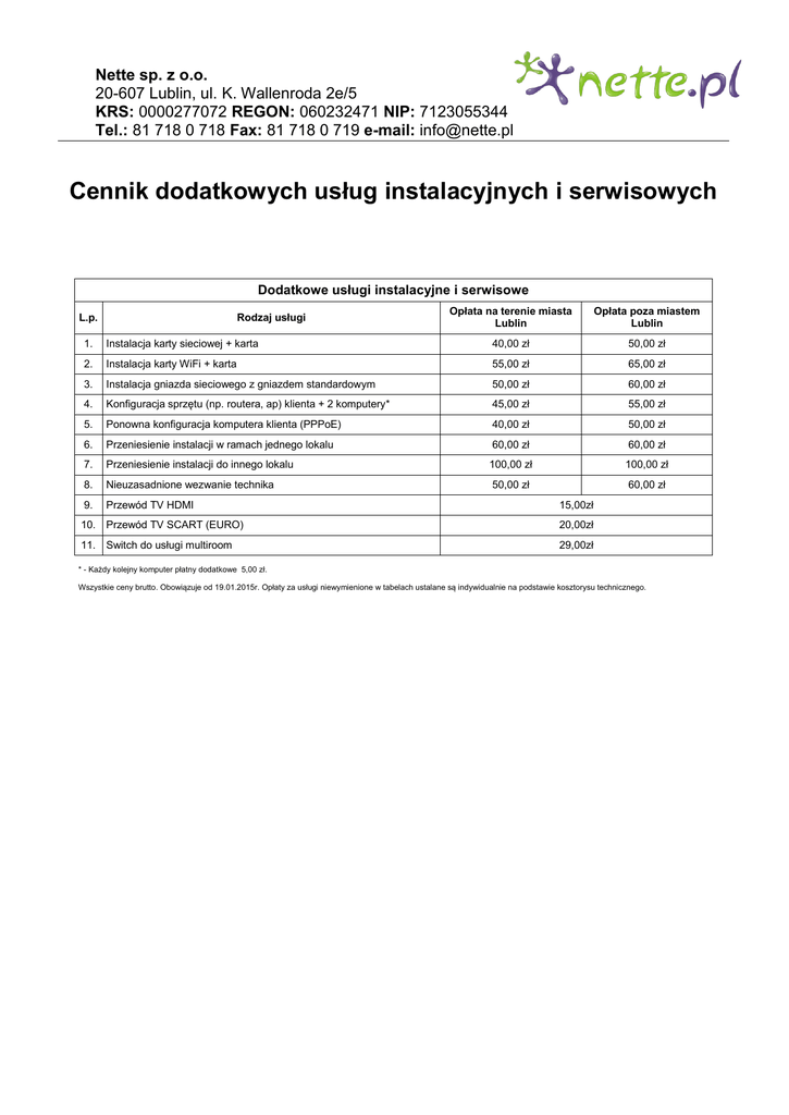 Nette sp. z o.o. 20-607 Lublin, ul. K. Wallenroda 2e/5 KRS: 0000277072 REGON: 060232471 NIP: 7123055344 Tel.: 81 718 0 718 Fax: 81 718 0 719 e-mail: [email protected] Cennik dodatkowych usług instalacyjnych i serwisowych Dodatkowe usługi instalacyjne i serwisowe Rodzaj usługi L.p. Opłata na terenie miasta Lublin Opłata poza miastem Lublin 1. Instalacja karty sieciowej + karta 40,00 zł 50,00 zł 2. Instalacja karty WiFi + karta 55,00 zł 65,00 zł 3. Instalacja gniazda sieciowego z gniazdem standardowym 50,00 zł 60,00 zł 4. Konfiguracja sprzętu (np. routera, ap) klienta + 2 komputery* 45,00 zł 55,00 zł 5. Ponowna konfiguracja komputera klienta (PPPoE) 40,00 zł 50,00 zł 6. Przeniesienie instalacji w ramach jednego lokalu 60,00 zł 60,00 zł 7. Przeniesienie instalacji do innego lokalu 100,00 zł 100,00 zł 8. Nieuzasadnione wezwanie technika 50,00 zł 60,00 zł 9. Przewód TV HDMI 15,00zł 10. Przewód TV SCART (EURO) 20,00zł 11. Switch do usługi multiroom 29,00zł * - Każdy kolejny komputer płatny dodatkowe 5,00 zł. Wszystkie ceny brutto. Obowiązuje od 19.01.2015r. Opłaty za usługi niewymienione w tabelach ustalane są indywidualnie na podstawie kosztorysu technicznego.