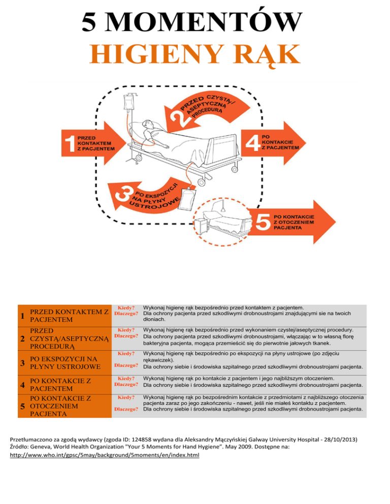 5 MOMENTÓW HIGIENY RĄK 1 PRZED KONTAKTEM Z PACJENTEM 2 PRZED CZYSTĄ/ASEPTYCZNĄ PROCEDURĄ Kiedy? Wykonaj higienę rąk bezpośrednio przed kontaktem z pacjentem. Dlaczego? Dla ochrony pacjenta przed szkodliwymi drobnoustrojami znajdującymi sie na twoich dłoniach. Kiedy? Wykonaj higienę rąk bezpośrednio przed wykonaniem czystej/aseptycznej procedury. Dlaczego? Dla ochrony pacjenta przed szkodliwymi drobnoustrojami, włączając w to własną florę bakteryjna pacjenta, mogąca przemieścić się do pierwotnie jałowych tkanek. Wykonaj higienę rąk bezpośrednio po ekspozycji na płyny ustrojowe (po zdjęciu rękawiczek). Dlaczego? Dla ochrony siebie i środowiska szpitalnego przed szkodliwymi drobnoustrojami pacjenta. Kiedy? 3 4 5 PO EKSPOZYCJI NA PŁYNY USTROJOWE PO KONTAKCIE Z PACJENTEM PO KONTAKCIE Z OTOCZENIEM PACJENTA Kiedy? Wykonaj higienę rąk po kontakcie z pacjentem i jego najbliższym otoczeniem. Dlaczego? Dla ochrony siebie i środowiska szpitalnego przed szkodliwymi drobnoustrojami pacjenta. Wykonaj higienę rąk po bezpośrednim kontakcie z przedmiotami z najbliższego otoczenia pacjenta zaraz po jego zakończeniu - nawet, jeśli nie miałeś kontaktu z pacjentem. Dlaczego? Dla ochrony siebie i środowiska szpitalnego przed szkodliwymi drobnoustrojami pacjenta. Kiedy? Przetłumaczono za zgodą wydawcy (zgoda ID: 124858 wydana dla Aleksandry Mączyńskiej Galway University Hospital - 28/10/2013) Źródło: Geneva, World Health Organization "Your 5 Moments for Hand Hygiene”. May 2009. Dostępne na: http://www.who.int/gpsc/5may/background/5moments/en/index.html