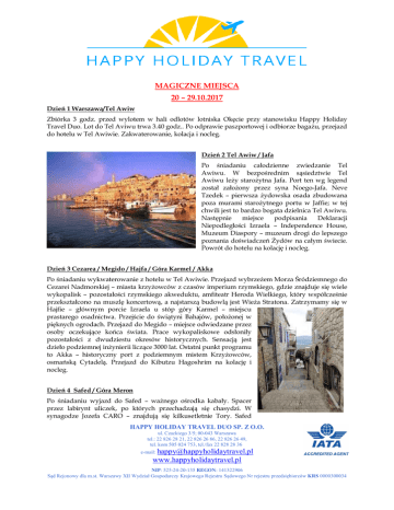 MAGICZNE MIEJSCA 20 – 29.10.2017 Dzień 1 Warszawa/Tel Awiw Zbiórka 3 godz. przed wylotem w hali odlotów lotniska Okęcie przy stanowisku Happy Holiday Travel Duo. Lot do Tel Aviwu trwa 3.40 godz.. Po odprawie paszportowej i odbiorze bagażu, przejazd do hotelu w Tel Awiwie. Zakwaterowanie, kolacja i nocleg. Dzień 2 Tel Awiw / Jafa Po śniadaniu całodzienne zwiedzanie Tel Awiwu. W bezpośrednim sąsiedztwie Tel Awiwu leży starożytna Jafa. Port ten wg legend został założony przez syna Noego-Jafa. Neve Tzedek – pierwsza żydowska osada zbudowana poza murami starożytnego portu w Jaffie; w tej chwili jest to bardzo bogata dzielnica Tel Awiwu. Następnie miejsce podpisania Deklaracji Niepodległości Izraela – Independence House, Muzeum Diaspory – muzeum drogi do lepszego poznania doświadczeń Żydów na całym świecie. Powrót do hotelu na kolację i nocleg. Dzień 3 Cezarea / Megido / Hajfa / Góra Karmel / Akka Po śniadaniu wykwaterowanie z hotelu w Tel Awiwie. Przejazd wybrzeżem Morza Śródziemnego do Cezarei Nadmorskiej – miasta krzyżowców z czasów imperium rzymskiego, gdzie znajduje się wiele wykopalisk – pozostałości rzymskiego akweduktu, amfiteatr Heroda Wielkiego, który współcześnie przekształcono na muszlę koncertową, a najstarszą budowlą jest Wieża Stratona. Zatrzymamy się w Hajfie – głównym porcie Izraela u stóp góry Karmel – miejscu prastarego osadnictwa. Przejście do świątyni Bahajów, położonej w pięknych ogrodach. Przejazd do Megido – miejsce odwiedzane przez osoby oczekujące końca świata. Prace wykopaliskowe odsłoniły pozostałości z dwudziestu okresów historycznych. Sensacją jest dzieło podziemnej inżynierii liczące 3000 lat. Ostatni punkt programu to Akka – historyczny port z podziemnym mistem Krzyżowców, osmańską Cytadelą. Przejazd do Kibutzu Hagoshrim na kolację i nocleg. Dzień 4 Safed / Góra Meron Po śniadaniu wyjazd do Safed – ważnego ośrodka kabały. Spacer przez labirynt uliczek, po których przechadzają się chasydzi. W synagodze Jozefa CARO – znajdują się kilkusetletnie Tory. Safed HAPPY HOLIDAY TRAVEL DUO SP. Z O.O. ul. Czackiego 3/5; 00-043 Warszawa tel.: 22 826 28 21, 22 826 26 86, 22 826 26 49, tel. kom 505 024 753, tel./fax 22 828 28 36 e-mail: [email protected] www.happyholidaytravel.pl NIP: 525-24-20-135 REGON: 141322906 Sąd Rejonowy dla m.st. Warszawy XII Wydział Gospodarczy Krajowego Rejestru Sądowego Nr rejestru przedsiębiorców KRS 0000300034 niewielkie miasteczko położone 900 m nad poziomem morza, skąd rozpościera się przepiękny widok na Hermon, Liban, Górę Meron; wg przepowiedni Safed ma do odegrania znaczącą rolę w końcowym odkupieniu. Powrót do kibutzu na kolację i nocleg. Dzień 5 Wzgórza Golan / Katzerin / Beit She’an Po śniadaniu wykwaterowanie i przejazd do umownej stolicy Wzgórz Golan – Katzerin. W tym dość młodym mieście, bo założonym w 1977 roku, znajduje się Muzeum Archeologiczne Golanu oraz Muzeum Lalek, gdzie za pomocą lalek przedstawia się sceny z historii Izraela. Niedaleko miasta znajduje się Park Starożytności Katzerin. Kolejnym przystankiem w drodze do Jerozolimy będzie miasto Bet She’an. W mieście tym znajduje się Park Narodowy Bet She’an, gdzie można podziwiać wykopaliska archeologiczne minionych wieków. Jeszcze w drodze do hotelu w Jerozolimie będzie czas na podziwianie panoramy Starej Jerozolimy z Góry Oliwnej. Zakwaterowanie w hotelu w Jerozolimie, kolacja, nocleg. Dzień 6 Stara Jerozolima Po śniadaniu całodzienne zwiedzanie Starej Jerozolimy. Zobaczymy m.in. Ścianę Płaczu, Tunel Jerozolimski, Miasto Dawida, Wieżę Dawida – starożytną cytadelę wzniesioną w celu lepszej obrony Starej Jerozolimy, Burnt House – pozostałości domu z czasów Drugiej Świątyni, wykopaliska znajdują się sześć metrów poniżej obecnego poziomu ulicy, Cardo – zrekonstruowana główna ulica Jerozolimy z czasów rzymskich i bizantyjskich, ciągnąca się z północy na południe. Powrót do hotelu na kolację i nocleg. Dzień 7 Nowa Jerozolima Po śniadaniu wyjazd do Yad Vashem. Po południu zwiedzanie Muzeum Izraela, Knesseth, Budynki Parlamentu. Powrót do hotelu na kolację i nocleg. Dzień 8 Morze Martwe / Massada / Qumran Po śniadaniu wyjazd nad Morze Martwe, po drodze wjazd kolejką linową na Massadę. Powietrze nad morzem jest wyjątkowo suche, a temperatura wysoka. Z powodu depresji powietrze zawiera o 10%więcej tlenu, a brak miast i przemysłu decyduje o jego czystości. Wszystko to przyspiesza metabolizm i działa regenerująco na nasz organizm. W odległym o kilka kilometrów Qumran, znajdują się wykopaliska słynnych Zwojów znad Morza Martwego, uważane za jedno z najważniejszych odkryć w historii narodu żydowskiego. Powrót do Jerozolimy na kolację i nocleg. Dzień 9 Jerozolima Śniadanie i obiadokolacja w hotelu w Jerozolimie. Dzień wolny na zakupy, indywidualne zwiedzanie, odpoczynek. HAPPY HOLIDAY TRAVEL DUO SP. Z O.O. ul. Czackiego 3/5; 00-043 Warszawa tel.: 22 826 28 21, 22 826 26 86, 22 826 26 49, tel. kom 505 024 753, tel./fax 22 828 28 36 e-mail: [email protected] www.happyholidaytravel.pl NIP: 525-24-20-135 REGON: 141322906 Sąd Rejonowy dla m.st. Warszawy XII Wydział Gospodarczy Krajowego Rejestru Sądowego Nr rejestru przedsiębiorców KRS 0000300034 Dzień 10 Tel Awiw / Warszawa Nad ranem transfer na lotnisko do Tel Awiwu. Wylot do Warszawy o 06.00. CENA: 4.895 PLN Cena zawiera: • przelot rejsowymi liniami lotniczymi ELAL na trasie WAW – TLV - WAW • hotele **** • wyżywienie: śniadania i obiadokolacje w formie bufetu • licencjonowany przewodnik w języku polskim • klimatyzowany autokar na całej trasie przejazdów • ubezpieczenie AXA (KL 30.000 EURO, NW 4.000 EUR, bagaż podróżny 400 EUR) Cena nie zawiera: • biletów wstępu, napiwków – ok. 60 USD • dodatkowego ubezpieczenia od następstw chorób przewlekłych ok. 400 PLN • dodatkowego u