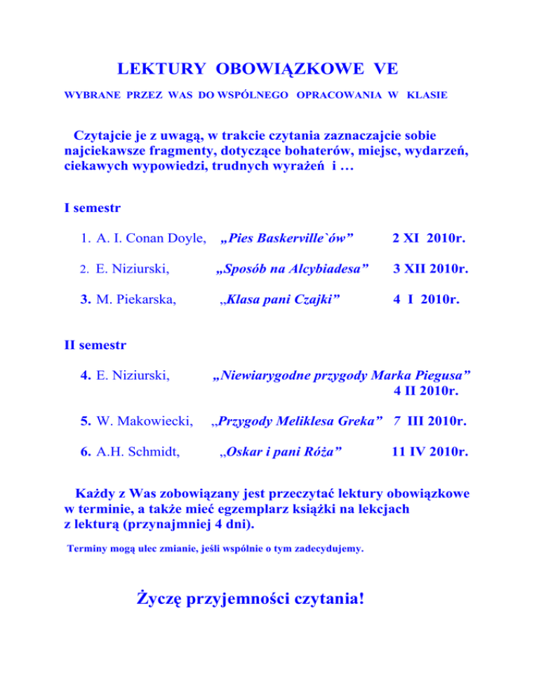 LEKTURY OBOWIĄZKOWE VE WYBRANE PRZEZ WAS DO WSPÓLNEGO OPRACOWANIA W KLASIE Czytajcie je z uwagą, w trakcie czytania zaznaczajcie sobie najciekawsze fragmenty, dotyczące bohaterów, miejsc, wydarzeń, ciekawych wypowiedzi, trudnych wyrażeń i … I semestr 1. A. I. Conan Doyle, „Pies Baskerville`ów” 2 XI 2010r. 2. E. Niziurski, „Sposób na Alcybiadesa” 3 XII 2010r. 3. M. Piekarska, „Klasa pani Czajki” 4 I 2010r. II semestr 4. E. Niziurski, „Niewiarygodne przygody Marka Piegusa” 4 II 2010r. 5. W. Makowiecki, „Przygody Meliklesa Greka” 7 III 2010r. 6. A.H. Schmidt, „Oskar i pani Róża” 11 IV 2010r. Każdy z Was zobowiązany jest przeczytać lektury obowiązkowe w terminie, a także mieć egzemplarz książki na lekcjach z lekturą (przynajmniej 4 dni). Terminy mogą ulec zmianie, jeśli wspólnie o tym zadecydujemy. Życzę przyjemności czytania! LEKTURY DOWOLNE PAMIĘTAJCIE O CZYTANIU DOWOLNYCH LEKTUR I ICH ZALICZANIU ORAZ PISANIU PRAC ! W I i II SEMESTRZE CZYTACIE PO DWIE KSIĄŻKI PRZEZ SIEBIE WYBRANE ! Do 19 X zaliczacie pierwszą lekturę dowolną, do 20 XII drugą, W II sem. trzecią lekturę zaliczacie do 22 III, czwartą i piątą ( czyli dwie książki) do 16 V ( i piszecie pracę roczną). Temat pracy rocznej ustalacie na konsultacjach do 16 XI ! Termin zaliczania lektury jest terminem oddania pracy pisemnej, czyli najpóźniej tydzień przed ustaloną datą musicie zaliczyć ustnie lekturę. Pilnujcie terminów ! Oceny z lektur mają duży wpływ na ocenę końcową ! Z DUŻĄ PRZYJEMNOŚCIĄ SŁUCHAM WASZYCH LEKTUROWYCH OPOWIEŚCI I CZYTAM WASZE PRACE ! POWODZENIA W DALSZYCH ZMAGANIACH Z JĘZYKIEM POLSKIM ! I semestr 1. Pierwsza lektura 2. Druga lektura 19 X ( u 12X ) 20 XII ( u 13XII ) II semestr 3. Trzecia lektura 4. Czwarta i piąta lektura 22 III ( u 15 III ) 16 V- roczna ( u 9V )