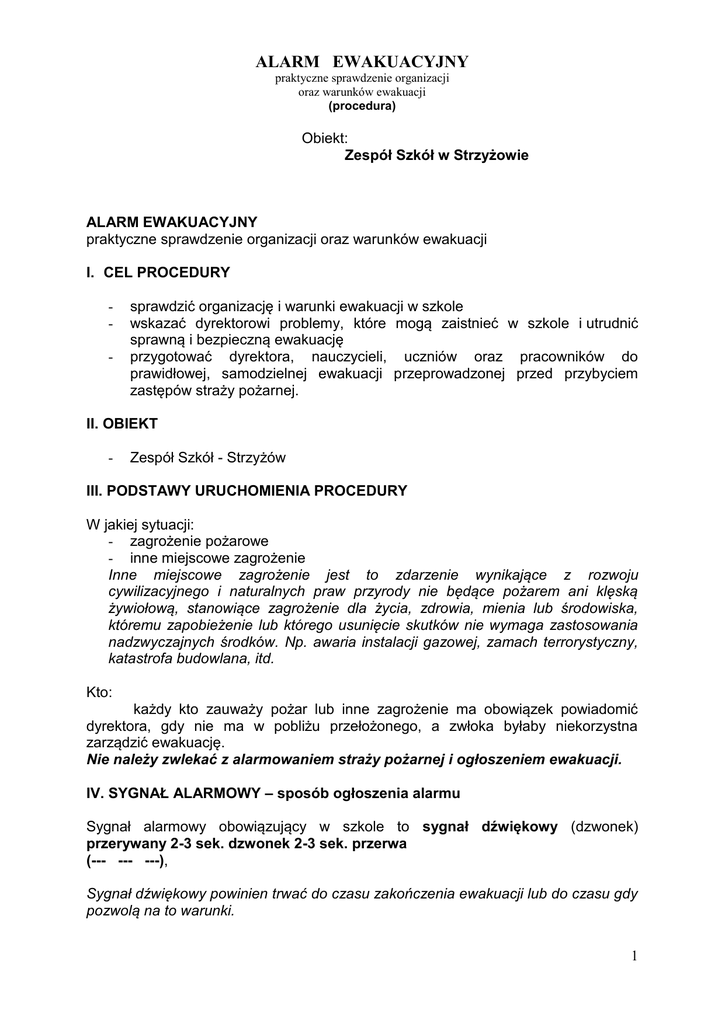 ALARM EWAKUACYJNY praktyczne sprawdzenie organizacji oraz warunków ewakuacji (procedura) Obiekt: Zespół Szkół w Strzyżowie ALARM EWAKUACYJNY praktyczne sprawdzenie organizacji oraz warunków ewakuacji I. CEL PROCEDURY - sprawdzić organizację i warunki ewakuacji w szkole wskazać dyrektorowi problemy, które mogą zaistnieć w szkole i utrudnić sprawną i bezpieczną ewakuację przygotować dyrektora, nauczycieli, uczniów oraz pracowników do prawidłowej, samodzielnej ewakuacji przeprowadzonej przed przybyciem zastępów straży pożarnej. II. OBIEKT - Zespół Szkół - Strzyżów III. PODSTAWY URUCHOMIENIA PROCEDURY W jakiej sytuacji: - zagrożenie pożarowe - inne miejscowe zagrożenie Inne miejscowe zagrożenie jest to zdarzenie wynikające z rozwoju cywilizacyjnego i naturalnych praw przyrody nie będące pożarem ani klęską żywiołową, stanowiące zagrożenie dla życia, zdrowia, mienia lub środowiska, któremu zapobieżenie lub którego usunięcie skutków nie wymaga zastosowania nadzwyczajnych środków. Np. awaria instalacji gazowej, zamach terrorystyczny, katastrofa budowlana, itd. Kto: każdy kto zauważy pożar lub inne zagrożenie ma obowiązek powiadomić dyrektora, gdy nie ma w pobliżu przełożonego, a zwłoka byłaby niekorzystna zarządzić ewakuację. Nie należy zwlekać z alarmowaniem straży pożarnej i ogłoszeniem ewakuacji. IV. SYGNAŁ ALARMOWY – sposób ogłoszenia alarmu Sygnał alarmowy obowiązujący w szkole to sygnał dźwiękowy (dzwonek) przerywany 2-3 sek. dzwonek 2-3 sek. przerwa (--- --- ---), Sygnał dźwiękowy powinien trwać do czasu zakończenia ewakuacji lub do czasu gdy pozwolą na to warunki. 1 Włącznik dzwonka znajduje się w budynku A W przypadku awarii bądź braku energii elektrycznej alarm ogłaszany jest poprzez gońców zapowiedzią słowną: Uwaga! Uwaga! Ogłaszam alarm ewakuacyjny szkoły. V. MIEJSCA DO EWAKUACJI Wyznacza się na miejsce zbiórki: - I etap ewakuacji – boisko szkolne, - II etap ewakuacji – VI. PRZYDZIAŁ OBOWIĄZKÓW Konserwator lub osoba zastępująca: - sprawdza czy wszystkie wyjścia ewakuacyjne są otwarte, jeżeli nie to natychmiast je otwiera, - wyłącza dopływ prądu, przeciwpożarowy wyłącznik prądu znajduje się przy głównym wejściu z prawej strony. - wykonuje inne czynności zlecone przez dyrektora. Dyrektor: - powiadamia służby ratunkowe wg. ustalonej kolejności, - podejmuje decyzję o ewakuacji, - organizuje akcję ratowniczą, - sprawdza stan uczniów, nauczycieli i pracowników administracyjnych, - współdziała ze służbami ratowniczymi, - w czasie ćwiczeń zapewnia obecność personelu medycznego. Wychowawcy klas, nauczyciele: - nakazują opuszczenie budynku uczniom, - nadzorują przebieg ewakuacji, - wykonują polecenia dyrektora. VII. ZASADY PROWADZENIA EWAKUACJI Ewakuację prowadzi się w każdym przypadku poprzez wyjście z danego pomieszczenia – dalej przez pionowe i poziome drogi ewakuacyjne zgodnie z oznakowaniem kierunków ewakuacji. (ostateczna decyzja dotycząca kierunku ewakuacji należy do opiekuna grupy i zależy od zaistniałej sytuacji niekoniecznie musi pokrywać się z kierunkiem określonym przez znaki ewakuacyjne). Po zarządzeniu ewakuacji nauczyciele i pozostały personel szkoły znajdujący się w pomieszczeniach budynku ma za zadanie: - otworzyć drzwi na drogach komunikacji ogólnej i ewakuacyjne zapasowe, - wyłączyć lub zabezpieczyć urządzenia i materiały, które stwarzają zagrożenie, - kierować ewakuacją, Nauczyciele pod, których opieką przebywają uczniowie mają za zadanie zająć się jedynie tą grupą, jej ewakuacją i bezpieczeństwem. Zobowiązuje się nauczycieli do zdyscyplinowania grup z którymi prowadzą zajęcia w chwili ogłoszenia alarmu, sprawdzania obecności uczniów na początku każdej lekcji. Opuszczając sale lekcyjne nie zabieramy żadnych rzeczy ze sobą, pozostawiamy drzwi do pomieszczeń zamknięte (nie na klucz), okna również powinny zostać zamknięte. Nauczyciel, opiekun grupy zabiera ze sobą dziennik lekcyjny. Po opuszczeniu obiektu nauczyciel udaje się z grupą uczniów na boisko szkolne ustawia w dwuszeregu i sprawdza obecność. Tak ustawiona grupa pozostaje na miejscu razem z nauczycielem, opiekunem do czasu wydania odpowiednich decyzji przez dyrektora (lub DAR – dowódca akcji ratowniczej). W czasie ewakuacji należy kierować się zaistniałą sytuacją przy zachowaniu poniższych zasad: - nie przeciskać się w przeciwległym kierunku do ruchu ludzi, - izolować pomieszczenia w których powstał pożar od pozostałych przez zamknięcie drzwi, - w pierwszej kolejności ewakuować osoby z tych pomieszczeń gdzie występuje realne zagrożenie dla życia i zdrowia oraz osoby niepełnosprawne, - na poszczególnych odcinkach całej drogi ewakuacji nadzorować ewakuację, - nie dopuszczać do powstania spiętrzeń, bezwładnego ruch względnie paniki, - zachować spokój i opanowanie, - łagodzić powstającą sytuację napięciowo - nerwową, - nie dopuścić do powracania pracowników i uczniów w poprzednie miejsca, - w przypadku zaginięcia osoby natychmiast zgłosić ten fakt pierwszemu napotkanemu strażakowi pytając go o nazwisko, - udzielić w razie potrzeby pierwszej pomocy przedmedycznej i lekarskiej, - podporządkować się kierującemu akcją ratowniczą, - w przypadku konieczności ratowania lub samoratowania się z zadymionego pomieszczenia należy pamiętać, że najmniejsze zadymienie występuje przy posadzce trzeba więc pełzać lub czołgać się i głowę trzymać jak najniżej, VIII. PODSTAWOWE POJĘCIA ZWIĄZANE Z EWAKUACJĄ Wyjścia ewakuacyjne w rozpatrywanym obiekcie to drzwi które prowadzą bezpośrednio na zewnątrz budynku, drogi ewakuacyjne to korytarze - łączniki między poszczególnymi segmentami oraz klatki schodowe. Poziome drogi ewakuacyjne stanowią korytarze. Pionowe drogi ewakuacyjne to schody - klatki schodowe wewnątrz obiektu szkoły. Przejście ew