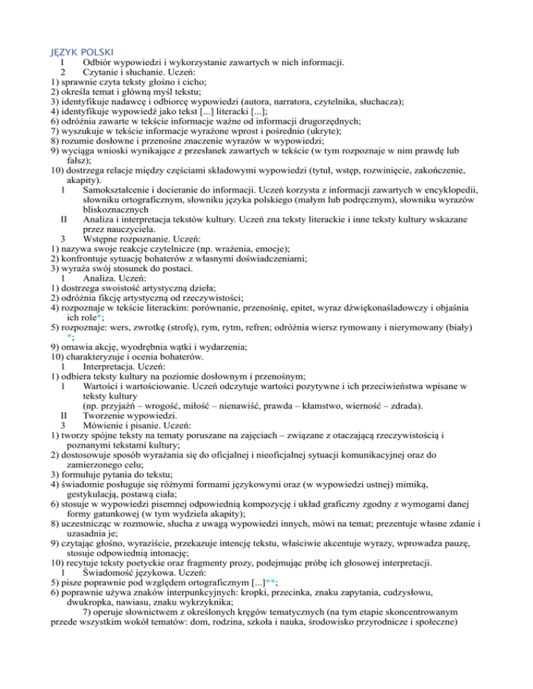 JĘZYK POLSKI I Odbiór wypowiedzi i wykorzystanie zawartych w nich informacji. 2 Czytanie i słuchanie. Uczeń: 1) sprawnie czyta teksty głośno i cicho; 2) określa temat i główną myśl tekstu; 3) identyfikuje nadawcę i odbiorcę wypowiedzi (autora, narratora, czytelnika, słuchacza); 4) identyfikuje wypowiedź jako tekst [...] literacki [...]; 6) odróżnia zawarte w tekście informacje ważne od informacji drugorzędnych; 7) wyszukuje w tekście informacje wyrażone wprost i pośrednio (ukryte); 8) rozumie dosłowne i przenośne znaczenie wyrazów w wypowiedzi; 9) wyciąga wnioski wynikające z przesłanek zawartych w tekście (w tym rozpoznaje w nim prawdę lub fałsz); 10) dostrzega relacje między częściami składowymi wypowiedzi (tytuł, wstęp, rozwinięcie, zakończenie, akapity). 1 Samokształcenie i docieranie do informacji. Uczeń korzysta z informacji zawartych w encyklopedii, słowniku ortograficznym, słowniku języka polskiego (małym lub podręcznym), słowniku wyrazów bliskoznacznych II Analiza i interpretacja tekstów kultury. Uczeń zna teksty literackie i inne teksty kultury wskazane przez nauczyciela. 3 Wstępne rozpoznanie. Uczeń: 1) nazywa swoje reakcje czytelnicze (np. wrażenia, emocje); 2) konfrontuje sytuację bohaterów z własnymi doświadczeniami; 3) wyraża swój stosunek do postaci. 1 Analiza. Uczeń: 1) dostrzega swoistość artystyczną dzieła; 2) odróżnia fikcję artystyczną od rzeczywistości; 4) rozpoznaje w tekście literackim: porównanie, przenośnię, epitet, wyraz dźwiękonaśladowczy i objaśnia ich role*; 5) rozpoznaje: wers, zwrotkę (strofę), rym, rytm, refren; odróżnia wiersz rymowany i nierymowany (biały) *; 9) omawia akcję, wyodrębnia wątki i wydarzenia; 10) charakteryzuje i ocenia bohaterów. 1 Interpretacja. Uczeń: 1) odbiera teksty kultury na poziomie dosłownym i przenośnym; 1 Wartości i wartościowanie. Uczeń odczytuje wartości pozytywne i ich przeciwieństwa wpisane w teksty kultury (np. przyjaźń – wrogość, miłość – nienawiść, prawda – kłamstwo, wierność – zdrada). II Tworzenie wypowiedzi. 3 Mówienie i pisanie. Uczeń: 1) tworzy spójne teksty na tematy poruszane na zajęciach – związane z otaczającą rzeczywistością i poznanymi tekstami kultury; 2) dostosowuje sposób wyrażania się do oficjalnej i nieoficjalnej sytuacji komunikacyjnej oraz do zamierzonego celu; 3) formułuje pytania do tekstu; 4) świadomie posługuje się różnymi formami językowymi oraz (w wypowiedzi ustnej) mimiką, gestykulacją, postawą ciała; 6) stosuje w wypowiedzi pisemnej odpowiednią kompozycję i układ graficzny zgodny z wymogami danej formy gatunkowej (w tym wydziela akapity); 8) uczestnicząc w rozmowie, słucha z uwagą wypowiedzi innych, mówi na temat; prezentuje własne zdanie i uzasadnia je; 9) czytając głośno, wyraziście, przekazuje intencję tekstu, właściwie akcentuje wyrazy, wprowadza pauzę, stosuje odpowiednią intonację; 10) recytuje teksty poetyckie oraz fragmenty prozy, podejmując próbę ich głosowej interpretacji. 1 Świadomość językowa. Uczeń: 5) pisze poprawnie pod względem ortograficznym [...]**; 6) poprawnie używa znaków interpunkcyjnych: kropki, przecinka, znaku zapytania, cudzysłowu, dwukropka, nawiasu, znaku wykrzyknika; 7) operuje słownictwem z określonych kręgów tematycznych (na tym etapie skoncentrowanym przede wszystkim wokół tematów: dom, rodzina, szkoła i nauka, środowisko przyrodnicze i społeczne) * W klasie IV zostały wprowadzone wszystkie pojęcia z wyjątkiem przenośni i wiersza nierymowanego (kl. V), co zostało zaznaczone w tabelach. W VI klasie, gdy wprowadzone zostały wszystkie pojęcia z podstawy, umiejętność ich rozpoznania w tekstach literackich będzie kształcona w każdym bloku. ** Nawyk dbałości o poprawność ortograficzną powinien być kształcony na każdej lekcji, w tabeli podano tylko szczegółowe informacje dotyczące konkretnych reguł MATEMATYKA 1 W zakresie sprawności rachunkowej uczeń: • wykonuje proste działania pamięciowe na liczbach naturalnych, • zna i stosuje algorytmy działań pisemnych (oprócz dzielenia) oraz wykorzystuje te umiejętności w sytuacjach praktycznych, • wykonuje dzielenie z resztą liczb naturalnych, • stosuje wygodne dla niego sposoby ułatwiające obliczenia, w tym przemienność i łączność dodawania i mnożenia, • rozpoznaje liczby naturalne podzielne przez 2, 3, 5, 9, 10, • oblicza kwadraty i sześciany liczb naturalnych, • dodaje i odejmuje ułamki zwykłe o jednakowych mianownikach, • dodaje i odejmuje ułamki dziesiętne (w prostych przykładach), • stosuje reguły dotyczące kolejności wykonywania działań, • szacuje wyniki działań, • interpretuje liczby naturalne na osi liczbowej, • porównuje liczby naturalne, • mnoży ułamki zwykłe przez liczby naturalne, • wykonuje obliczenia związane z czasem oraz jednostkami masy i pieniędzy, • dokonuje prawidłowego wyboru modelu matematycznego w celu rozwiązania zadania tekstowego (na poziomie elementarnym). 1 W zakresie wykorzystania i tworzenia informacji uczeń: • interpretuje i przetwarza informacje tekstowe, liczbowe, graficzne, w tabelach i na diagramach, • rozumie i interpretuje odpowiednie pojęcia matematyczne, • zna podstawową terminologię, • formułuje odpowiedzi i prawidłowo zapisuje wyniki. 1 W zakresie modelowania matematycznego uczeń: • dobiera odpowiedni model matematyczny do nieskomplikowanej sytuacji, • korzysta z prostych wzorów, w których występują oznaczenia literowe, zamienia wzór na formę słowną, • oblicza pola kwadratów i prostokątów przedstawionych na rysunkach oraz w sytuacjach praktycznych, • stosuje jednostki długości i ich zamianę, • przetwarza tekst zadania na działania arytmetyczne. 1 W zakresie kształcenia wyobraźni geometrycznej uczeń: • sprawnie posługuje się przyrządami matematycznymi, wykonując rysunki, 