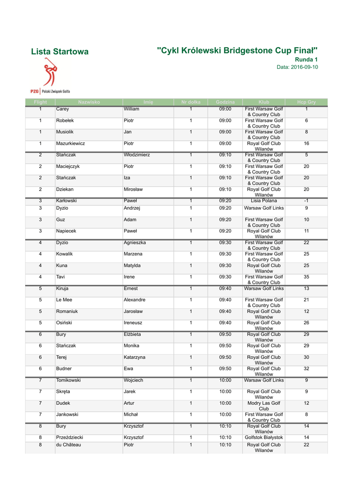 ''Cykl Królewski Bridgestone Cup Finał'' Lista Startowa Runda 1 Data: 2016-09-10 Flight 1 Nazwisko Imię Nr dołka 1 Godzina 09:00 Hcp Gry 1 09:20 Klub First Warsaw Golf & Country Club First Warsaw Golf & Country Club First Warsaw Golf & Country Club Royal Golf Club Wilanów First Warsaw Golf & Country Club First Warsaw Golf & Country Club First Warsaw Golf & Country Club Royal Golf Club Wilanów Lisia Polana Piotr 1 09:00 Musiolik Jan 1 09:00 1 Mazurkiewicz Piotr 1 09:00 2 Stańczak Włodzimierz 1 09:10 2 Maciejczyk Piotr 1 09:10 2 Stańczak Iza 1 09:10 2 Dziekan Mirosław 1 09:10 3 Karłowski Paweł 1 3 Dyzio Andrzej 1 09:20 Warsaw Golf Links 9 3 Guz Adam 1 09:20 10 Paweł 1 09:20 Dyzio Agnieszka 1 09:30 4 Kowalik Marzena 1 09:30 4 Kuna Matylda 1 09:30 4 Tavi Irene 1 09:30 5 Kiruja Ernest 1 09:40 First Warsaw Golf & Country Club Royal Golf Club Wilanów First Warsaw Golf & Country Club First Warsaw Golf & Country Club Royal Golf Club Wilanów First Warsaw Golf & Country Club Warsaw Golf Links 3 Napiecek 4 5 Le Mee Alexandre 1 09:40 21 5 Romaniuk Jarosław 1 09:40 5 Osiński Ireneusz 1 09:40 6 Bury Elżbieta 1 09:50 6 Stańczak Monika 1 09:50 6 Terej Katarzyna 1 09:50 6 Budner Ewa 1 09:50 7 Tomikowski Wojciech 1 10:00 First Warsaw Golf & Country Club Royal Golf Club Wilanów Royal Golf Club Wilanów Royal Golf Club Wilanów Royal Golf Club Wilanów Royal Golf Club Wilanów Royal Golf Club Wilanów Warsaw Golf Links 7 Skręta Jarek 1 10:00 9 7 Dudek Artur 1 10:00 7 Jankowski Michał 1 10:00 8 Bury Krzysztof 1 10:10 8 Przeździecki Krzysztof 1 10:10 Royal Golf Club Wilanów Modry Las Golf Club First Warsaw Golf & Country Club Royal Golf Club Wilanów Golfstok Białystok 8 du Château Piotr 1 10:10 Carey William 1 Robełek 1 Royal Golf Club Wilanów 6 8 16 5 20 20 20 -1 11 22 25 25 35 13 12 26 29 29 30 32 9 12 8 14 14 22 8 Przybylski Paweł 1 10:10 14 10:20 First Warsaw Golf & Country Club First Warsaw Golf & Country Club Olympic Golf Club 9 Tavi Nimrod 1 10:20 9 Leonardi Grzegorz 1 9 Szyszak Jerzy 1 10:20 Olympic Golf Club 9 Budner Marek 22 1 10:20 25 Andrzej 1 10:30 Royal Golf Club Wilanów Golf Park Józefów 10 Macygon 10 Dudek Franciszek 1 10:30 12 Bąk Wiktor 1 10:30 10 Wudarczyk Marek 1 10:30 11 Sarnecki Artur 1 10:40 11 Kopczewski Michał 1 10:40 11 Kondej Jerzy 1 10:40 11 Kopczewska Kasia 1 10:40 12 Miszczak Wojciech 1 10:50 12 Maciąga Rafał 1 10:50 First Warsaw Golf & Country Club Binowo Park Golf Club First Warsaw Golf & Country Club Royal Golf Club Wilanów Royal Golf Club Wilanów Royal Golf Club Wilanów Royal Golf Club Wilanów First Warsaw Golf & Country Club Olympic Golf Club 10 12 Okrasa Dariusz 1 10:50 28 12 Safianowski Marek 1 10:50 Royal Golf Club Wilanów Klub Golfowy First Warsaw Golf & Country Club 13 Sklar Bob 1 11:00 13 Grzesiak Witold 1 11:00 Warsaw Golf Links 8 13 Hyland Timothy 1 11:00 9 13 Zabielski Krzysztof 1 11:00 14 Radziszewski Jan 1 11:10 14 Szczypa Grzegorz 1 11:10 14 Iwaniuk Franciszek 1 11:10 14 Moreń Robert 1 11:10 15 Brzozowski Cezary 1 11:20 15 Tavi Theo 1 11:20 15 Lenard Piotr 1 11:20 16 Jędraszak-Utrera Lucyna 1 11:30 16 Wygonowska Bozena 1 11:30 16 Ziółkowska Barbara 1 11:30 First Warsaw Golf & Country Club First Warsaw Golf & Country Club Royal Golf Club Wilanów Royal Golf Club Wilanów Royal Golf Club Wilanów Royal Golf Club Wilanów Sobienie Królewskie Golf & Country Club First Warsaw Golf & Country Club Royal Golf Club Wilanów Royal Golf Club Wilanów First Warsaw Golf & Country Club Royal Golf Club Wilanów 18 16 17 19 20 20 26 28 50 26 27 28 -1 9 28 30 30 31 32 25 34 24 33 38